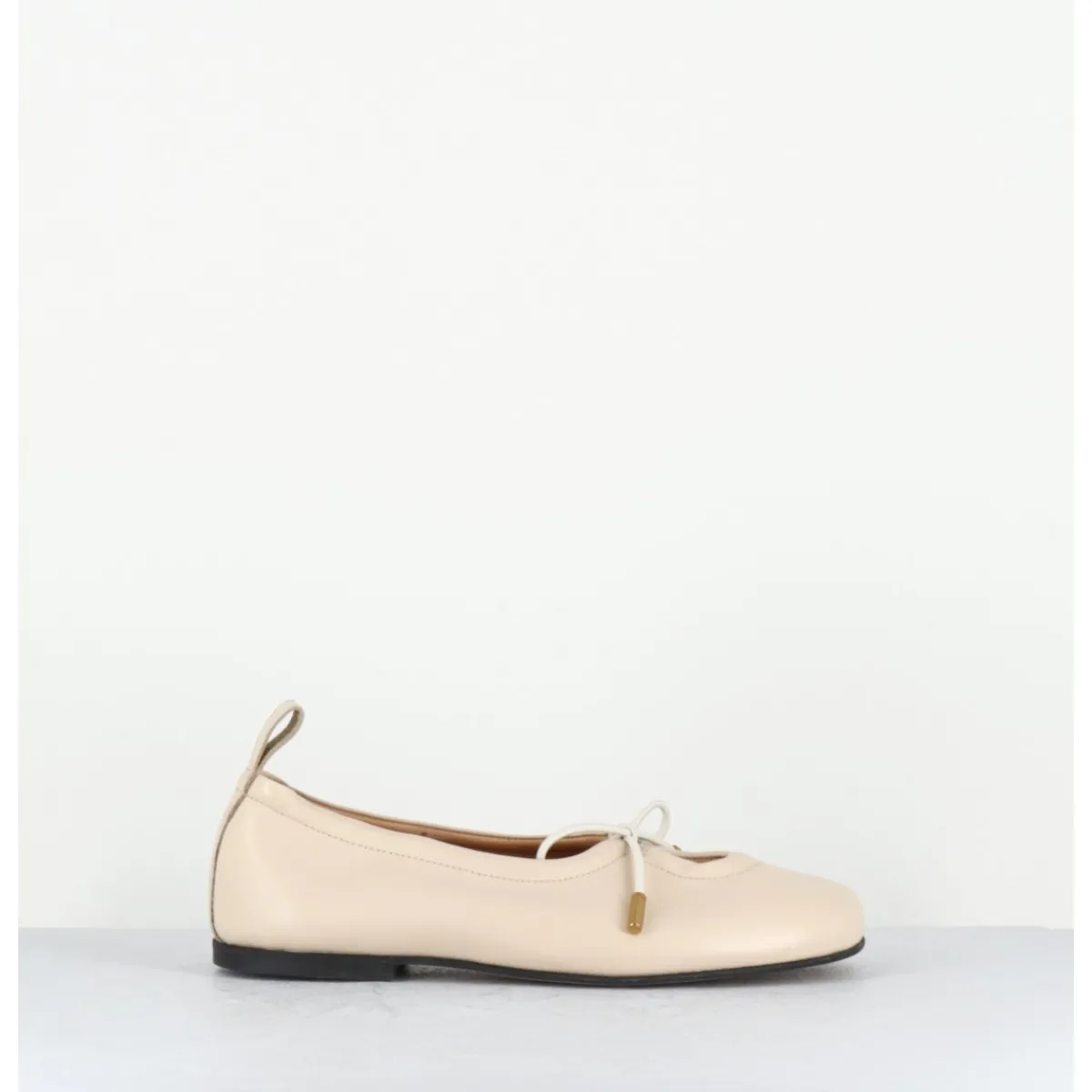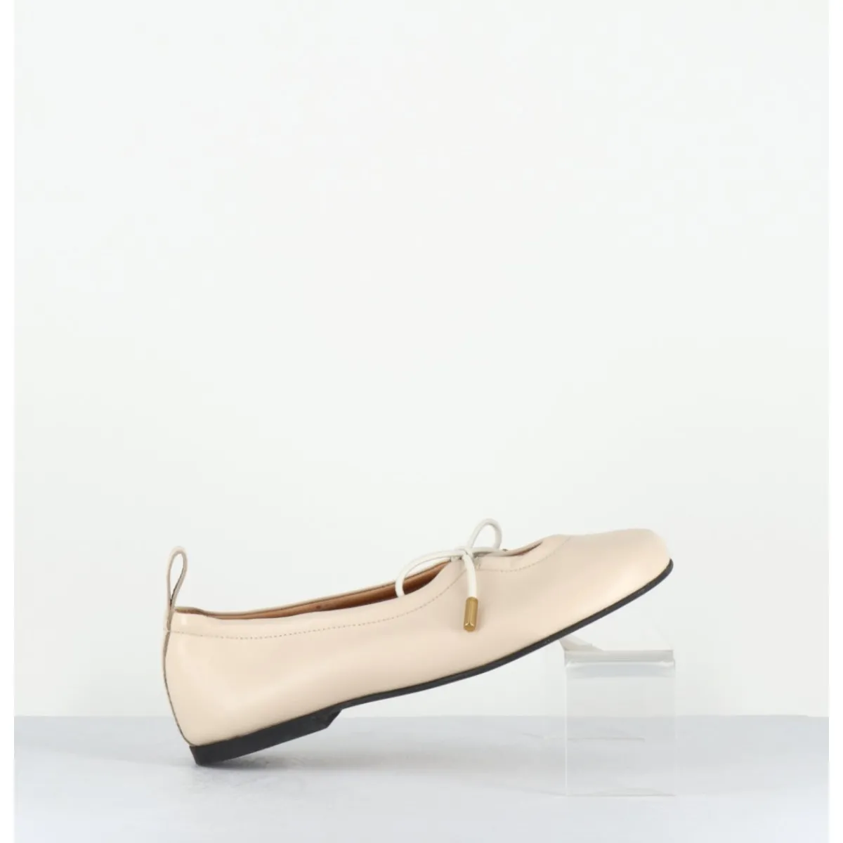 Ballerines plates en cuir beige crème, petit noeud élastique avec finitions dorées réglable à l’avant, bout carré arrondi