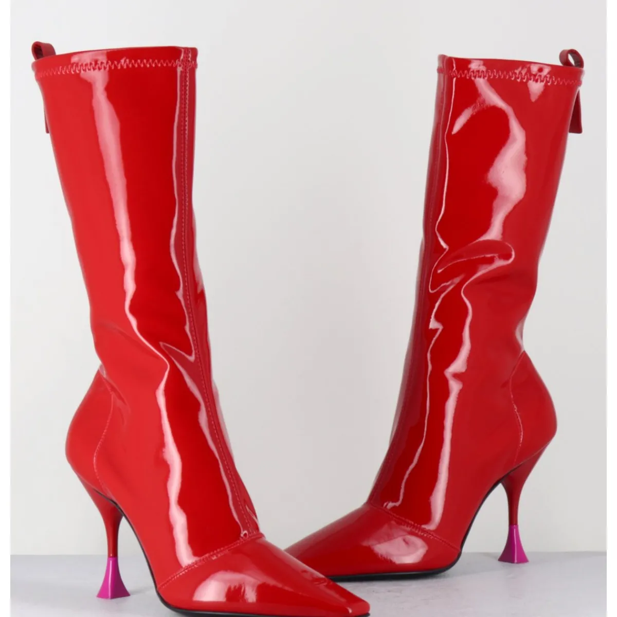 Boots en stretch vernis rouge galbantes, bout effilé à pointe carrée esprit 90s, zip intérieur, montées sur un talon haut fin stylisé avec détail rose fuchsia