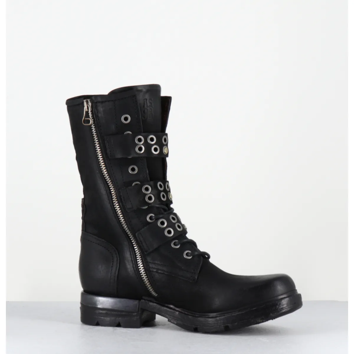 Boots rangers à lacets en cuir gras noir avec sangles cloutées esprit rock à boucles réglables