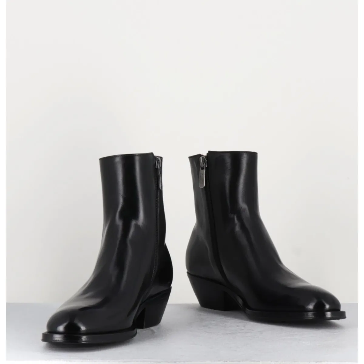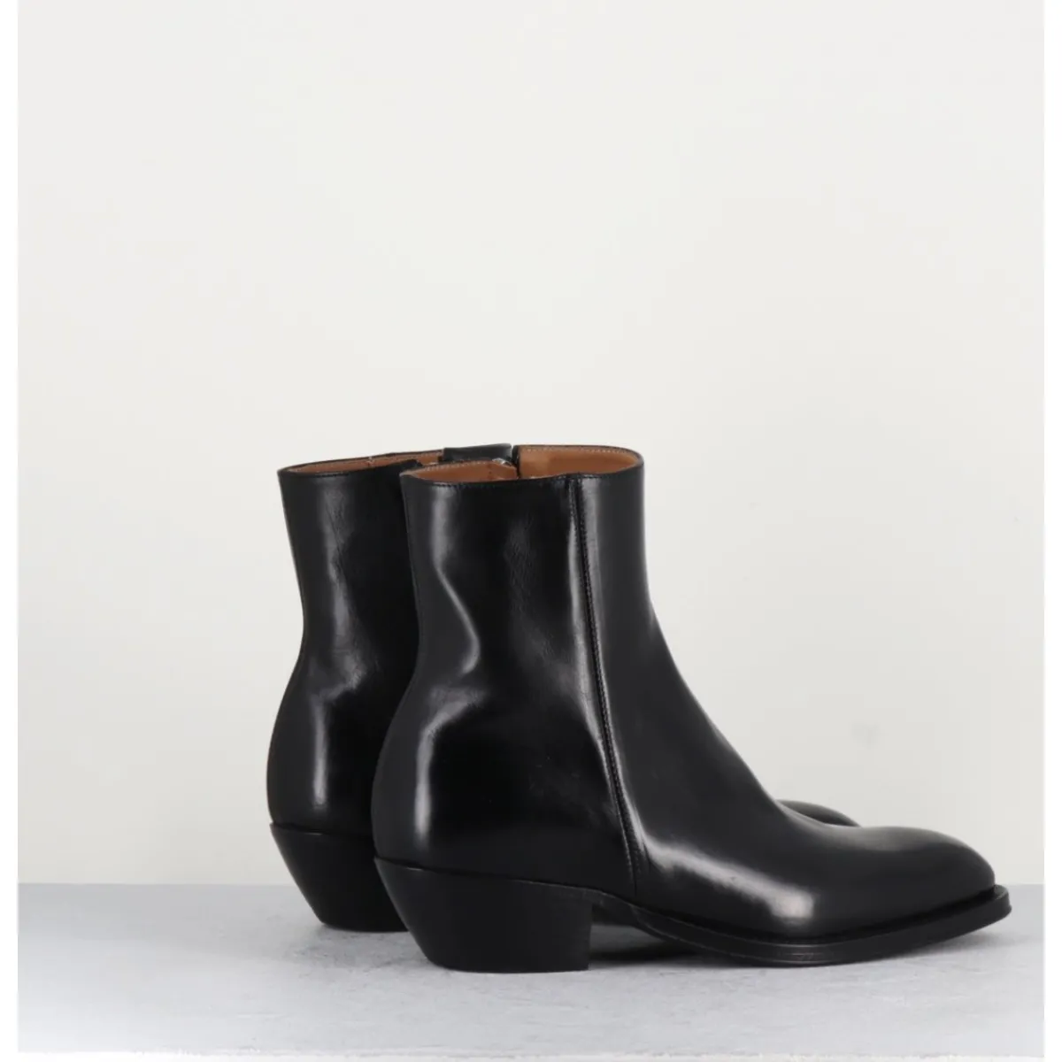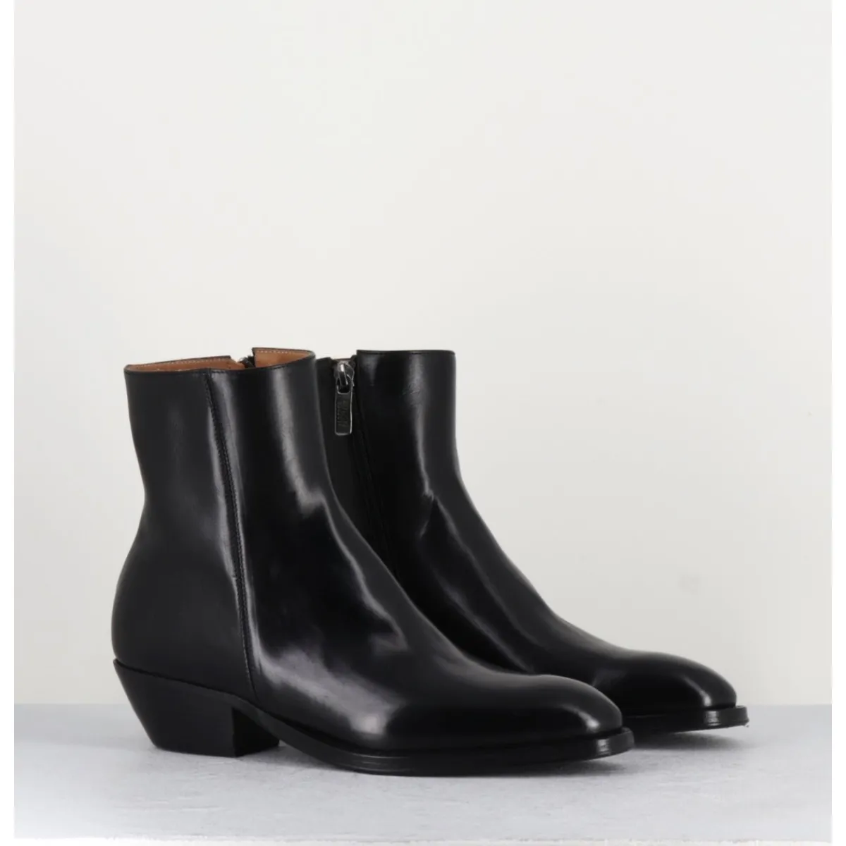 Bottines esprit santiags en cuir noir extrêmement souple, zip intérieur, bout effilé sobre, montées sur une semelle en cuir et gomme cousue main & un talon biseauté.