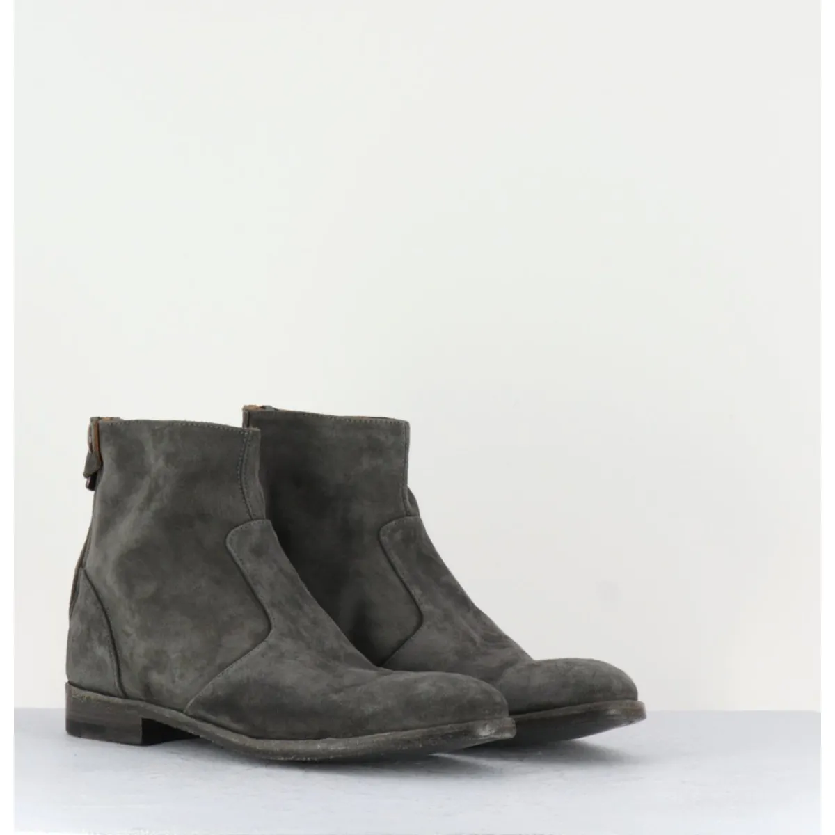 Bottines plates en daim gris ultra souple. Fabrication artisanale.
