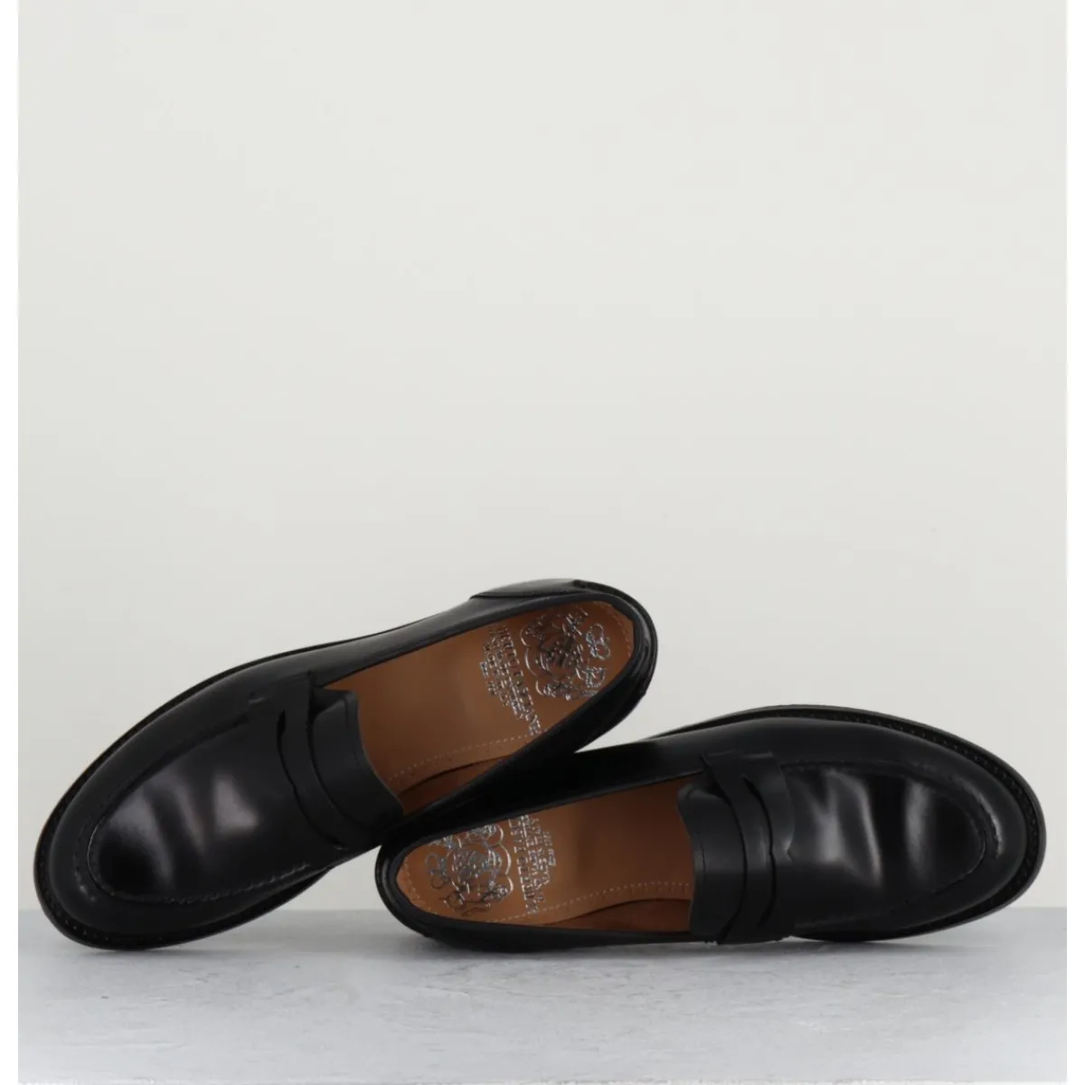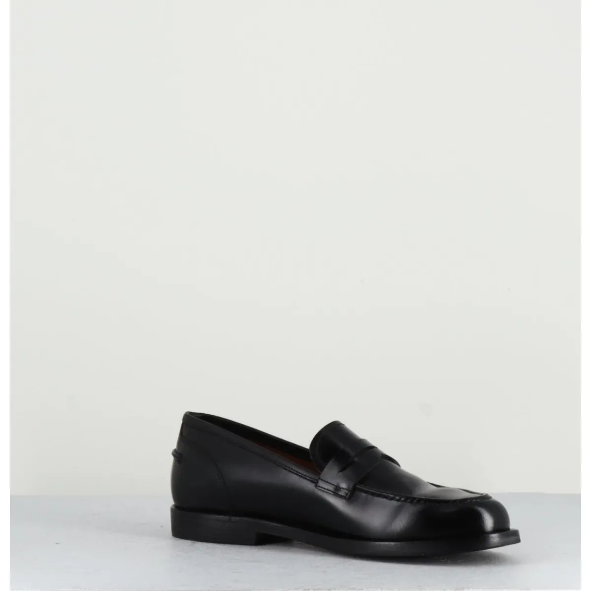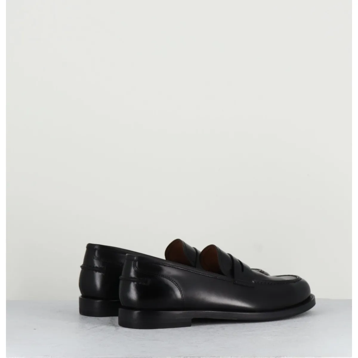 Mocassins en cuir noir légèrement glacé, montés sur une semelle en cuir et gomme cousue main.