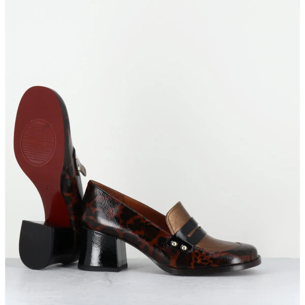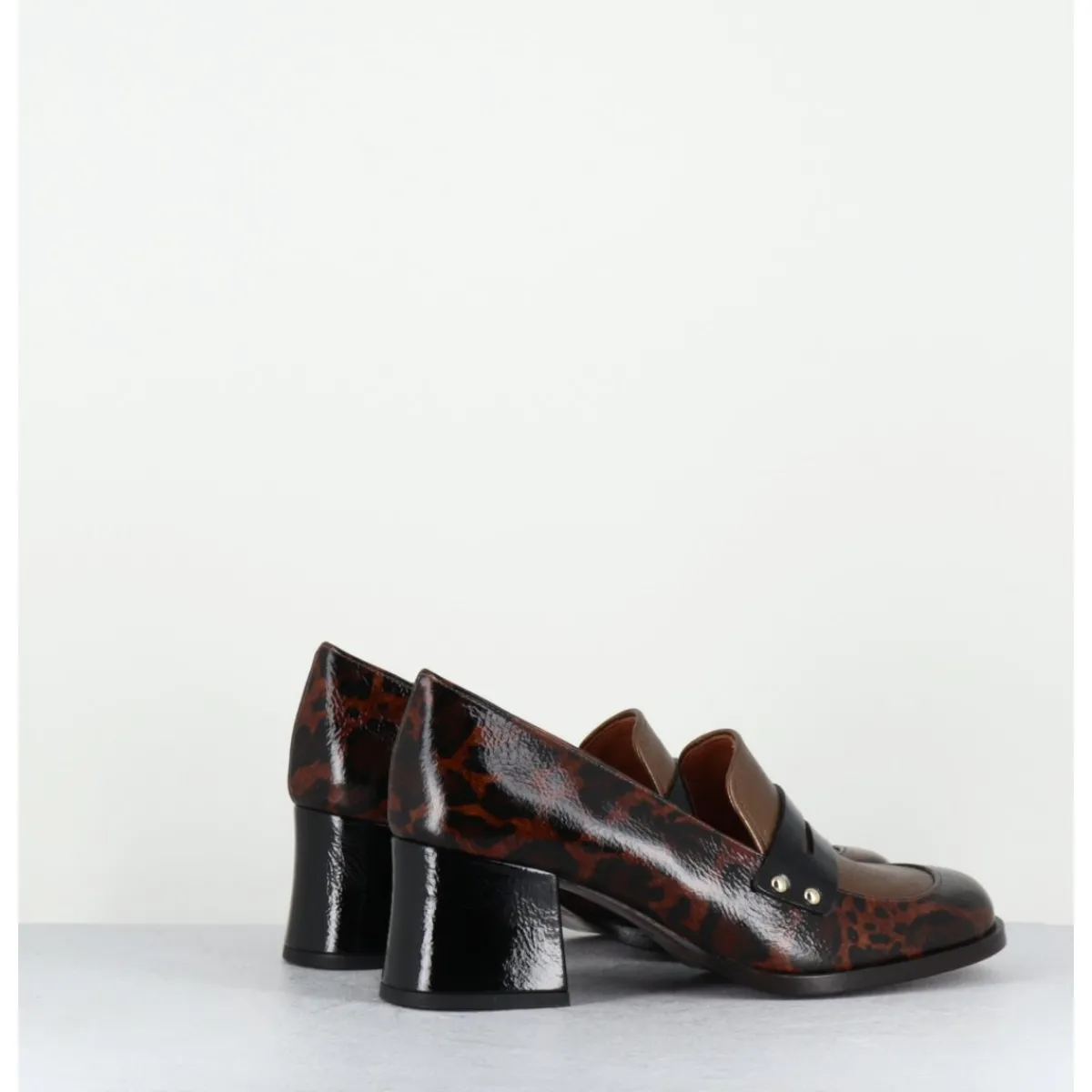 Chaussures mocassins en cuir imprimé leopard avec l’avant empeigne métallisée bronze, bout carré arrondi, montées sur un petit talon rétro légèrement évasé recouvert de cuir noir
