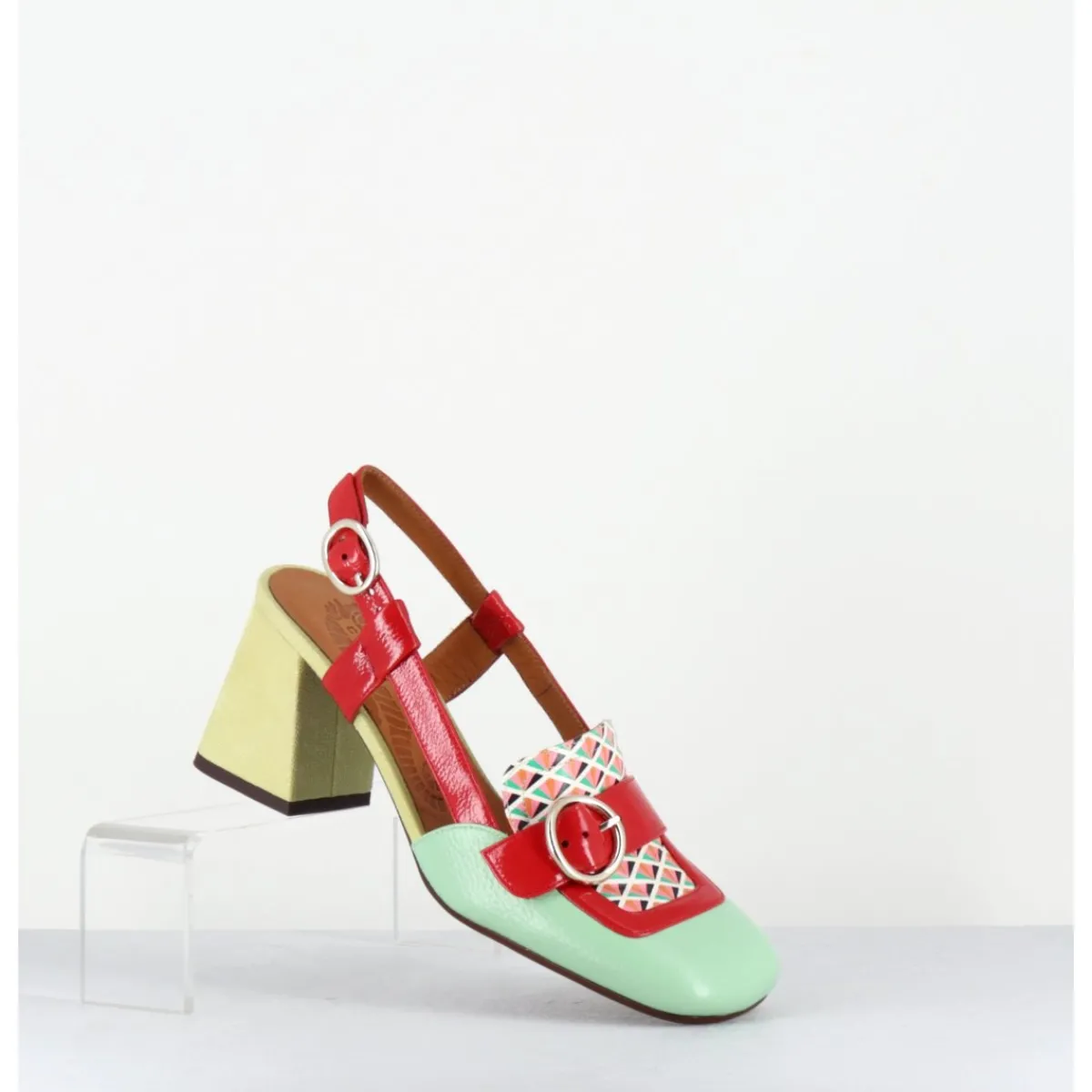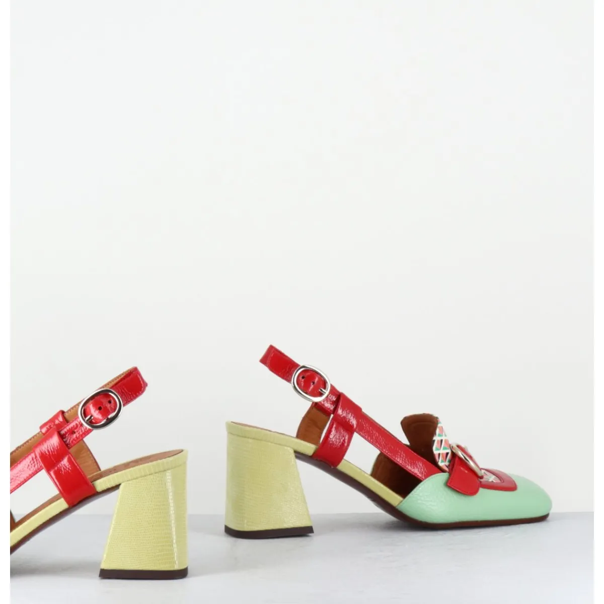 Mocassins slingback esprit 70s en cuir vernis vert, motifs rétro à l’avant & petite boucle géométrique, bride arrière réglable rouge, montés sur un talon légèrement évasé vernis jaune
