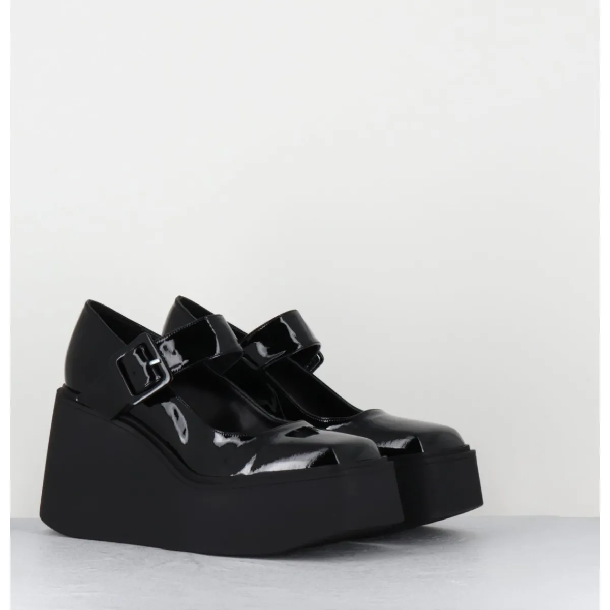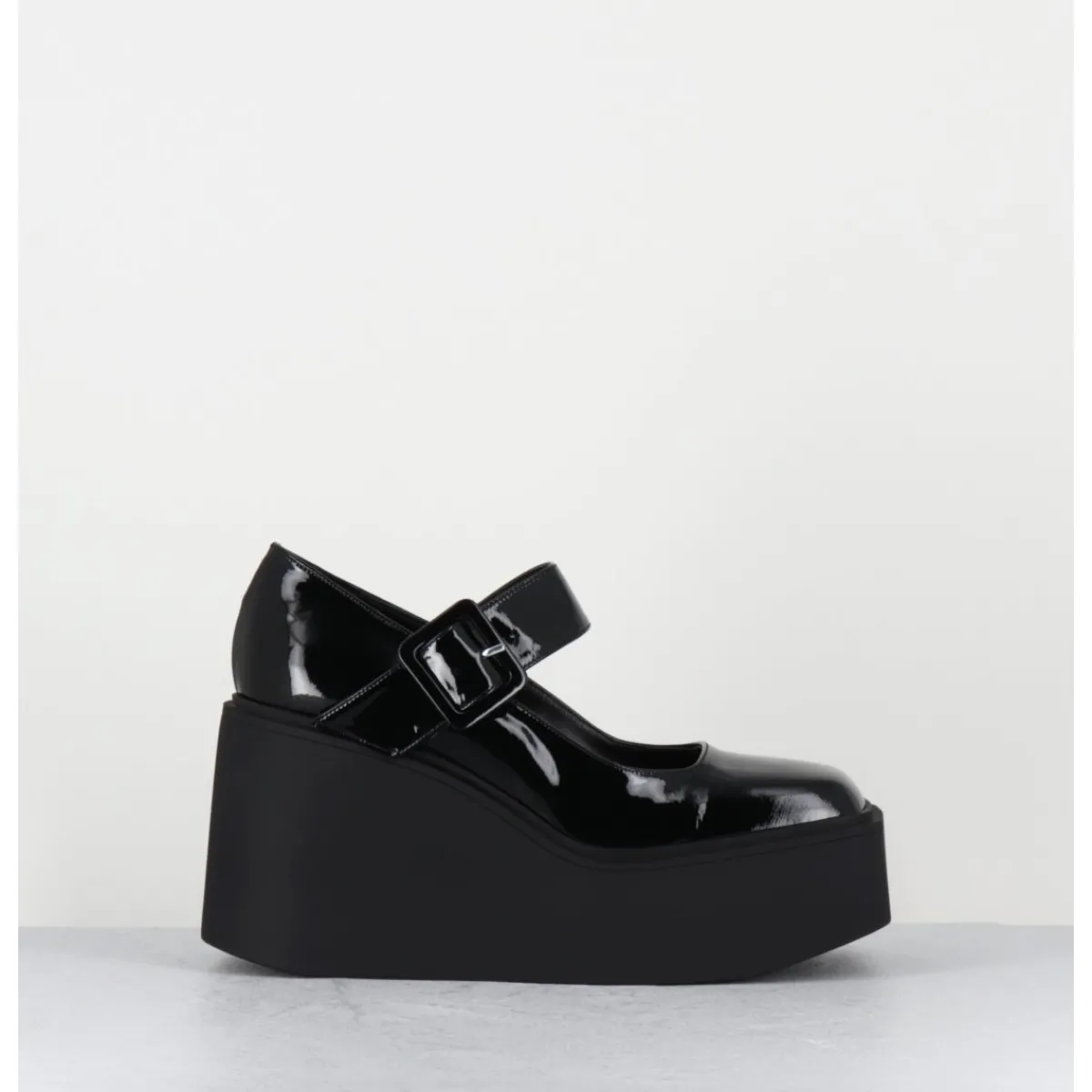 Babies compensées en cuir vernis noir, forme inspirée des Mary-Jane japonaises des années 90, montées sur une plateforme structurée en gomme noire