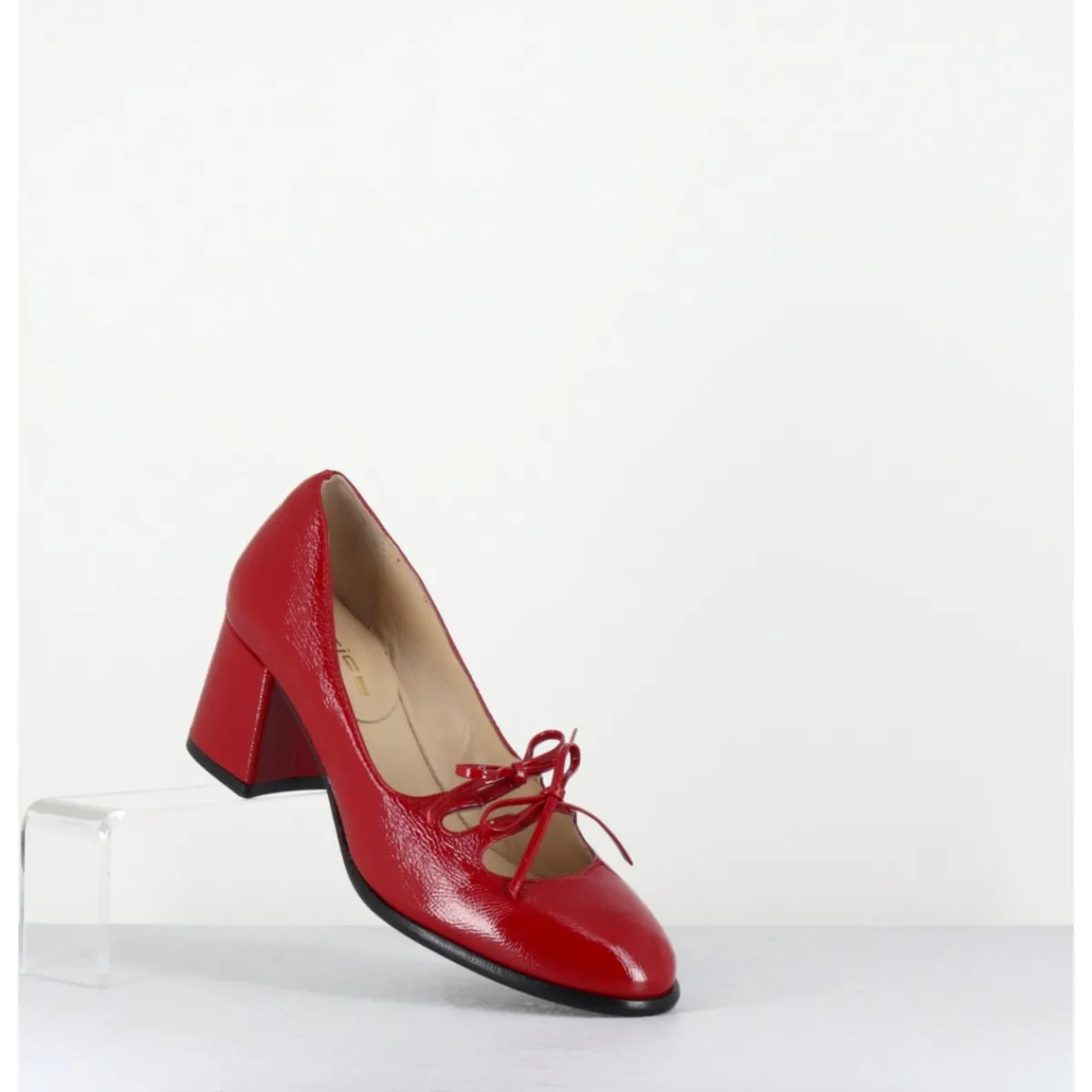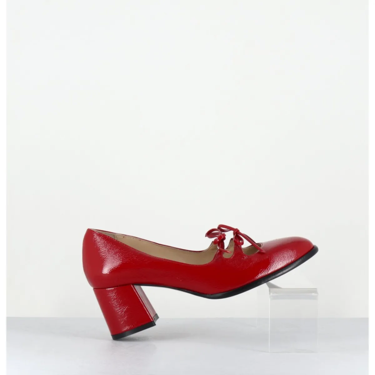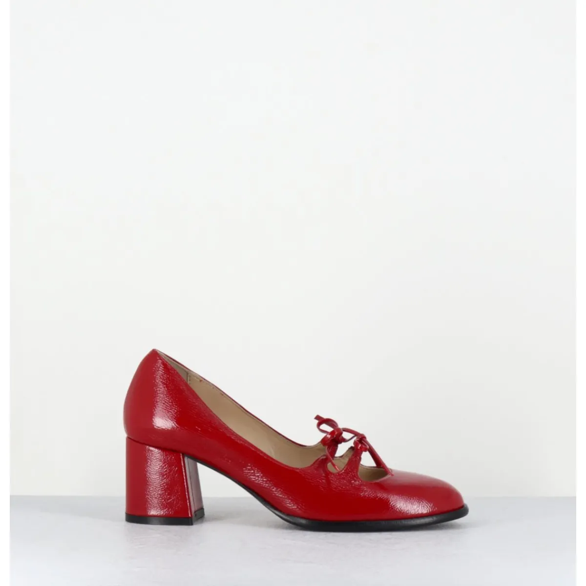 Babies à talon en cuir naplak rouge avec petits noeuds décoratifs cousus sur des élastiques de confort invisibles, bout en amande, montées sur un talon bloc