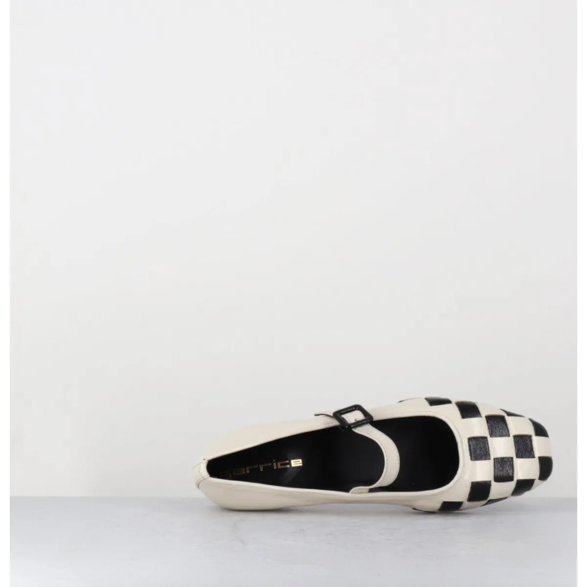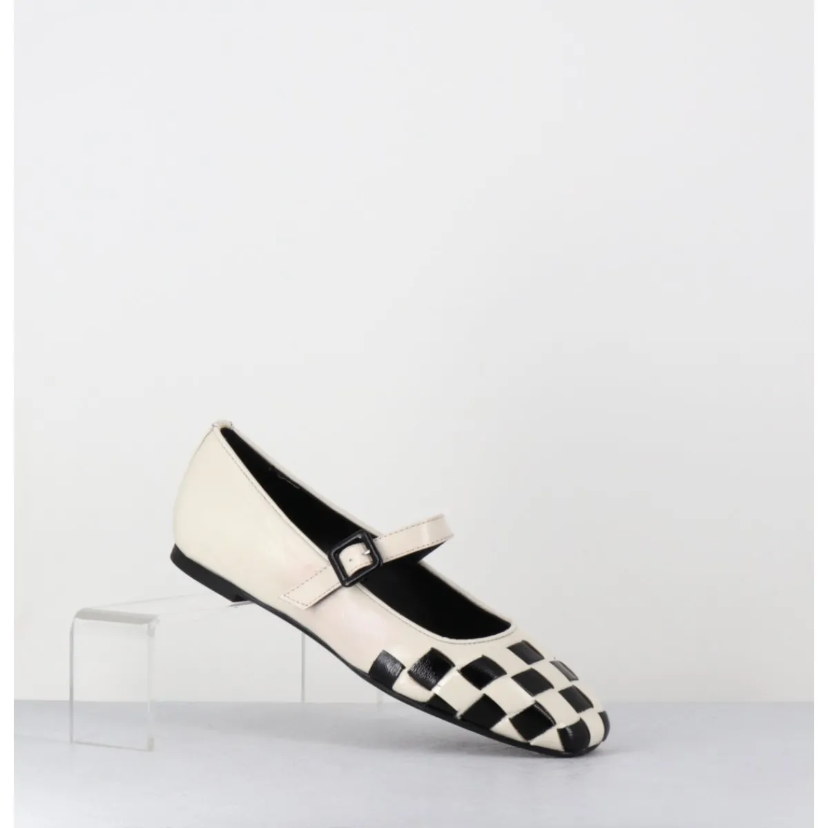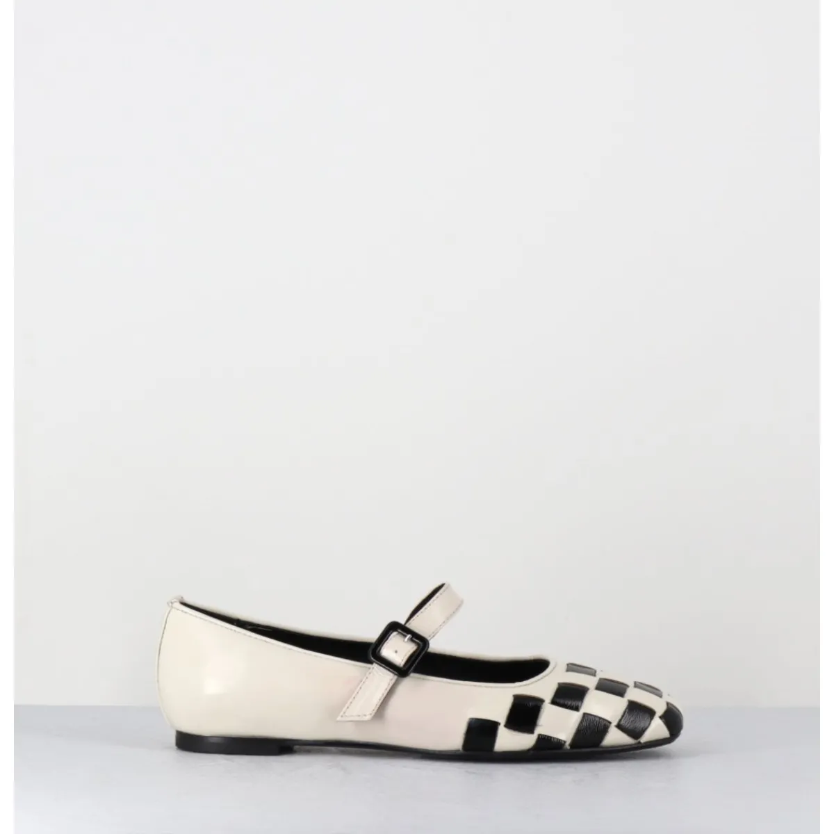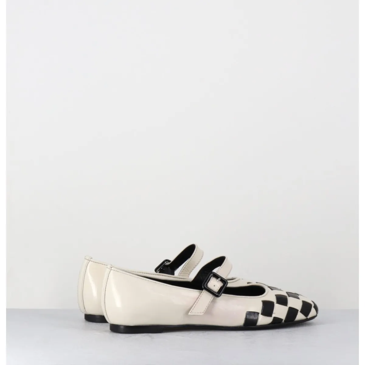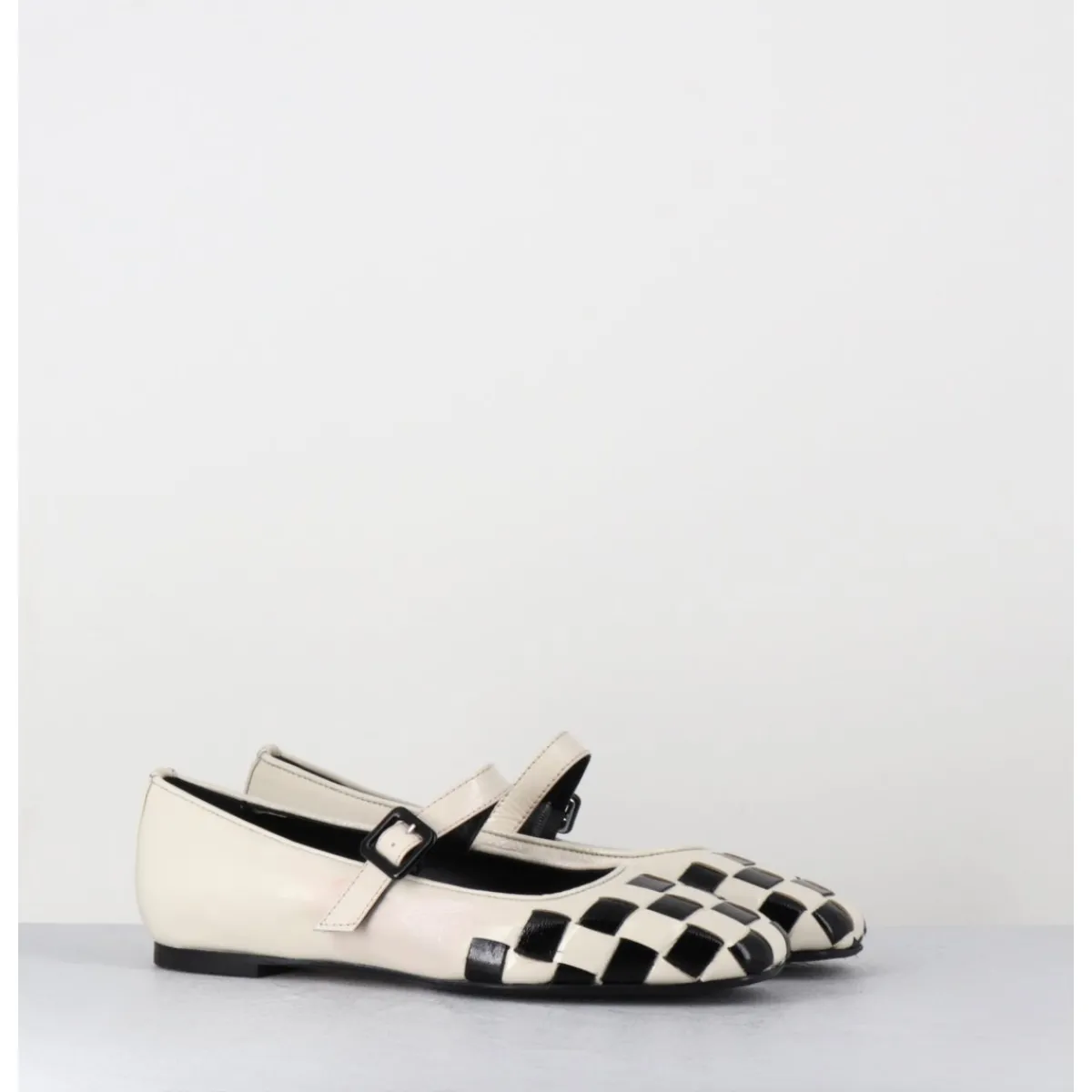 Ballerines à bride en cuir souple légèrement brillant blanc cassé et noir, présentant à l’avant des lamelles de cuir entremêlés créant un effet damier