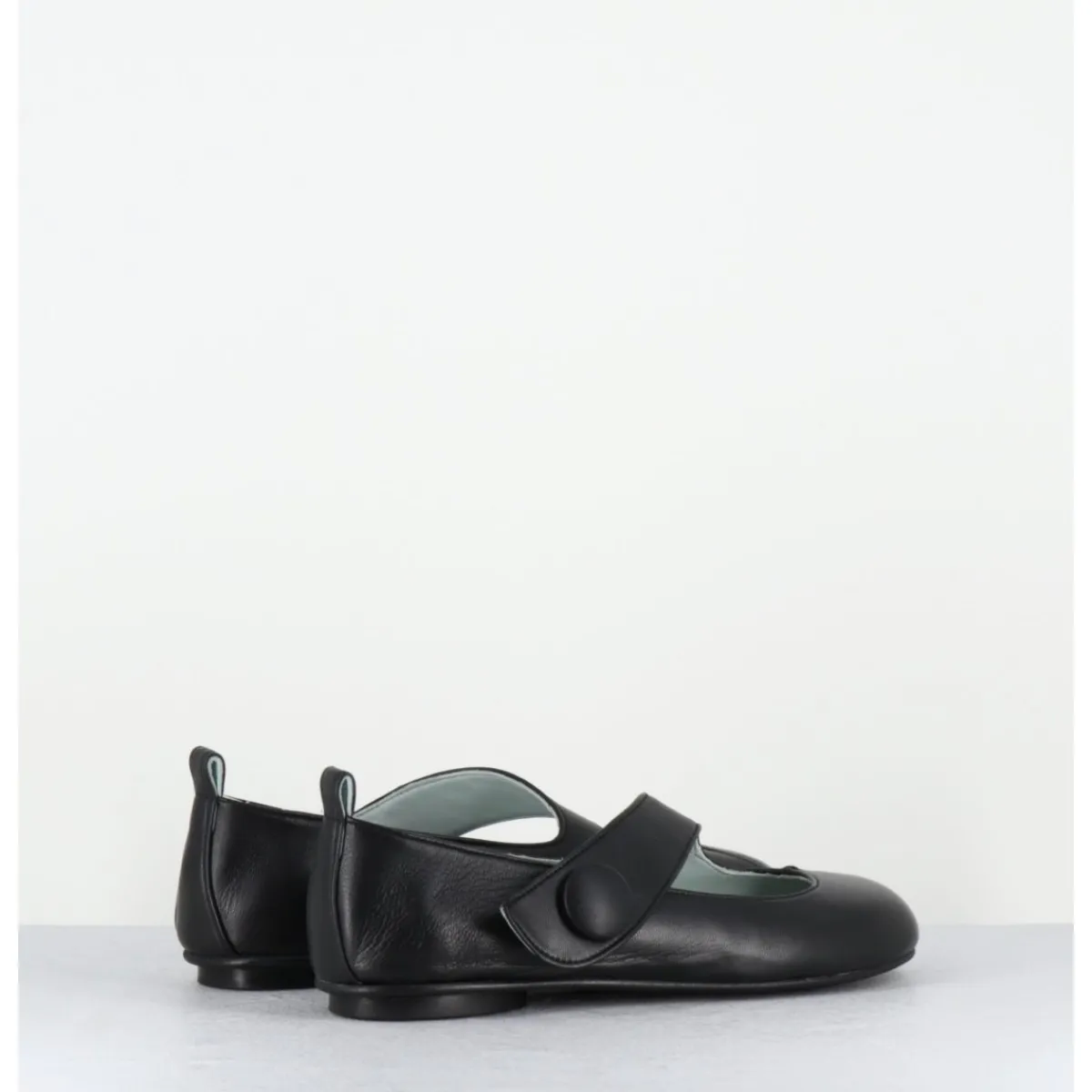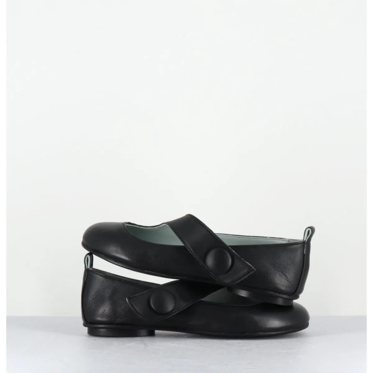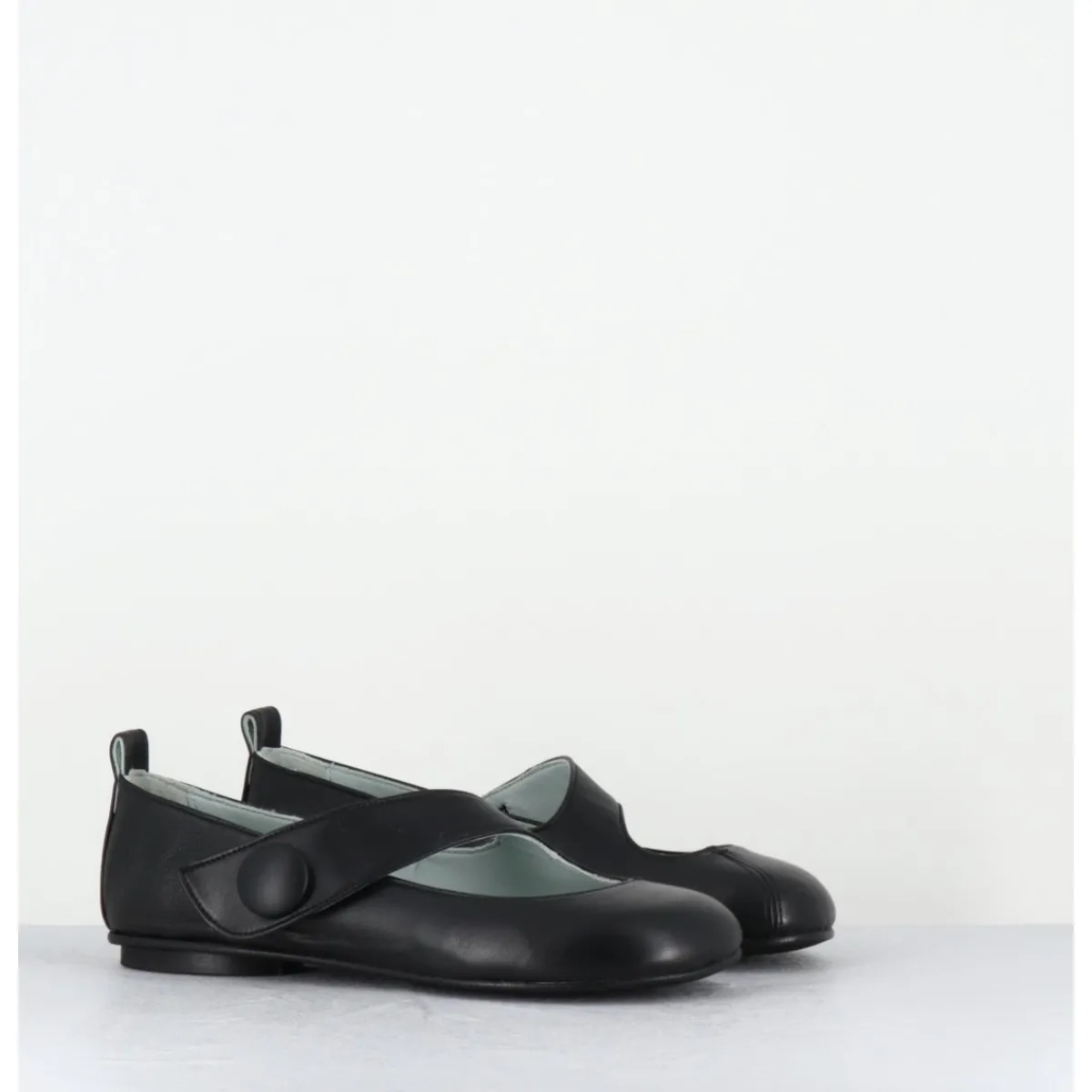 Ballerines ligne avant-gardiste japonisante à bout rond, bride asymétrique ornée d’un large bouton, découpe échancrée à l’avant, réalisées dans un cuir noir extrêmement souple, semelle intérieure molletonnée à mémoire de forme, semelle extérieure cousue construction sacchetto flexible avec talonnette ronde en gomme. D’un grand confort.