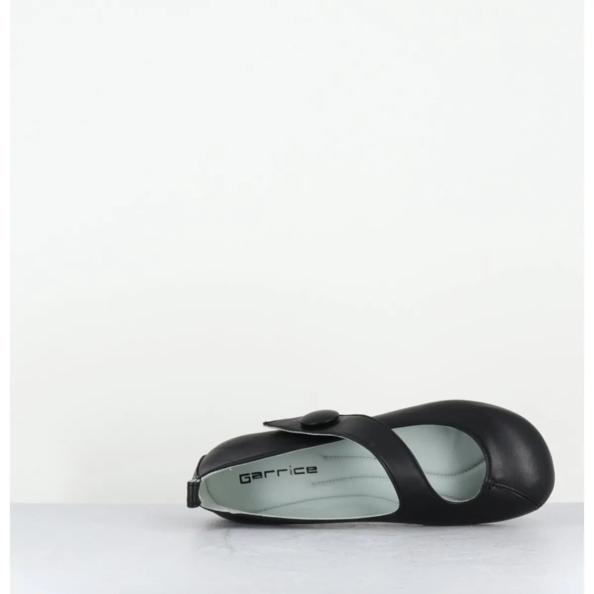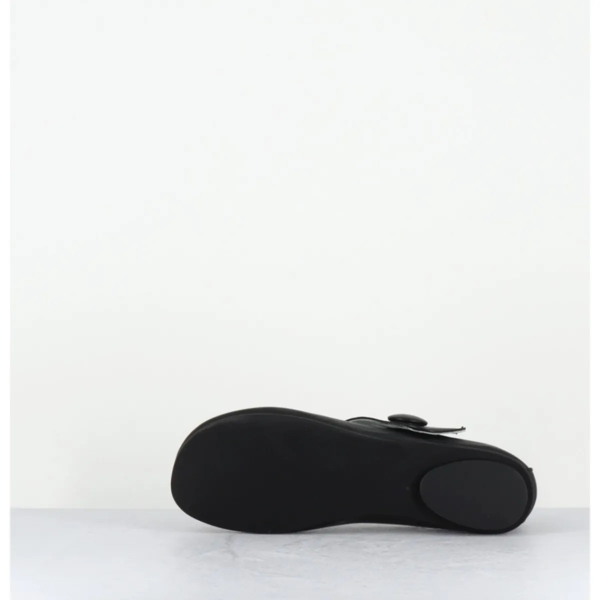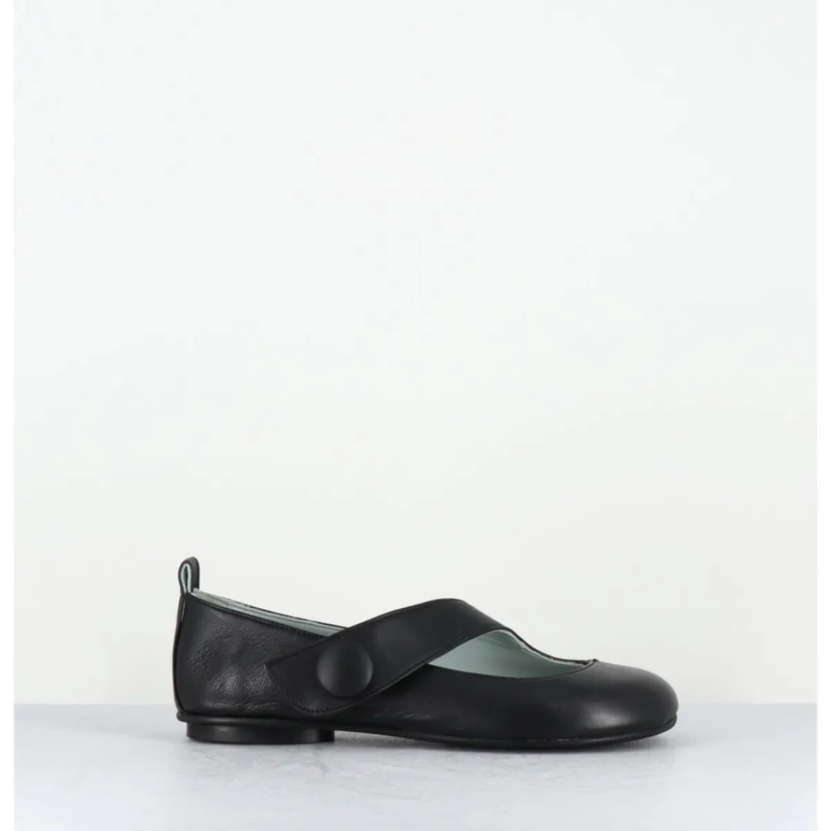 Ballerines ligne avant-gardiste japonisante à bout rond, bride asymétrique ornée d’un large bouton, découpe échancrée à l’avant, réalisées dans un cuir noir extrêmement souple, semelle intérieure molletonnée à mémoire de forme, semelle extérieure cousue construction sacchetto flexible avec talonnette ronde en gomme. D’un grand confort.