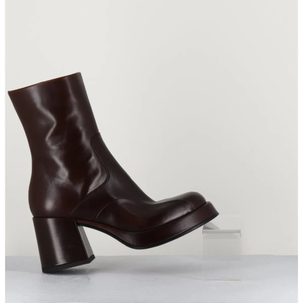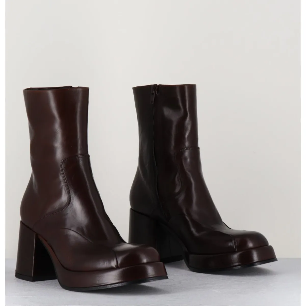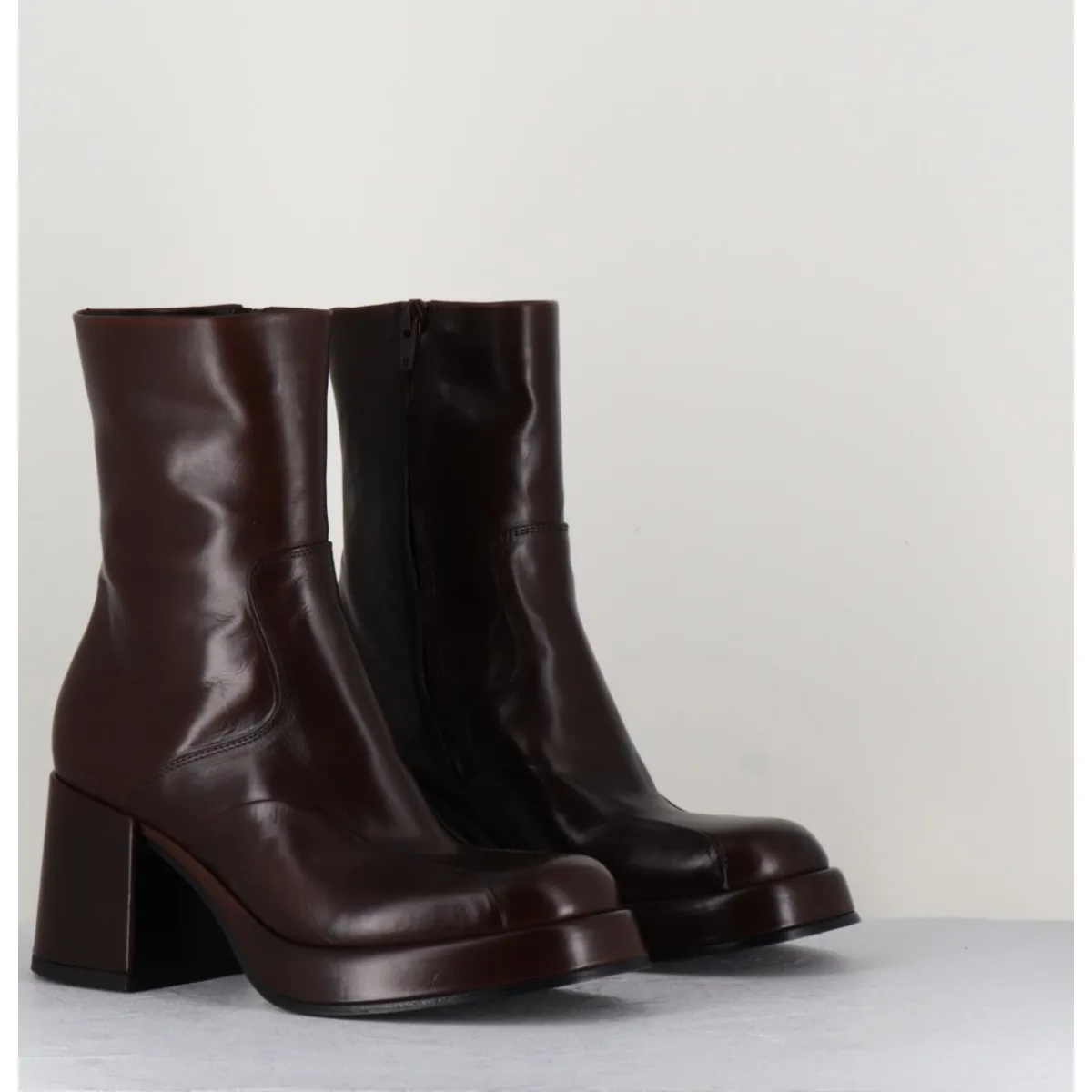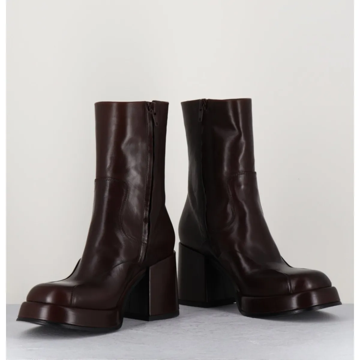 Boots 70s en cuir marron, empiècements ton sur ton sur l’avant, bout carré soft, montées sur un talon bloc et une plateforme recouverts.