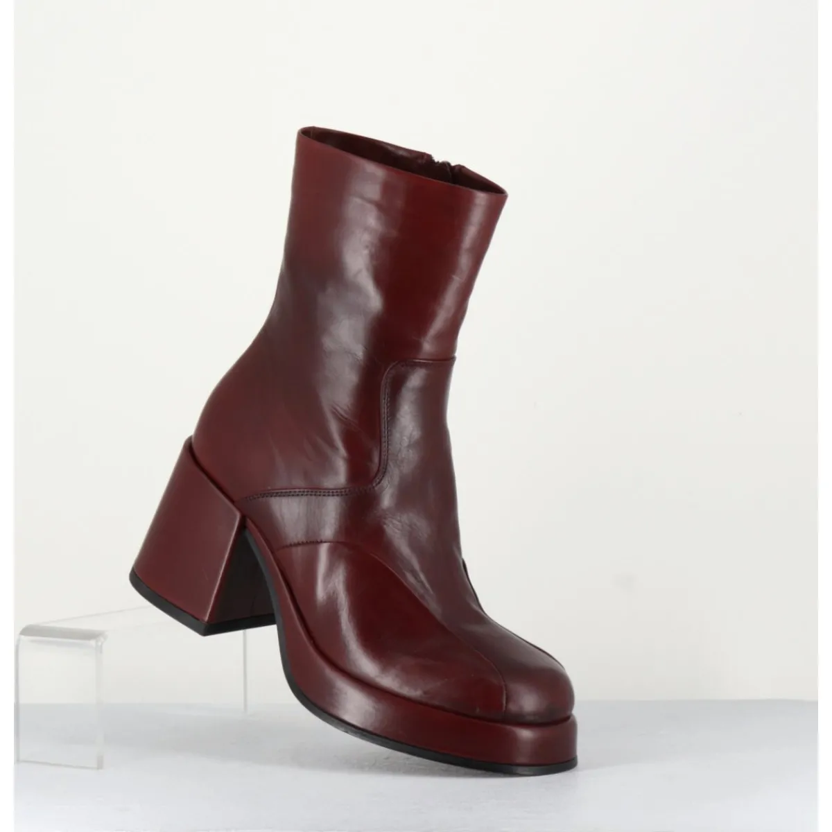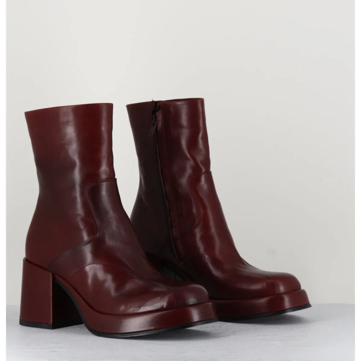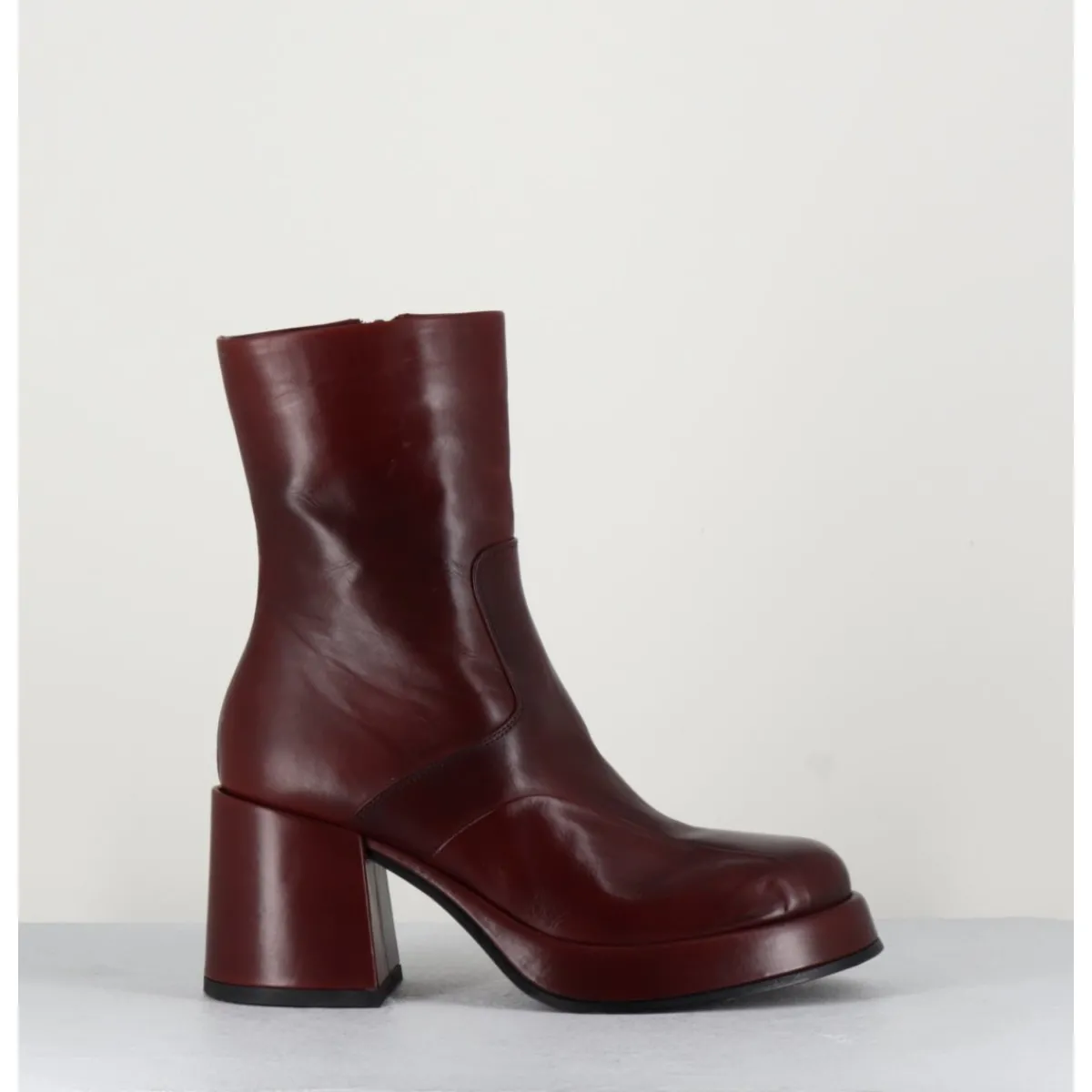 Boots 70s en cuir bordeaux, empiècements ton sur ton sur l’avant, bout carré soft, montées sur un talon bloc et une plateforme recouverts.
