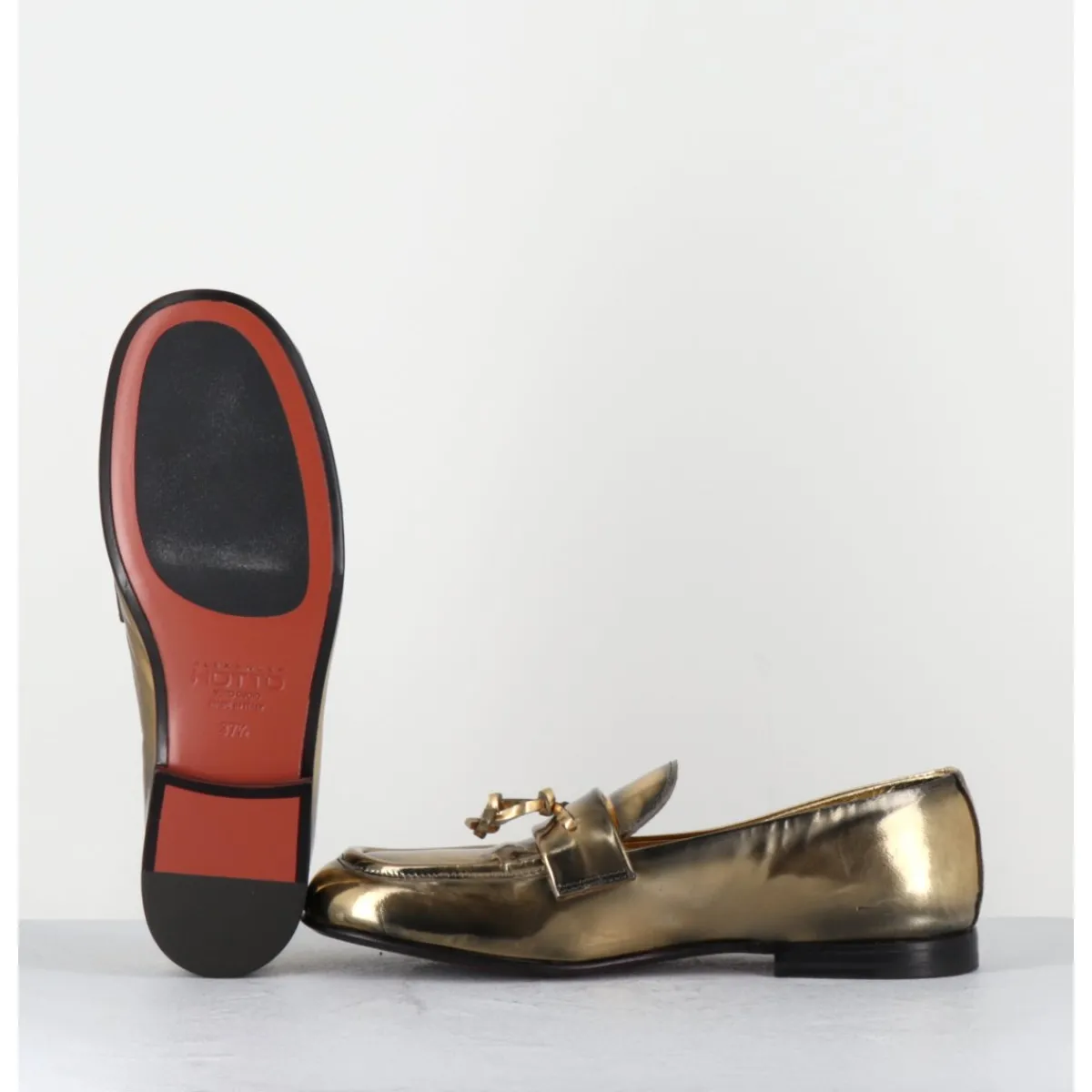 Mocassins plats en cuir glacé doré patiné à la main pour un effet vintage donnant des reflets plus foncés, bout carré arrondi, petit noeud look rétro, montées sur une semelle en cuir extrêmement souple