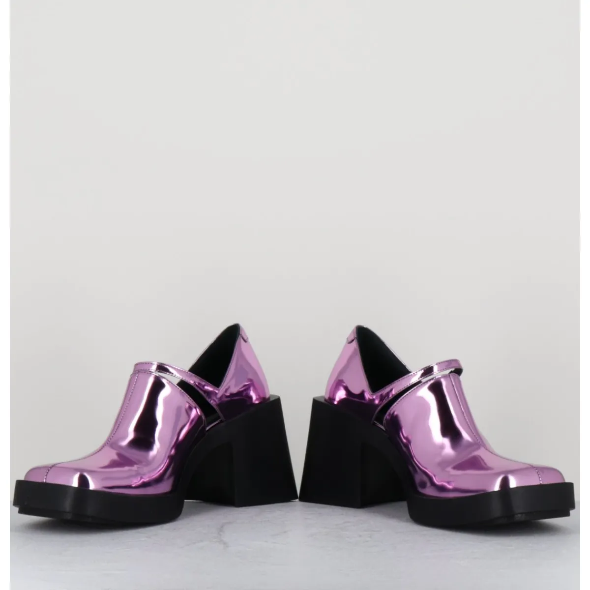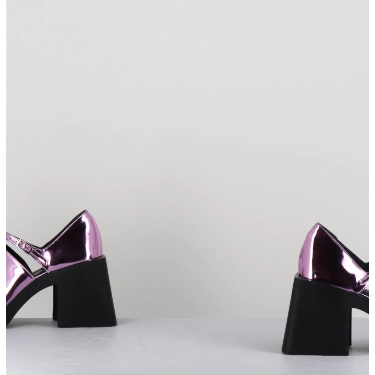 Chaussures Mary-Jane en cuir & vinyl miroir rose, 90s shape bout carré, petit bride réglable, montées sur un talon bloc chunky légèrement évasé & une fine plateforme en gomme noire