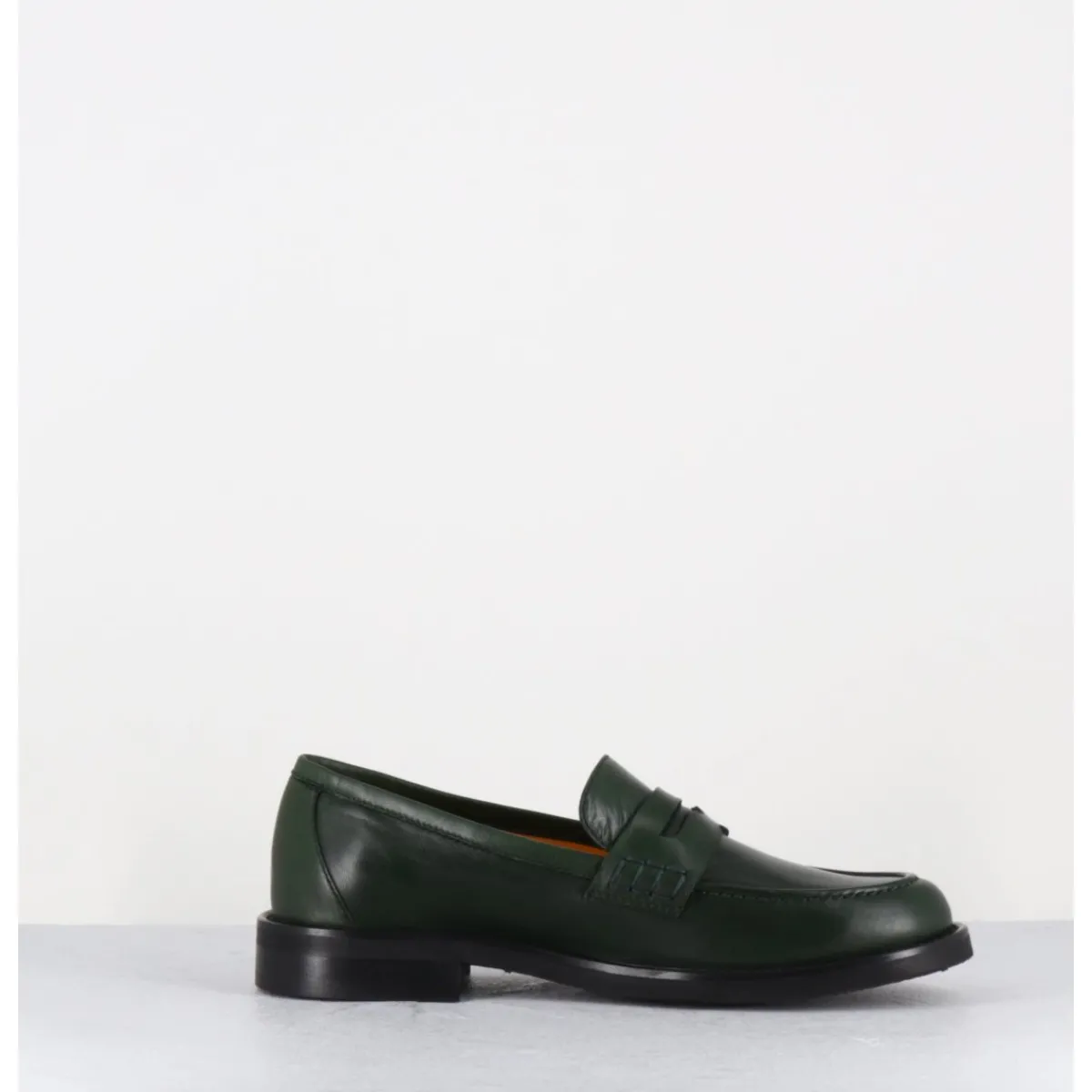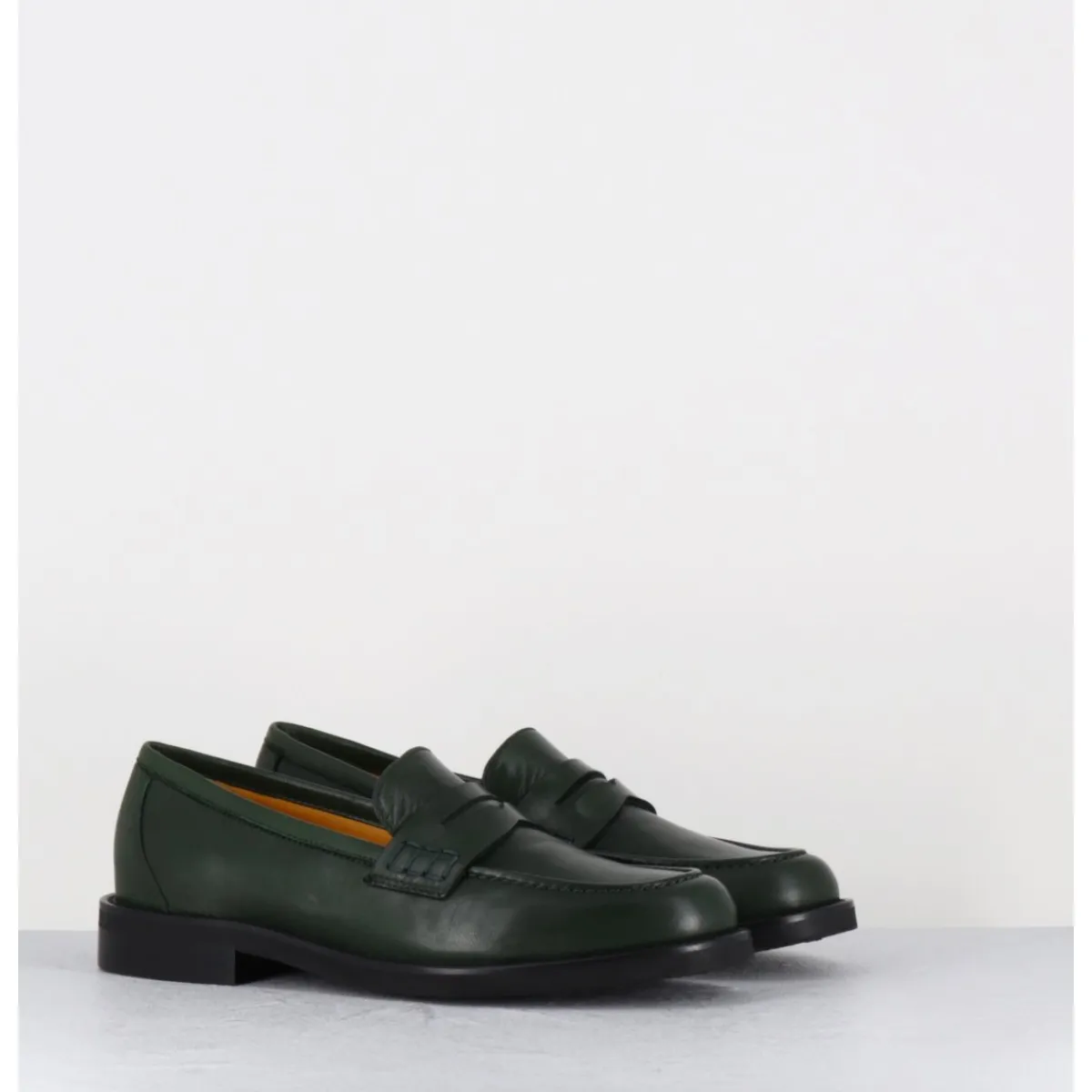 Mocassins plats en cuir vert foncé extrêmement souple, ligne pure montées sur une semelle en gomme ultra légère