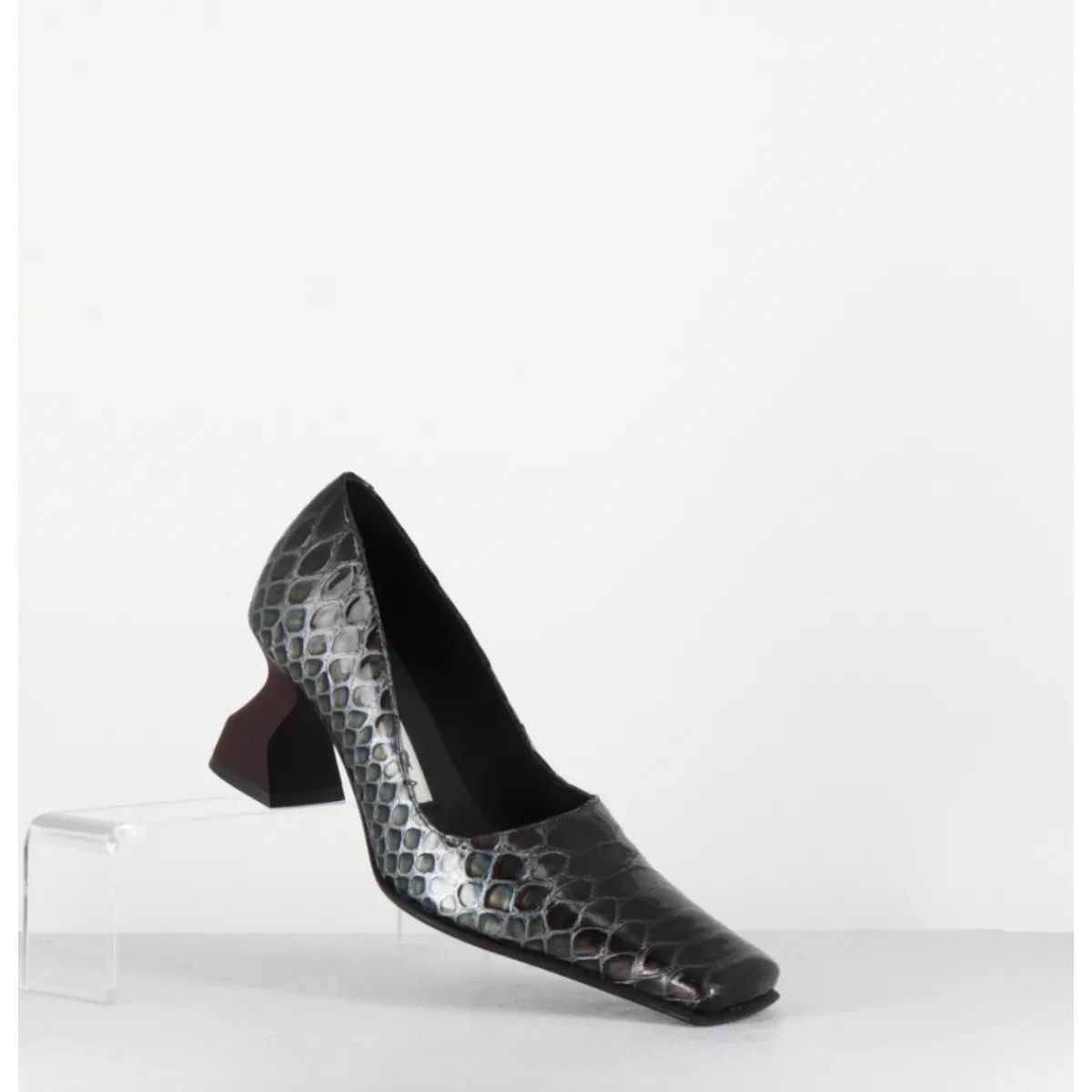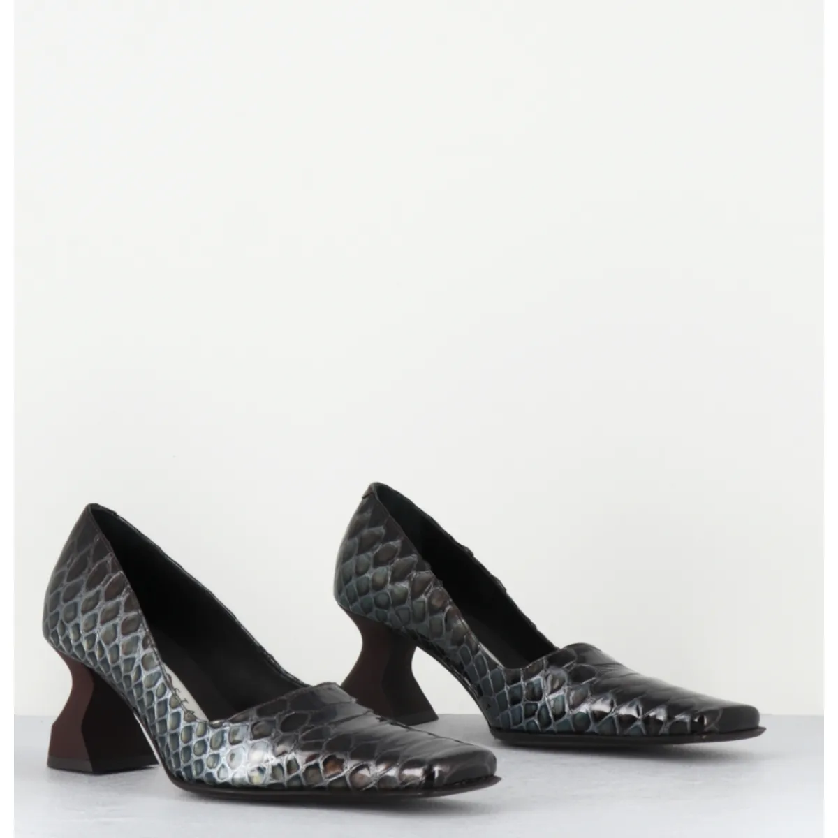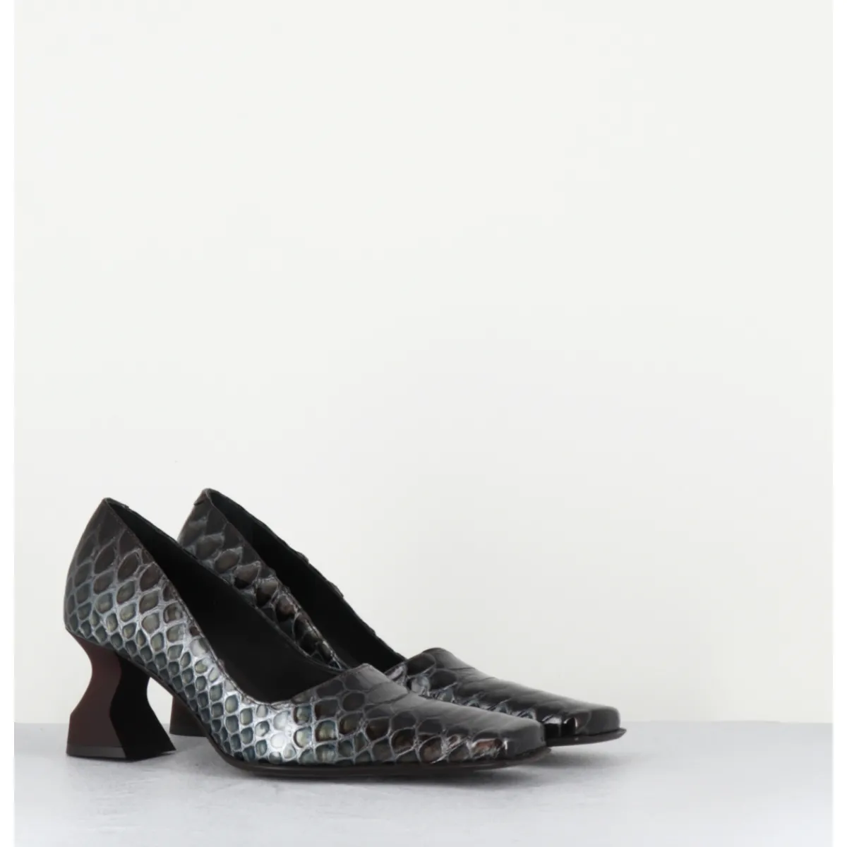 Escarpins en cuir imprimé serpent marron et bleu mélangé, ligne effilée à bout carré 90s, montées sur un talon virgule stylisé recouvert de gomme marron