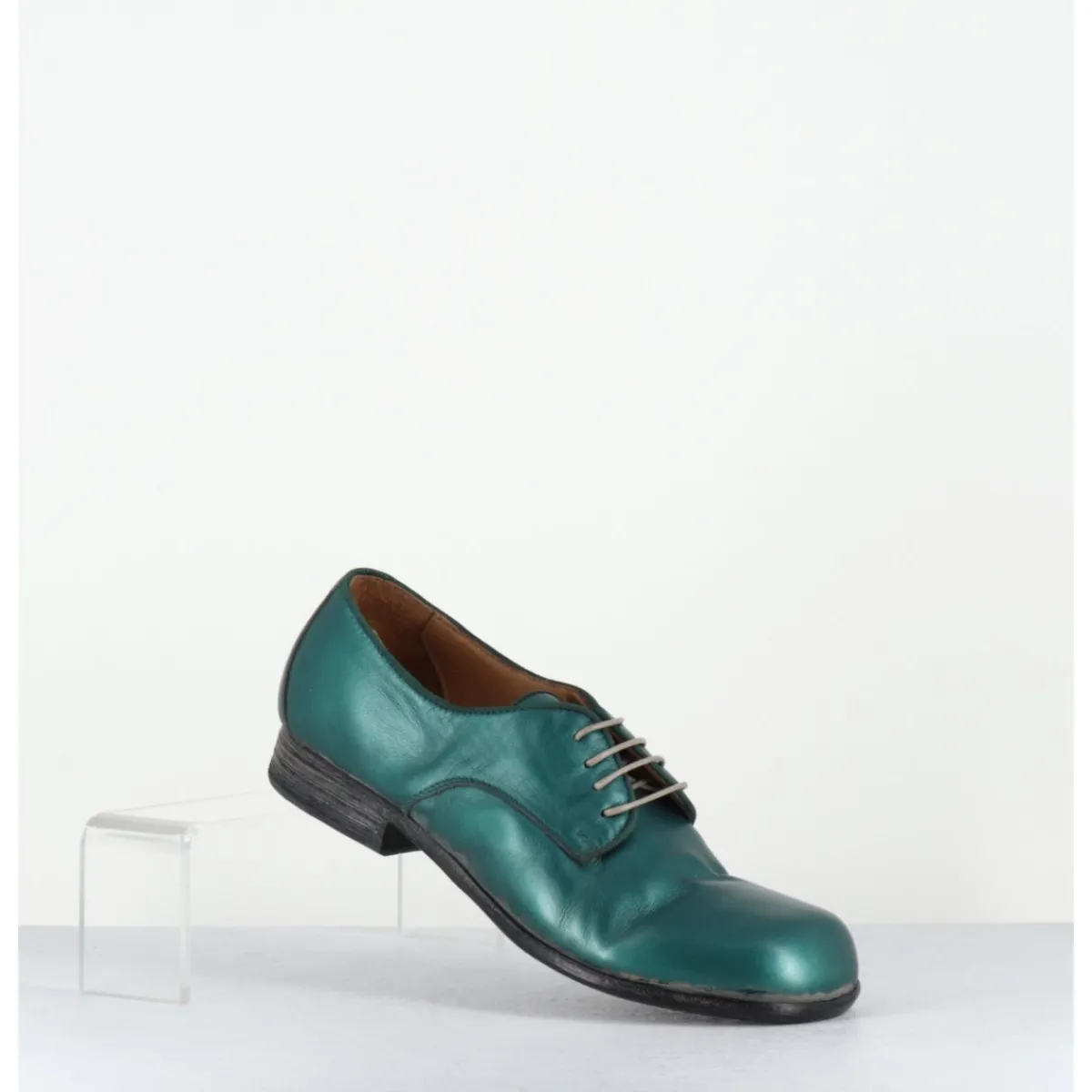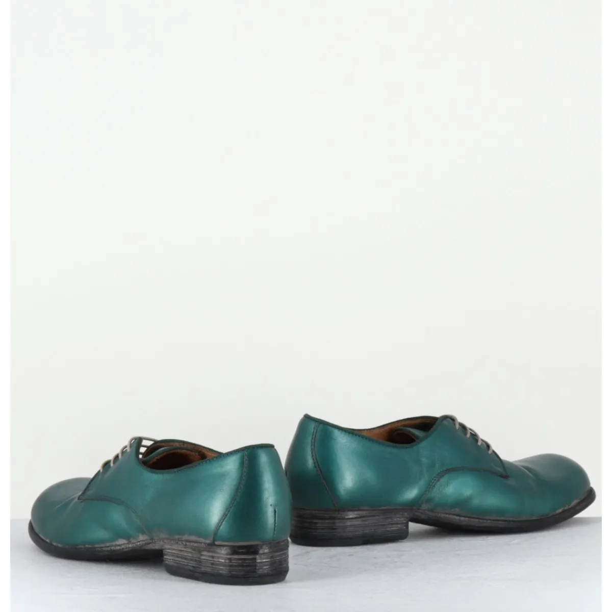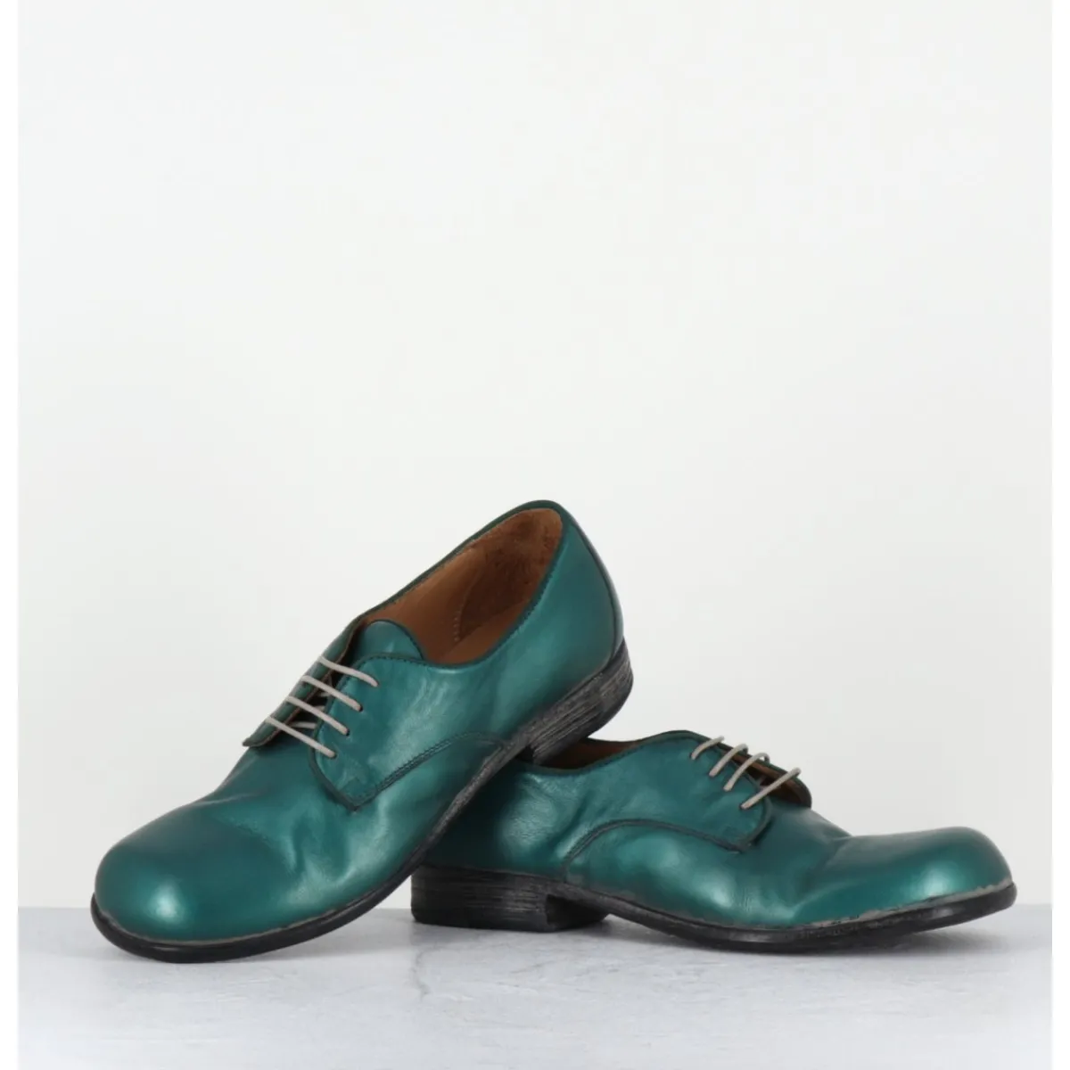 Derbies à lacets en cuir souple métallisé bleu, ligne pure esprit avant-garde, bout arrondi, montées sur une semelle cousue et lavée à la main pour un effet usé