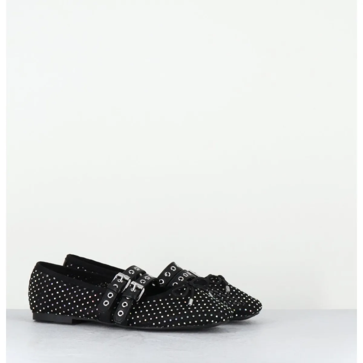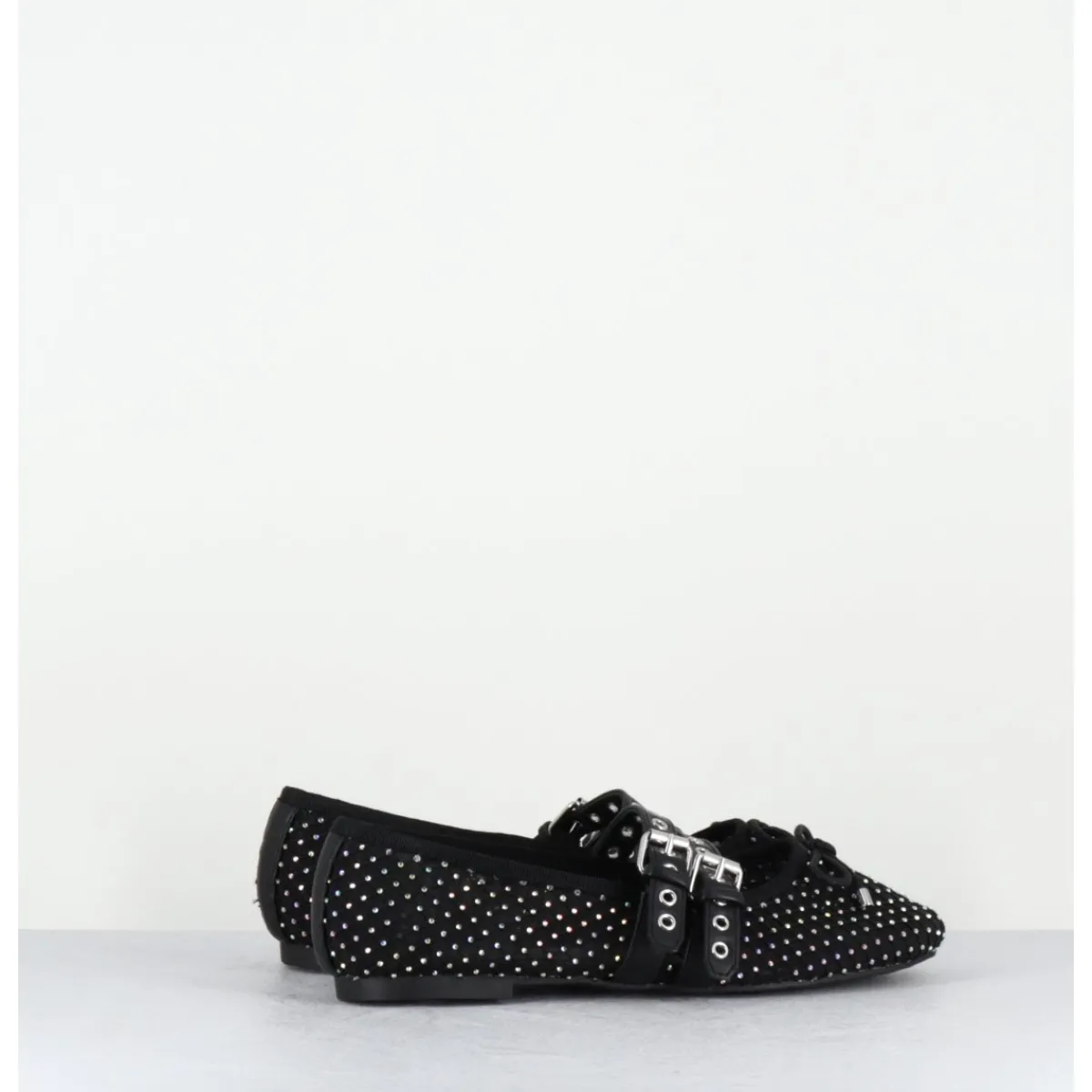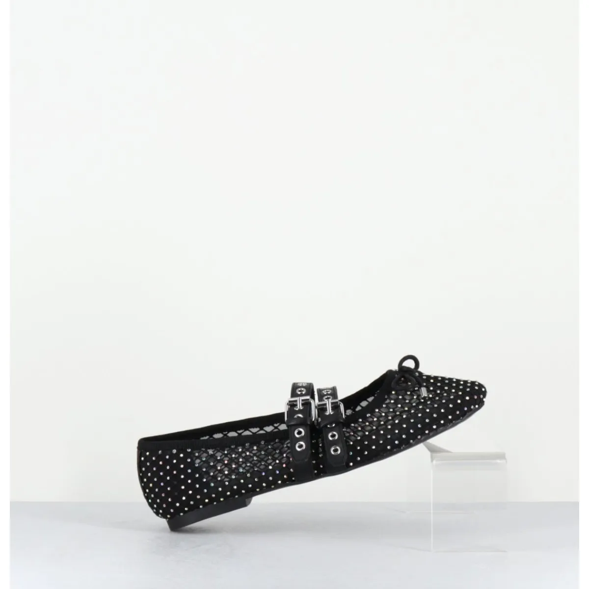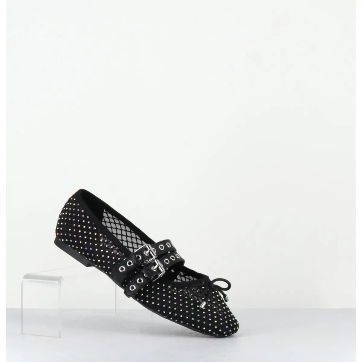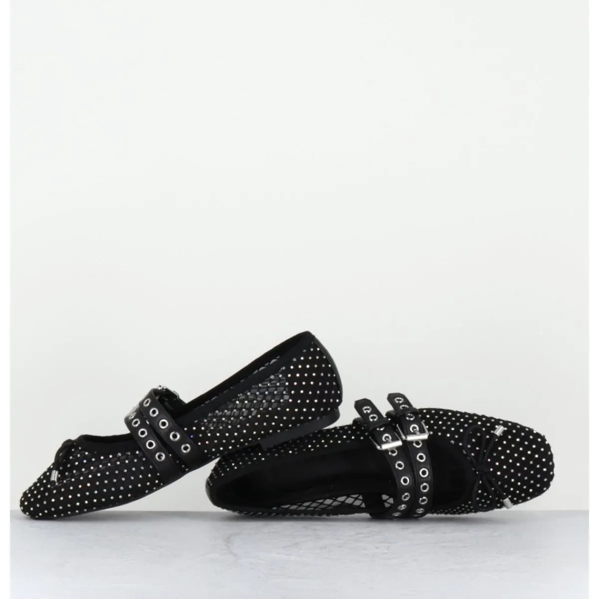 Ballerines en mesh noir effet résille orné de petits strass, double brides réglables en cuir noir esprit Mary-Jane, ligne effilée avec bout arrondi et petit noeud décoratif, montées sur une semelle plate en gomme