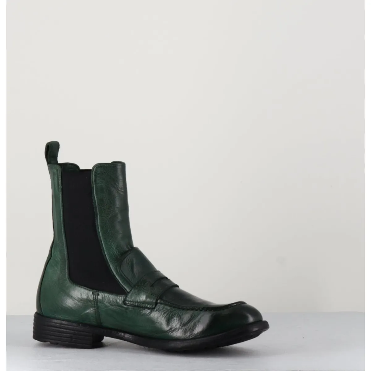 Boots-mocassins chelsea double élastiques en cuir souple vert bouteille, bout effilé, montées sur un petit talon.