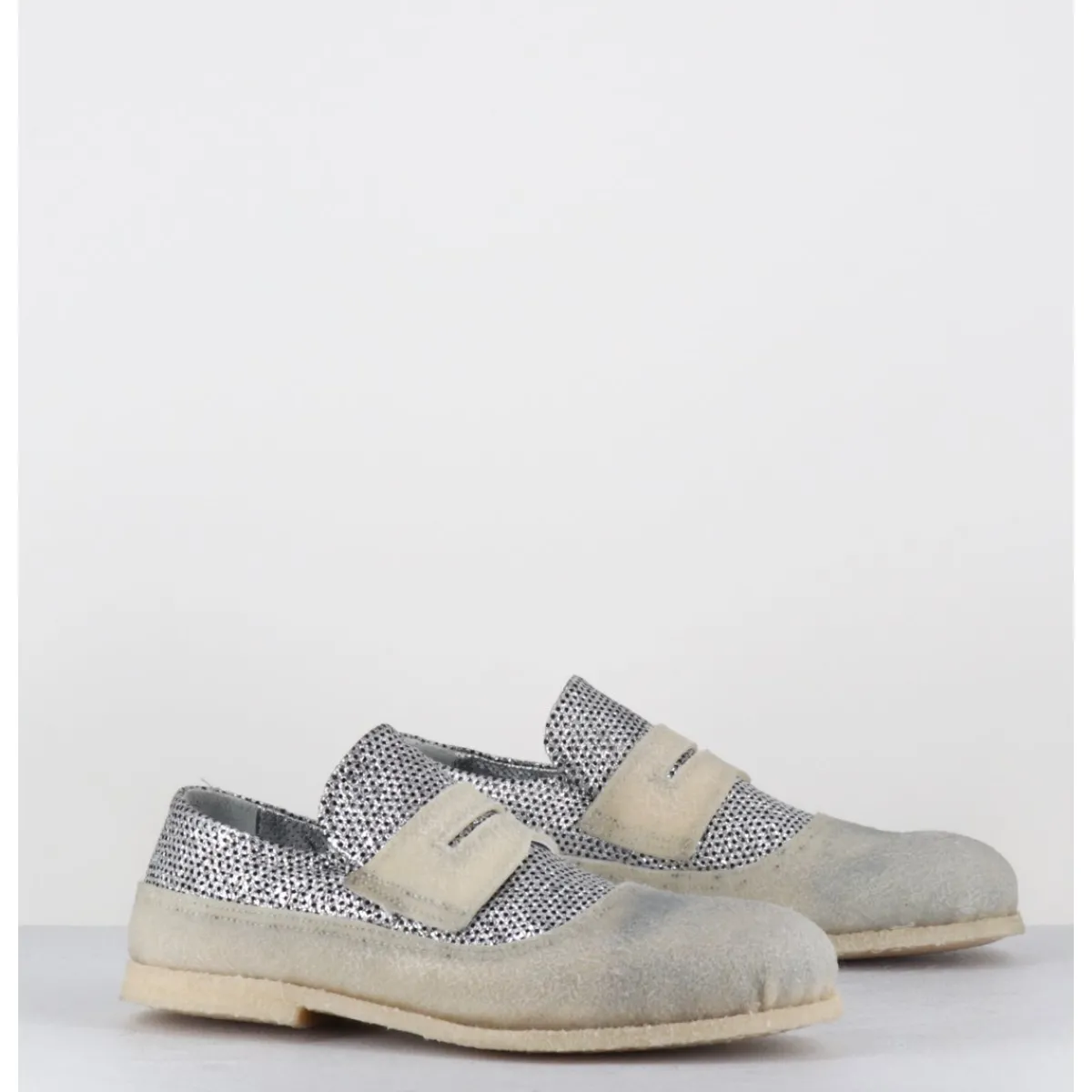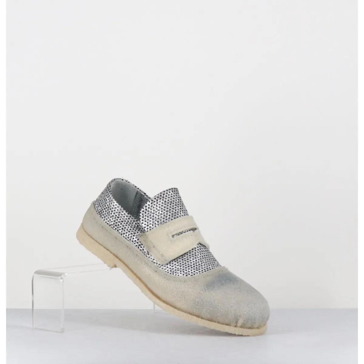 Mocassins en cuir métallisé argent perforé et crêpe naturel, construction sacchetto extrêmement souple cousu intérieur extérieur, ligne effilée en amande