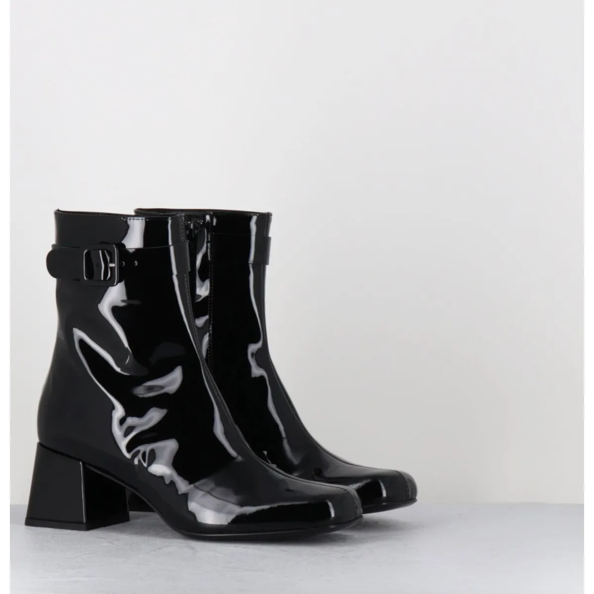 Boots en cuir vernis noir, bout carré et petit talon évasé esprit 60s