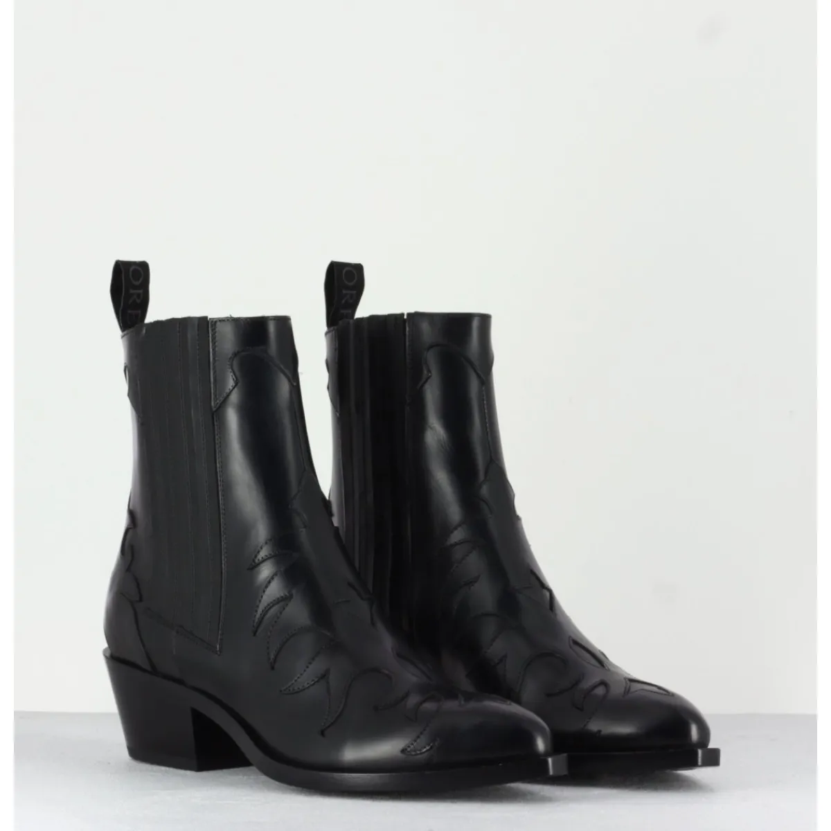 Boots santiag iconique des bottiers Sartore en cuir lisse noir, petit talon biseauté, découpes flammes et élastiques latéraux pour un enclenchement facile .