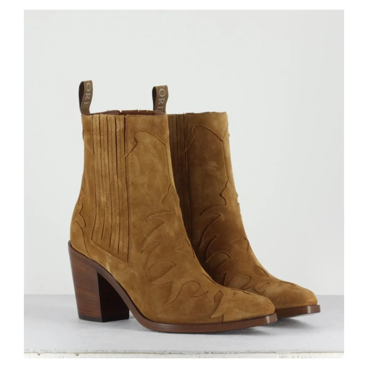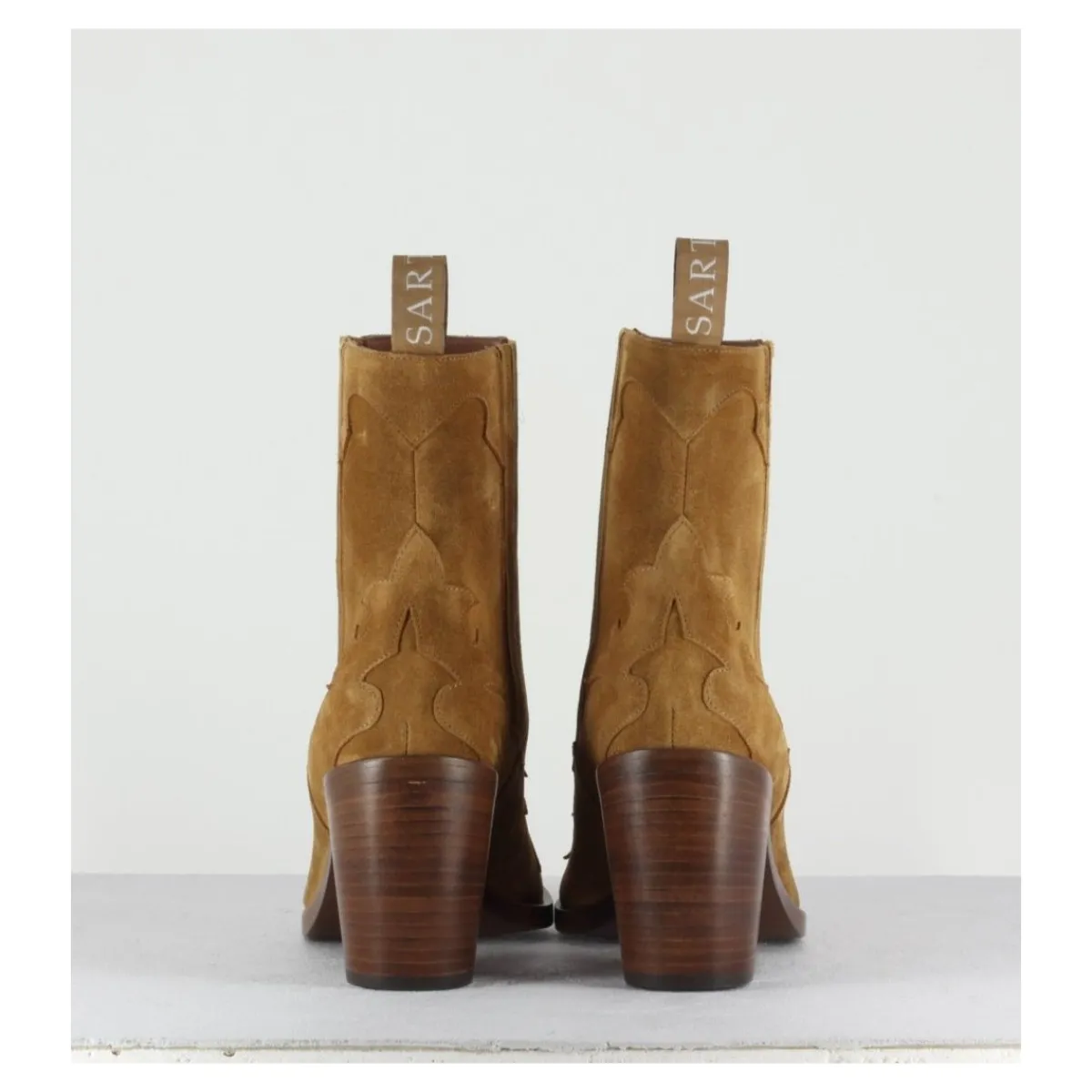 Santiag iconique à talon biseauté signées Sartore en daim camel orné de découpes flammes et élastiques latéraux pour un enclenchement facile.
