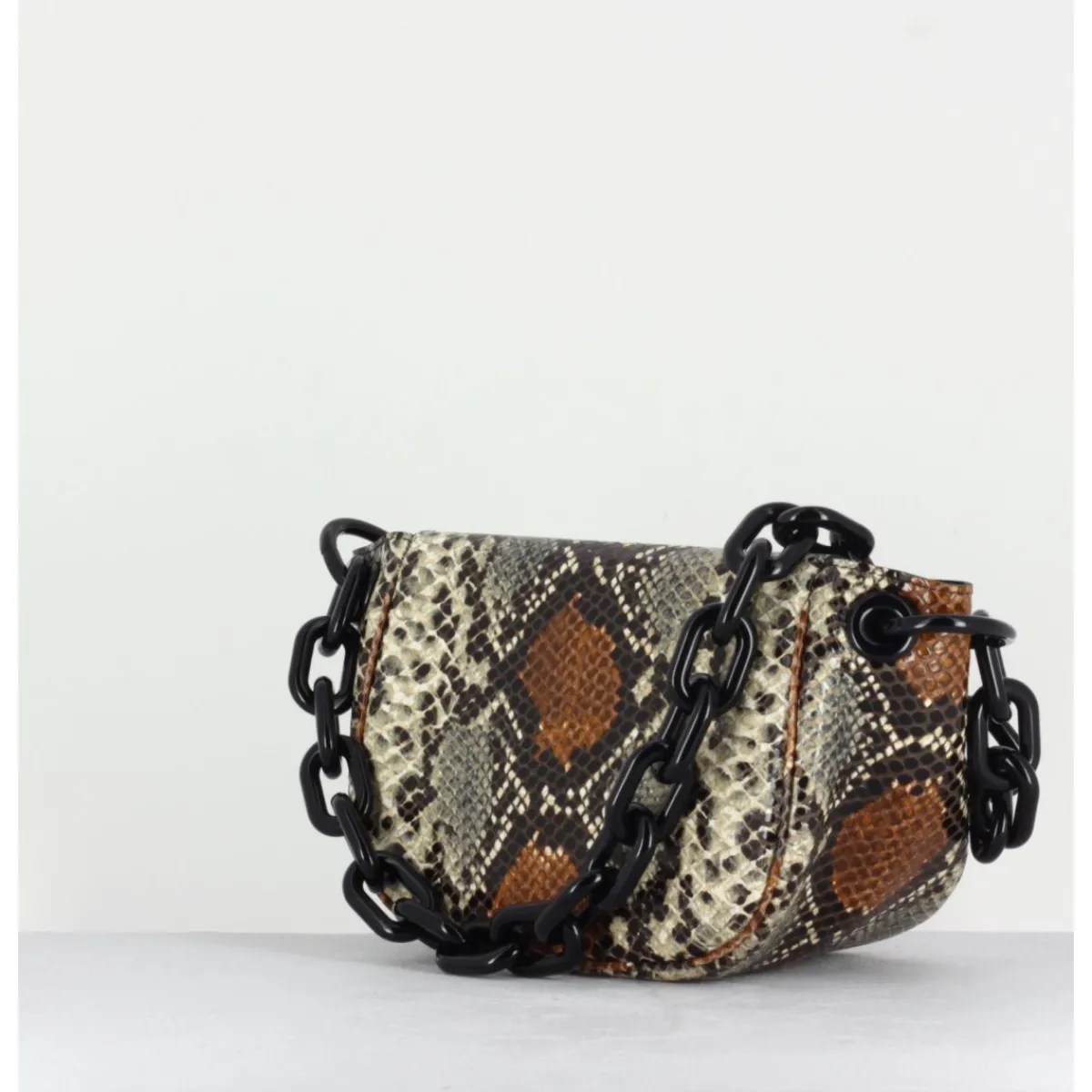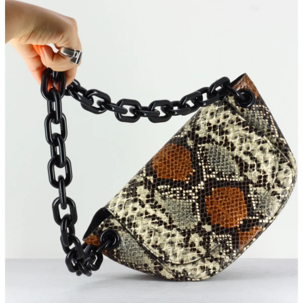 Sac porté épaule en cuir imprimé python avec chaine à maillons en acrylique et fermeture magnétique.