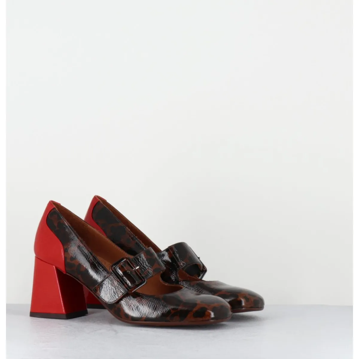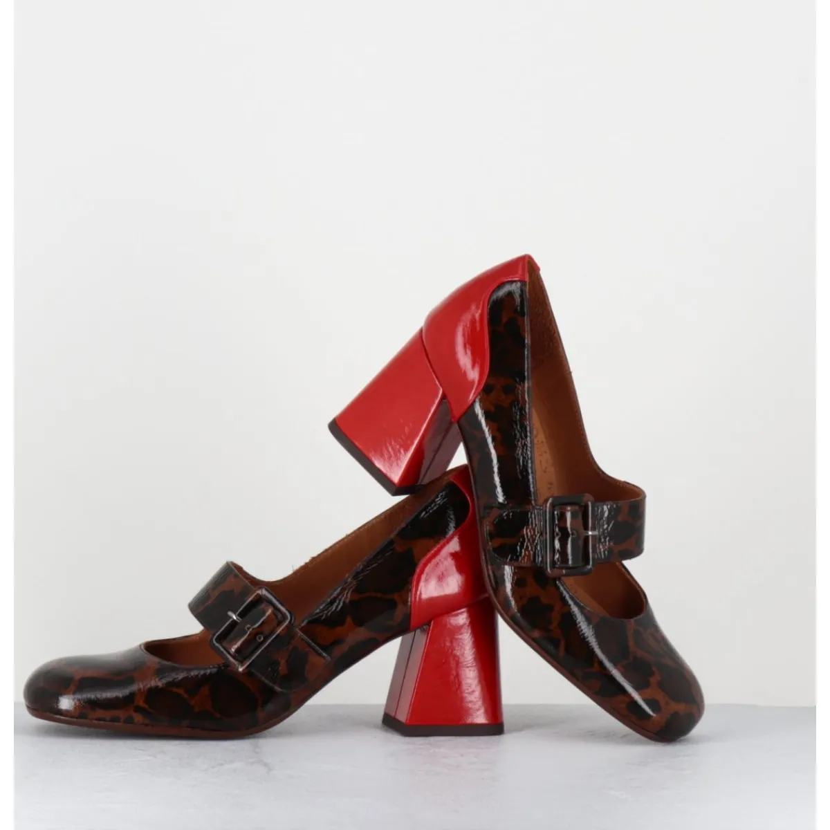 Chaussures Mary-Jane à bride réglable en cuir vernis souple imprimé pied-de-poule léopard, bout carré arrondi, montées sur un talon rétro légèrement évasé recouvert de cuir vernis rouge