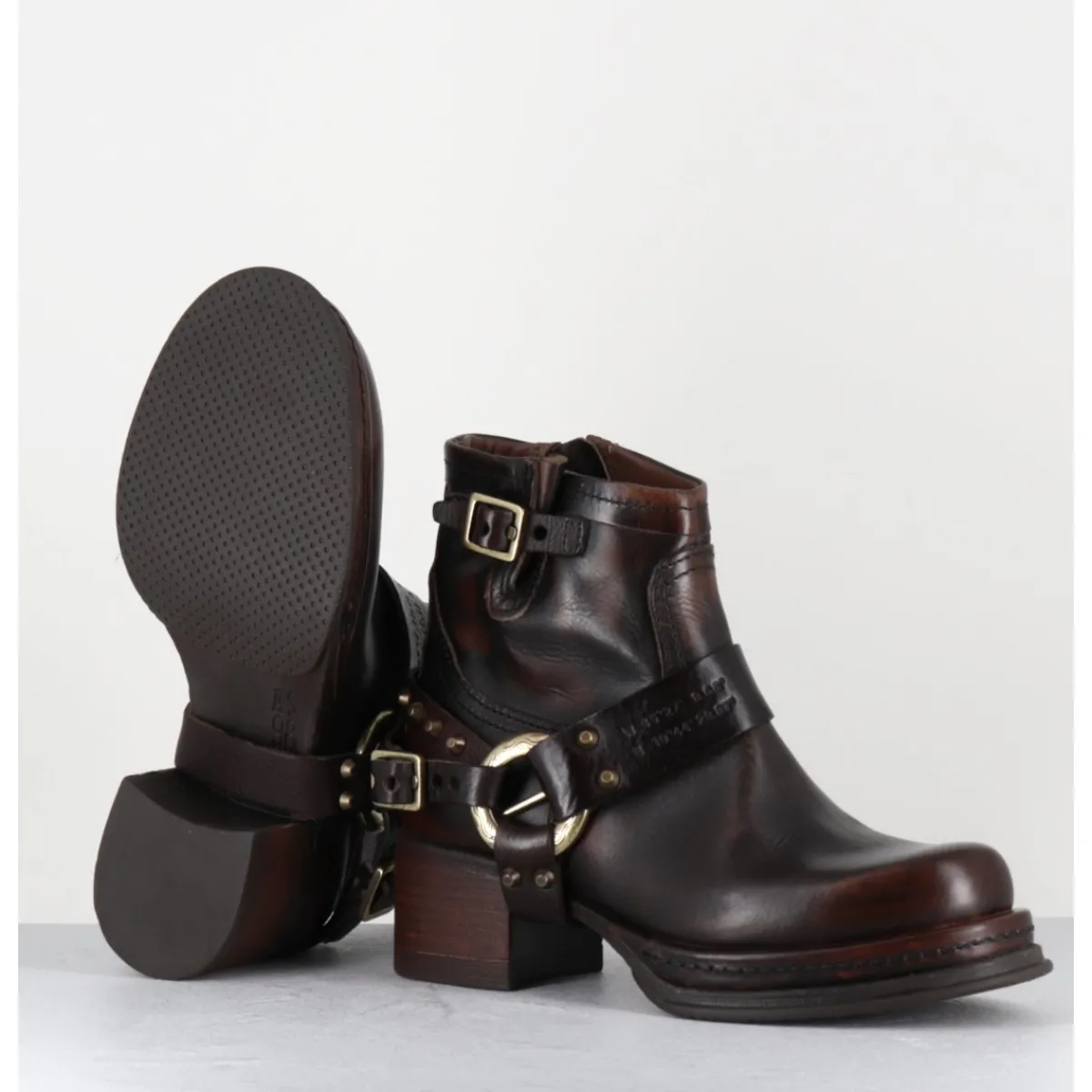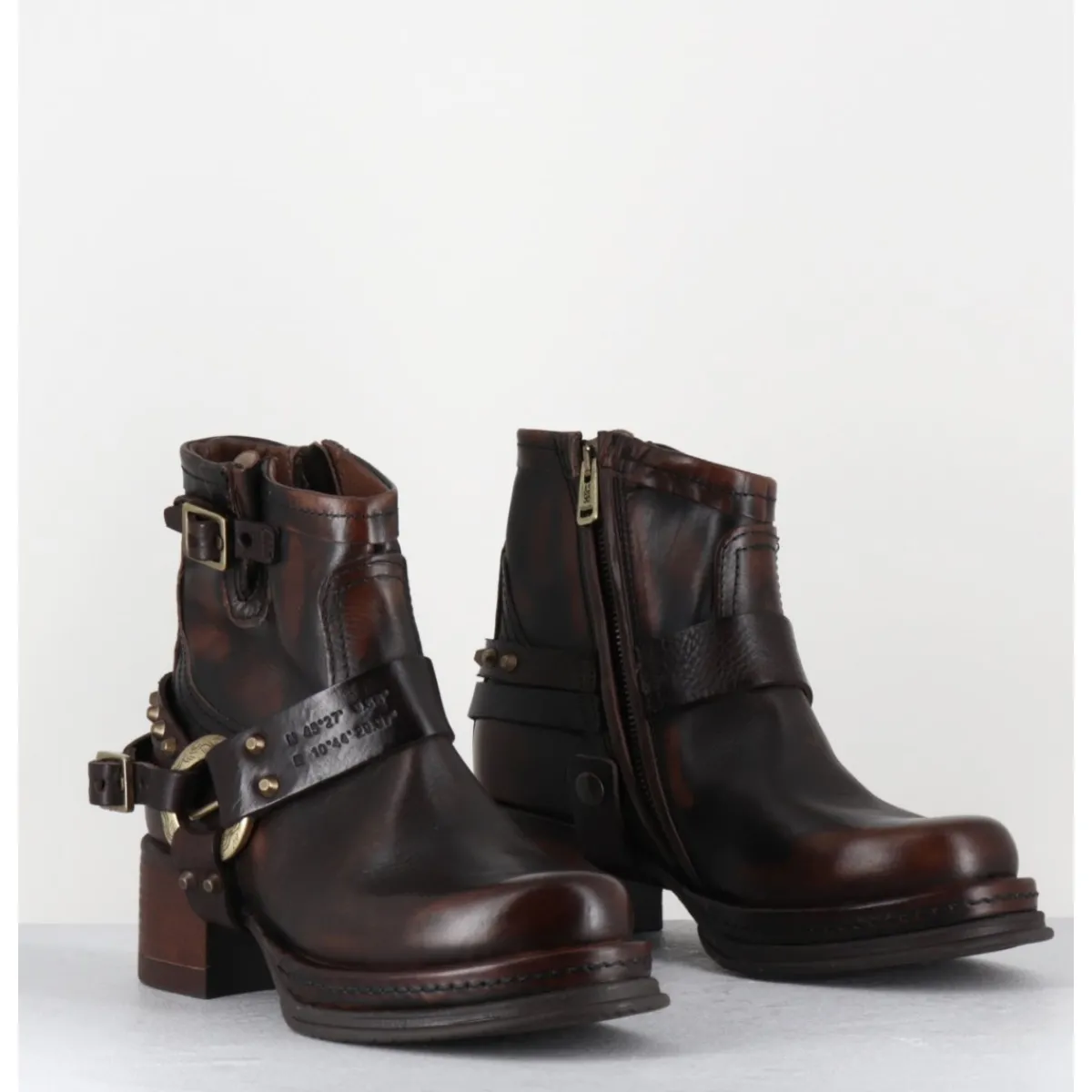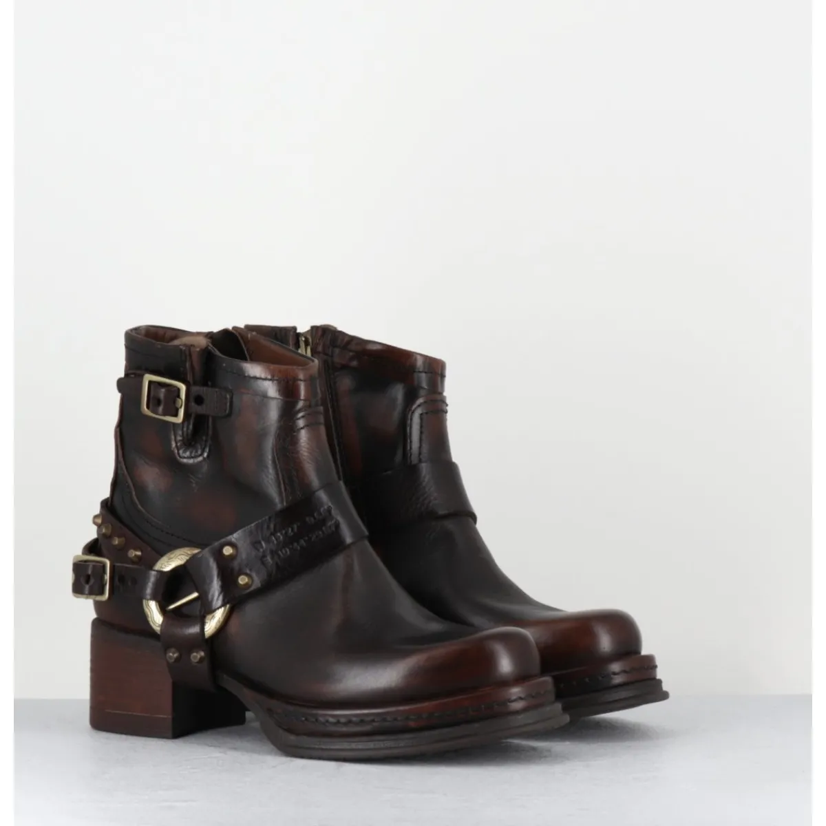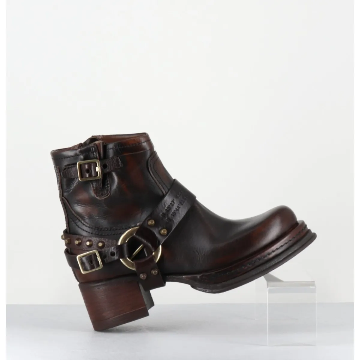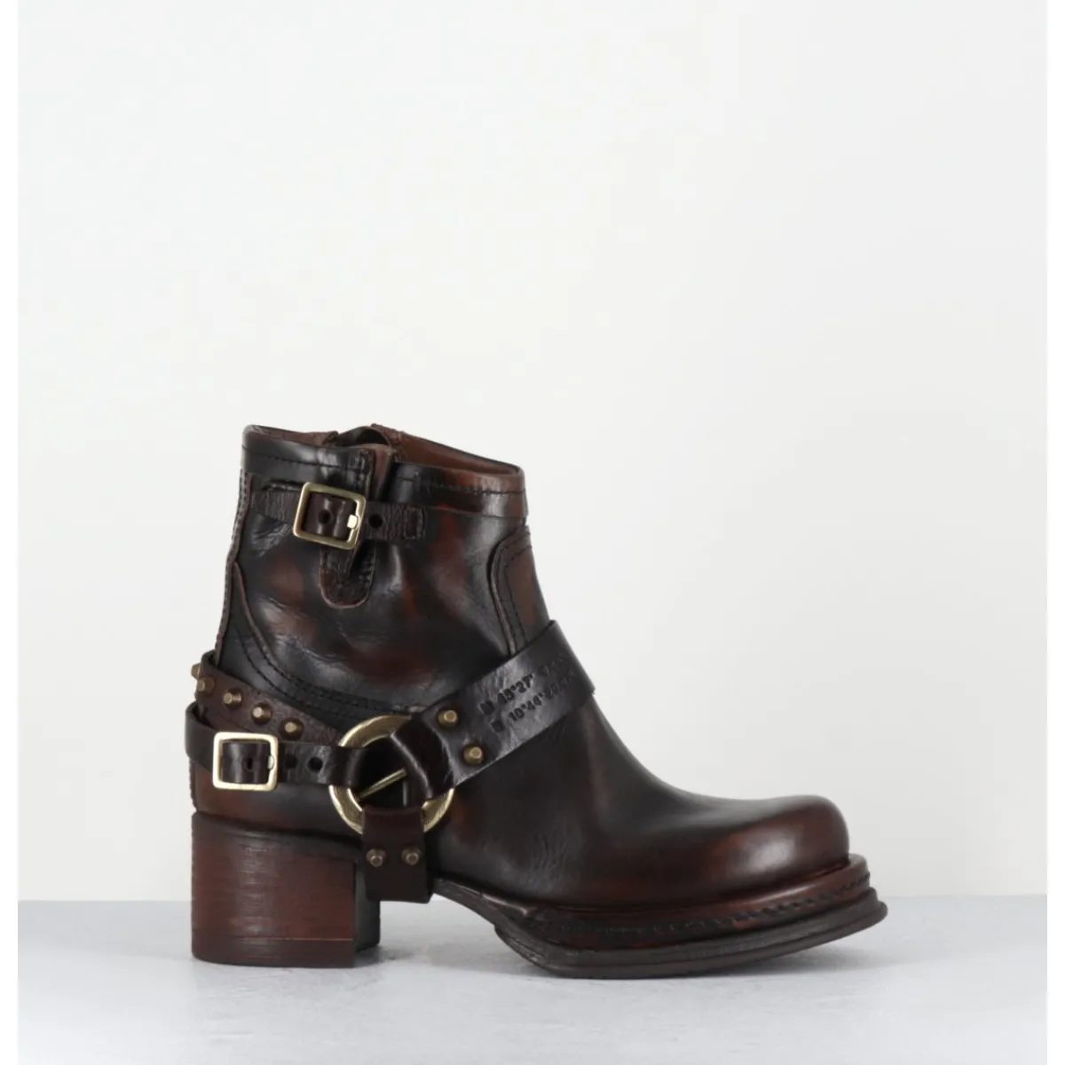 Boots bikers tige courte en cuir marron lustré avec patine vieilli à la main pour un effet vintage, ceinturon à clous dorés, bout arrondi, petit bride à boucle réglable sur la jambe, montées sur une semelle épaisse en gomme et un talon bloc confortable