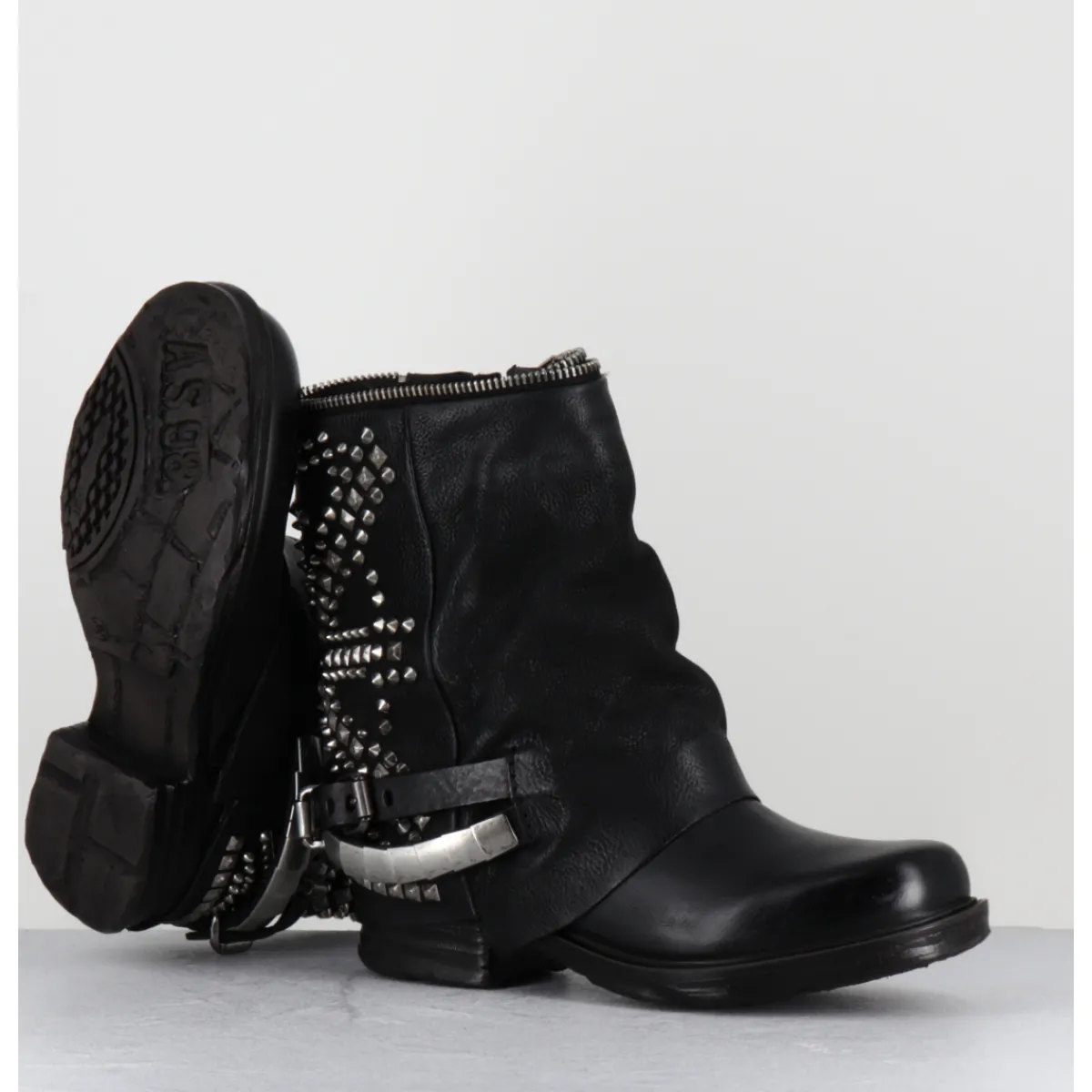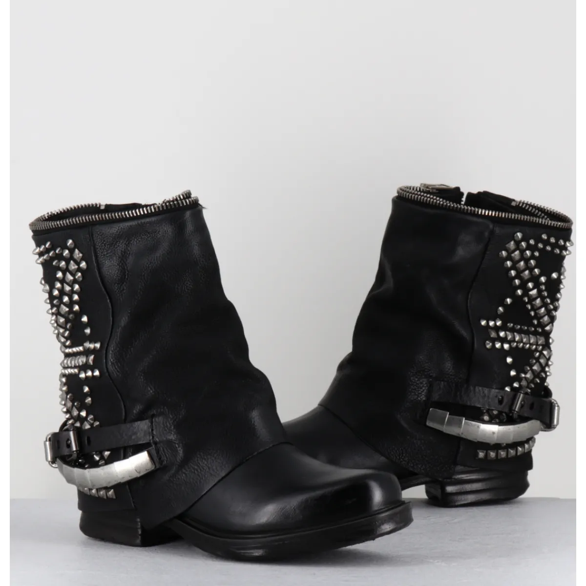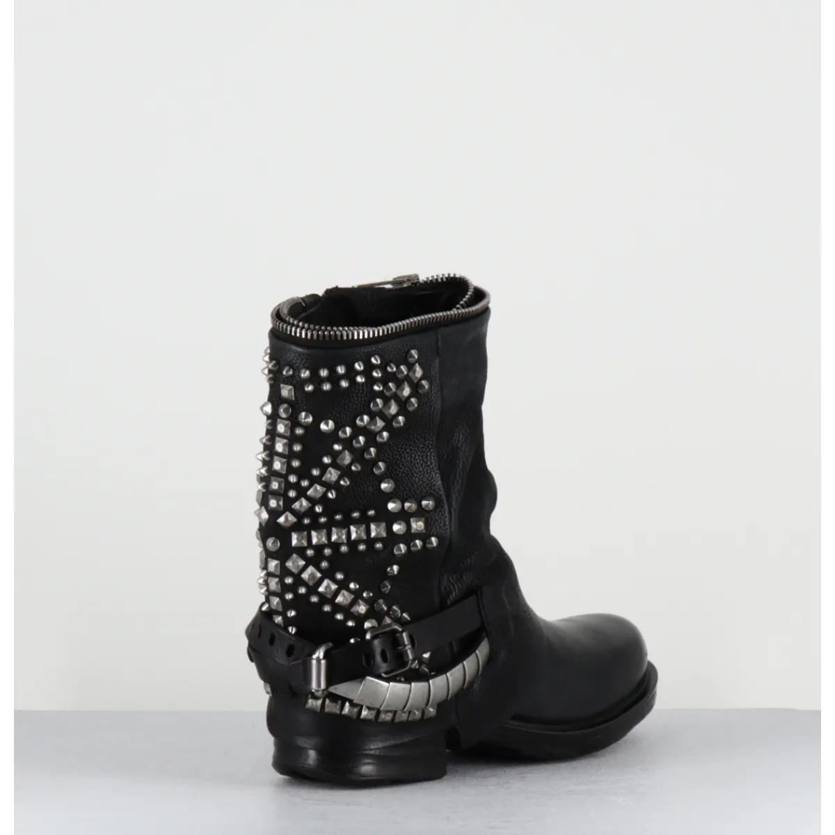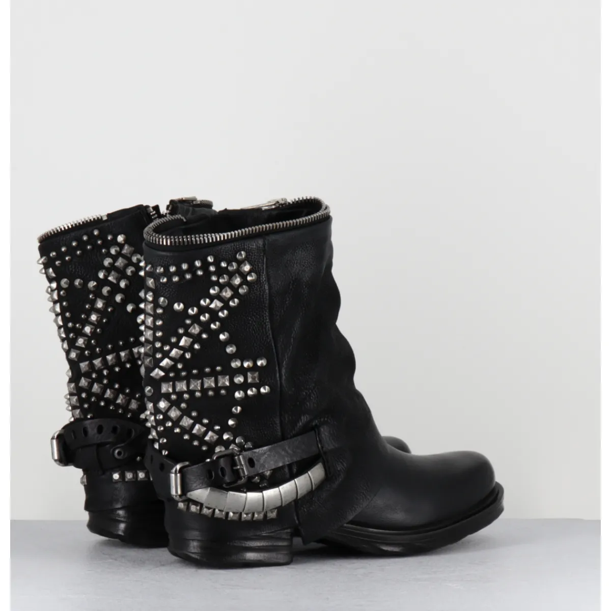 Boots bikers en cuir gras noir avec double sangles à l’arrière et en partie recouverte de clous motif rock