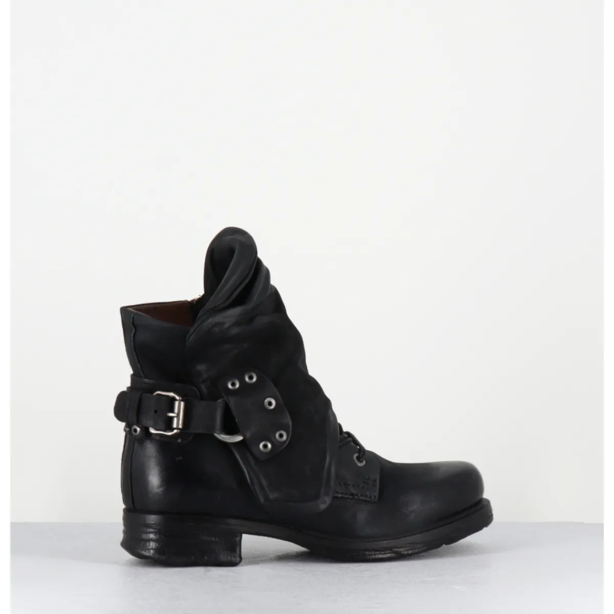 Boots rangers à lacets en cuir gras noir avec empiècement asymétrique et sangle réglable à l’arrière esprit rock