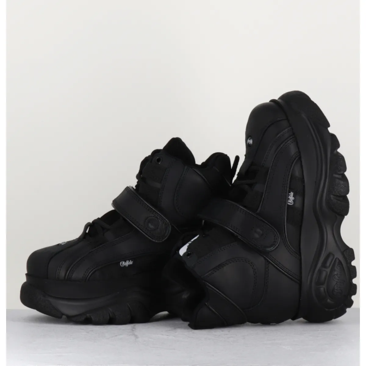 Baskets Buffalo London tige haute en cuir nubuck gras noir, montées sur sa célèbre semelle épaisse plateforme ton sur ton avec logo original. Un classique des 90s !