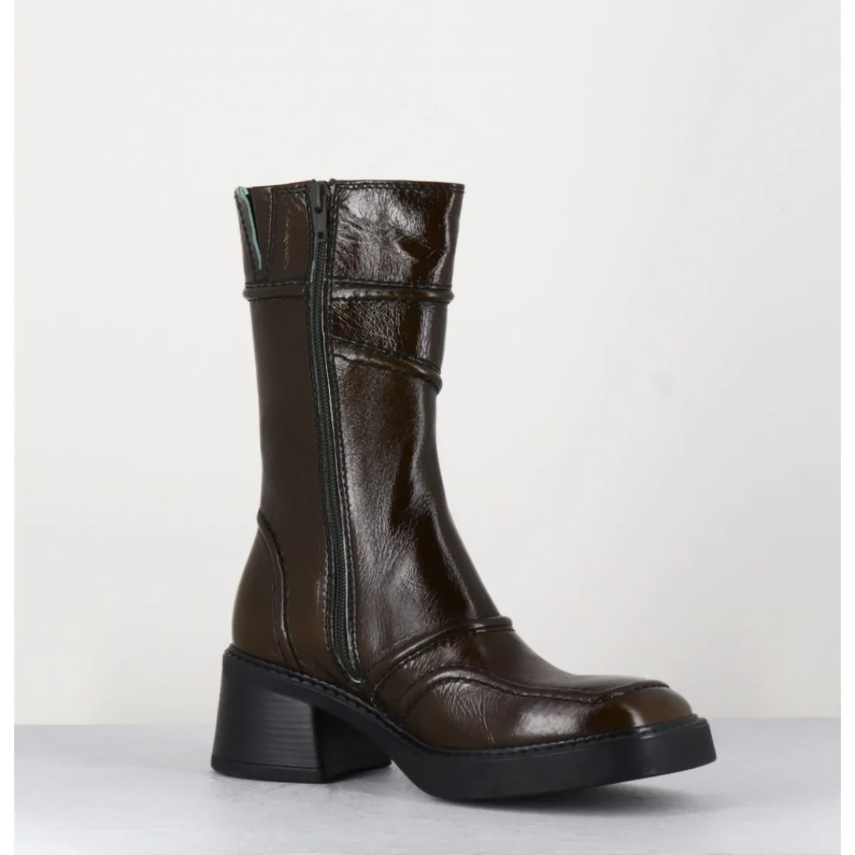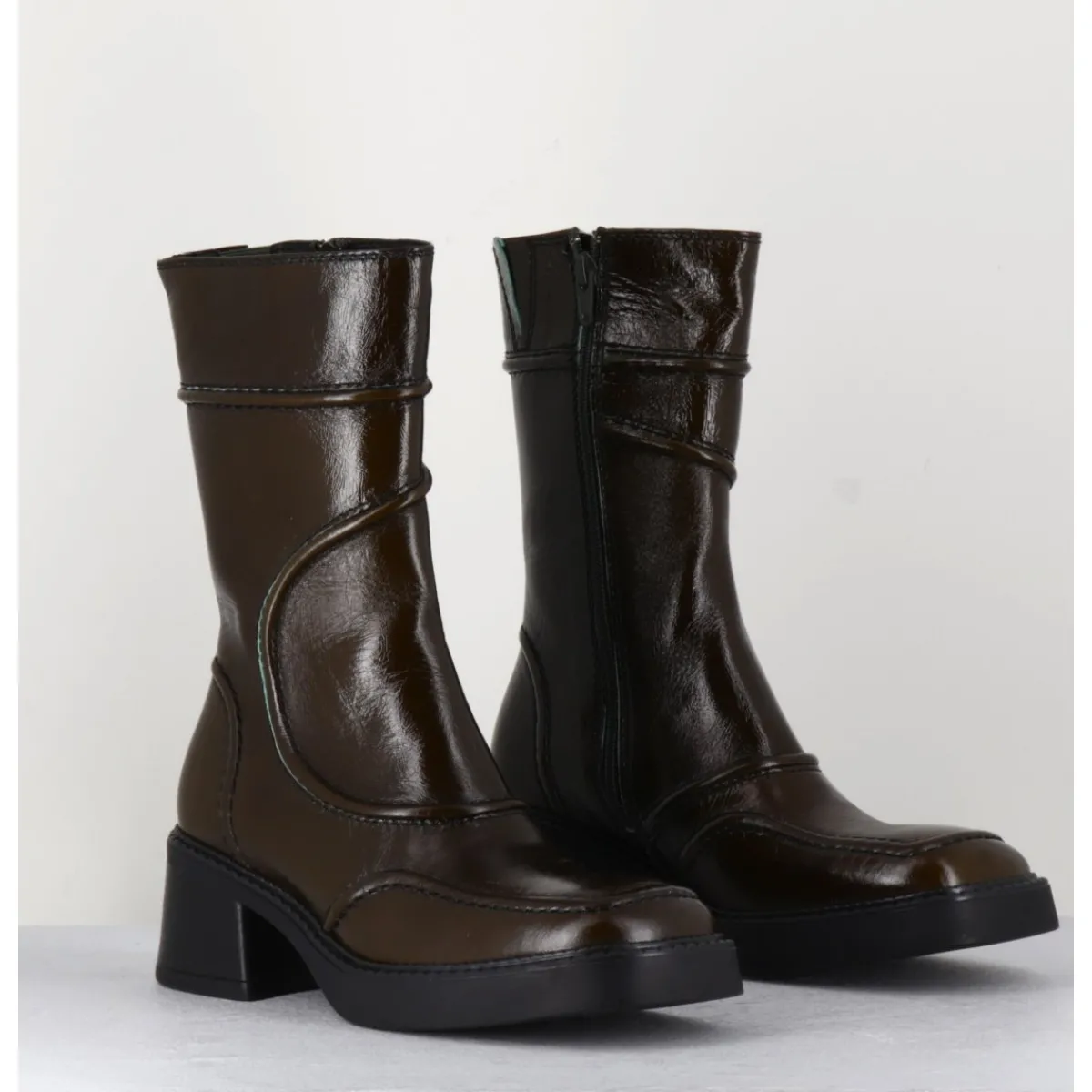 Boots en cuir brillant, découpes & surpiqûres géométriques esprit années 90, bout carré arrondi, montés sur un petit talon bloc et une fine plateforme en gomme.