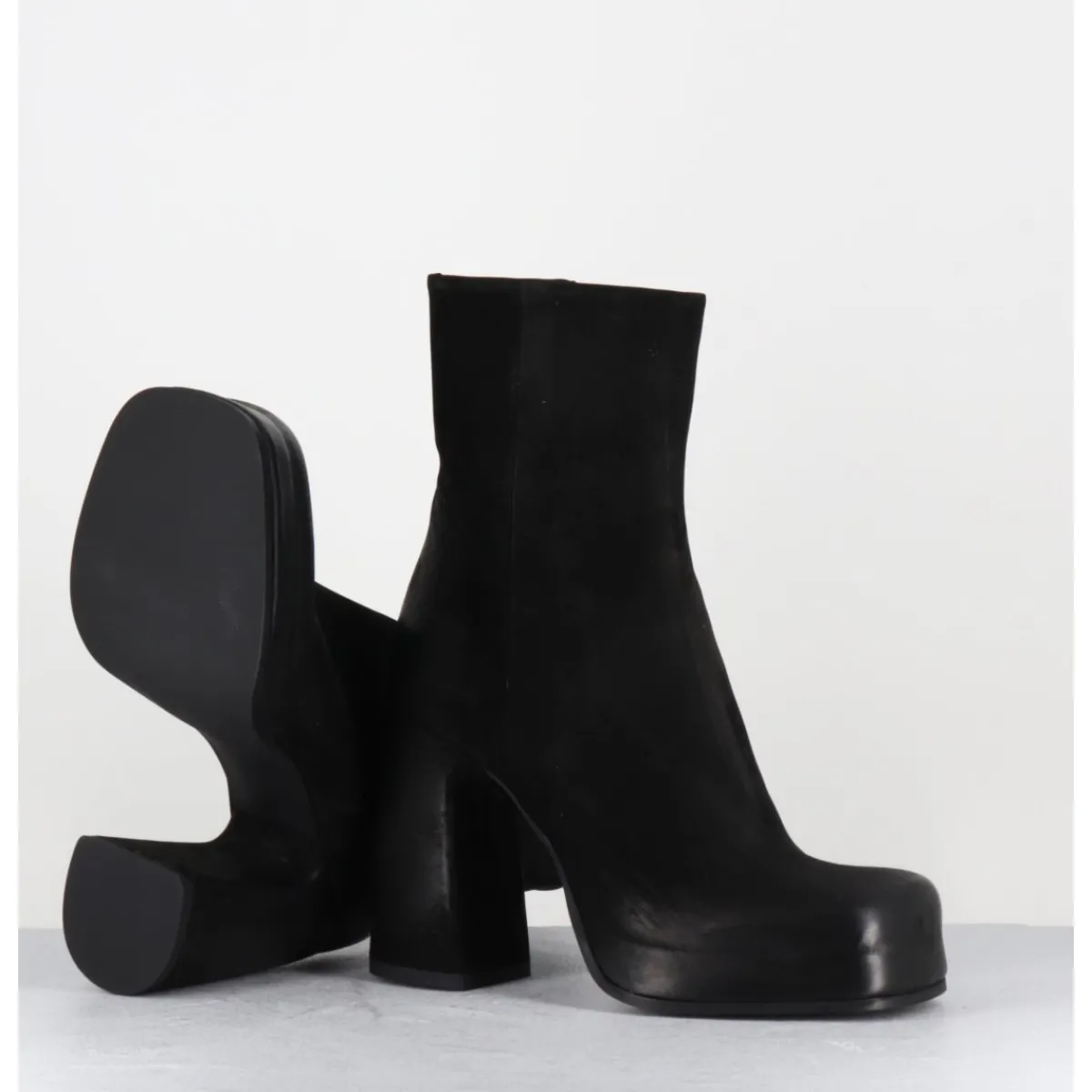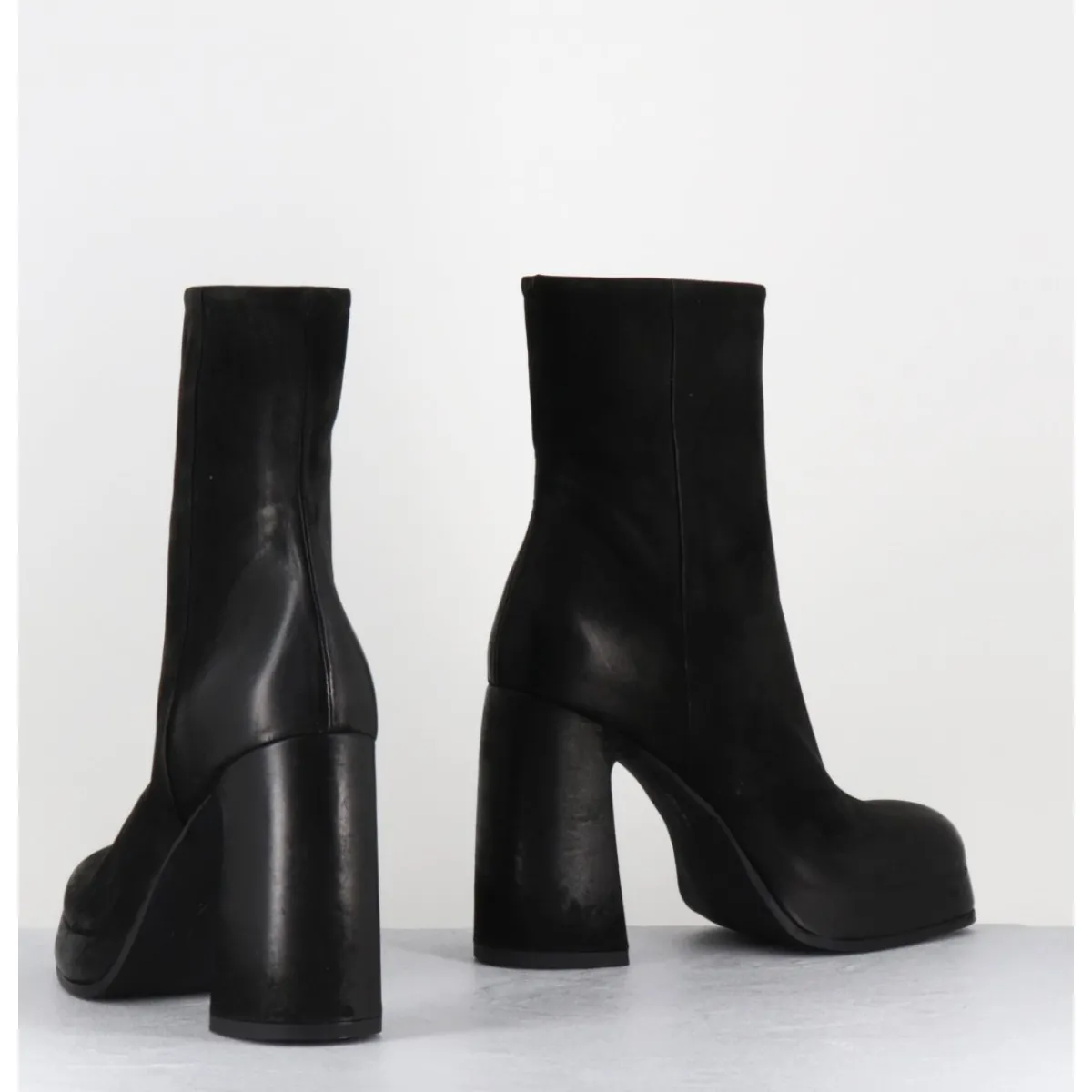 Boots à plateforme en cuir nubuck gras noir, bout carré arrondi, montées sur un talon haut recouvert
