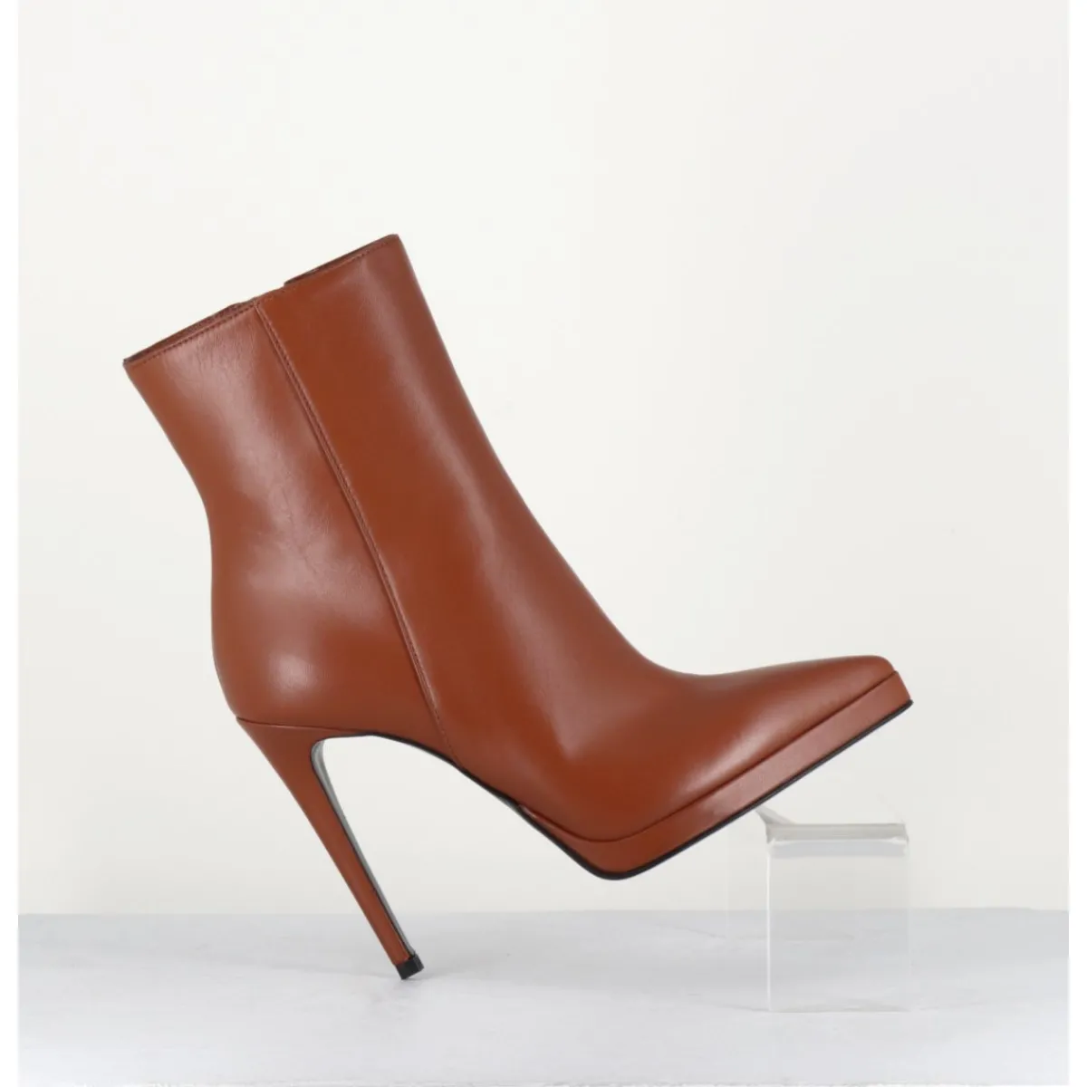 Boots bout pointu en cuir camel, montés sur un fin talon haut et une petite plateforme