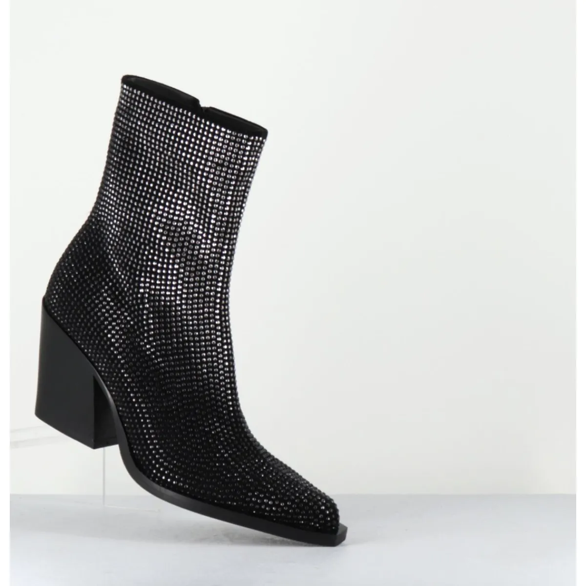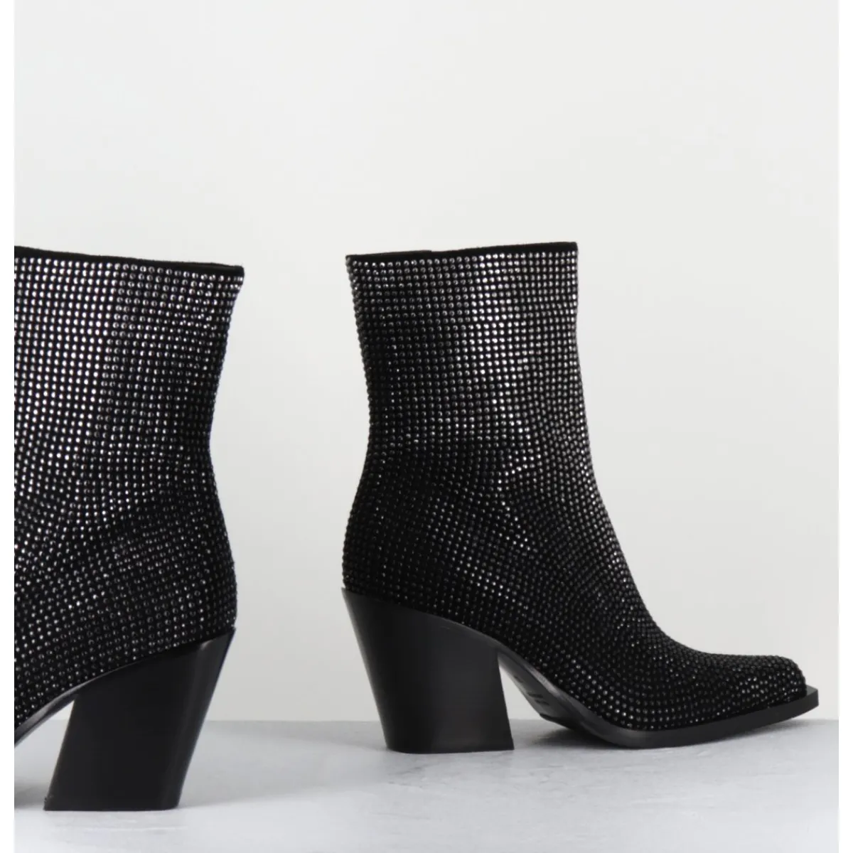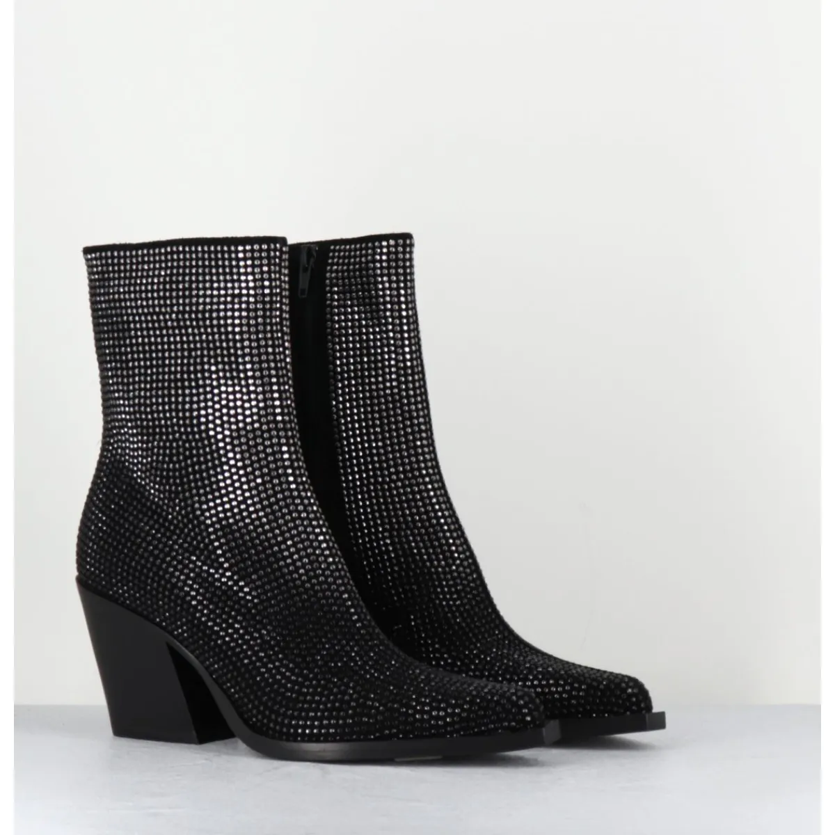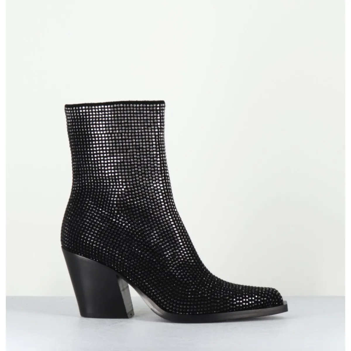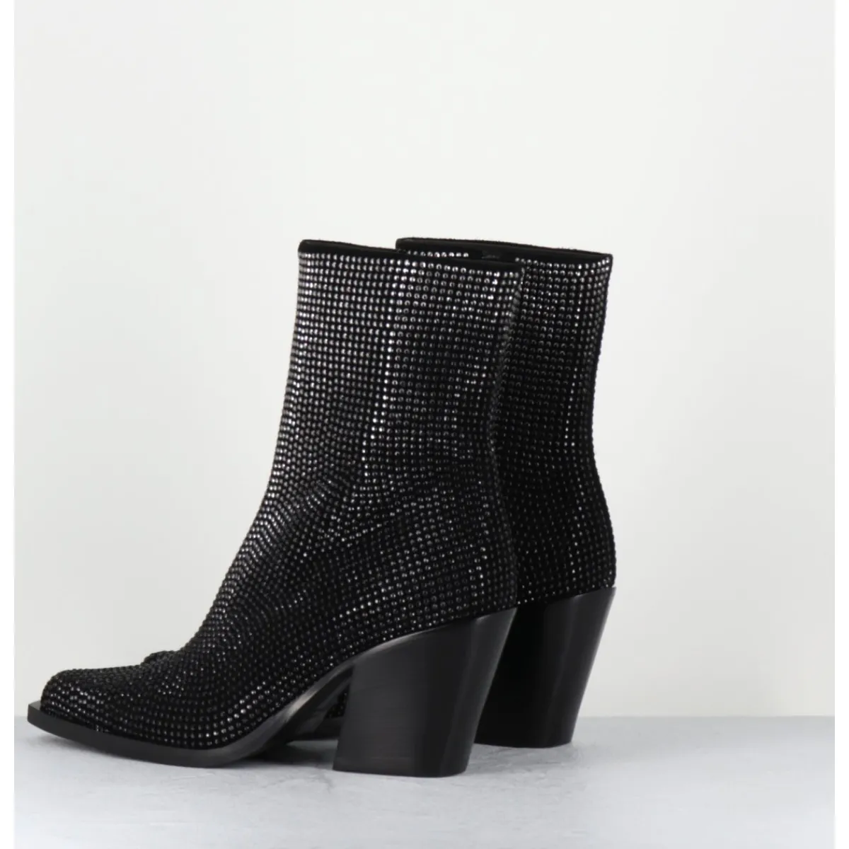 Boots Santiags en daim noir souple ornées de clous argent & patiné dse noir, ligne pure à bout pointu avec petite pointe carré, zip intérieur, montées sur un talon haut biseauté.