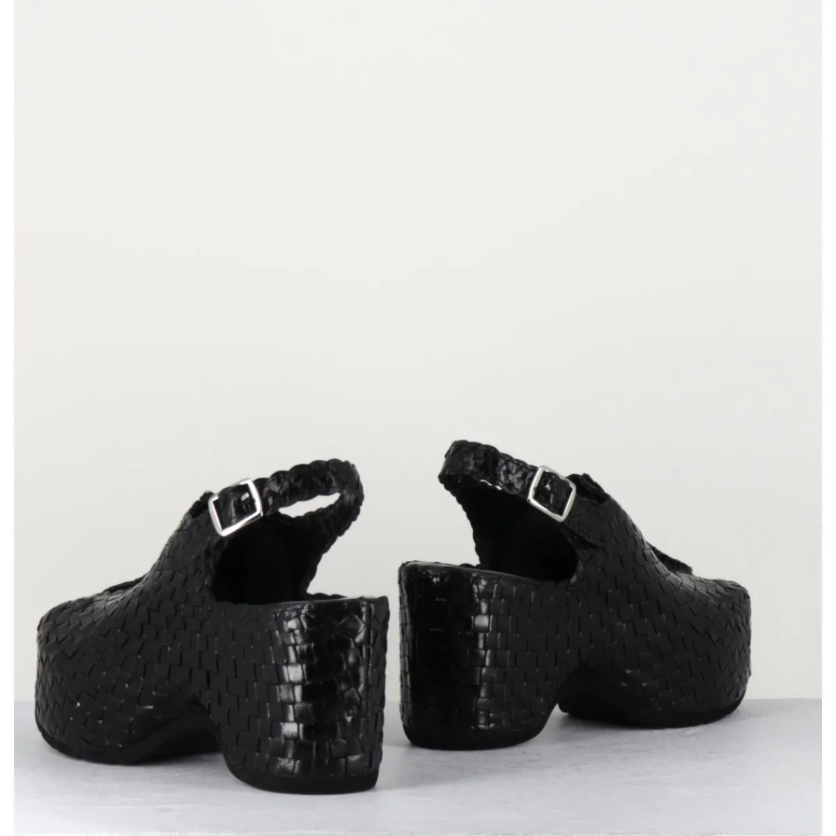 Sandales en cuir noir tressé, bout arrondi ouvert, bride arrière à boucle réglable, montées sur une semelle compensée ultra légère à talon large esprit 70s