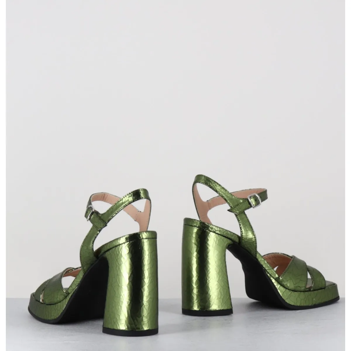 Sandales à plateforme en cuir effet craquelé vert, bout carré doux, ligne pure, montées sur un talon large stylisé confortable