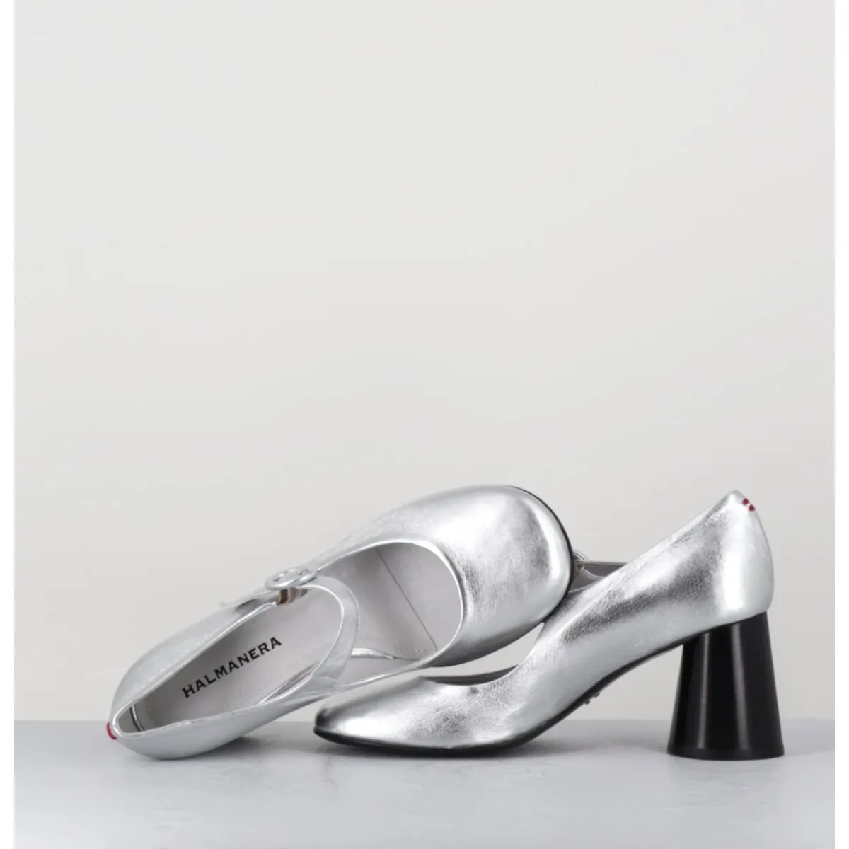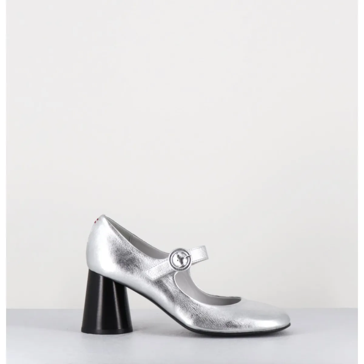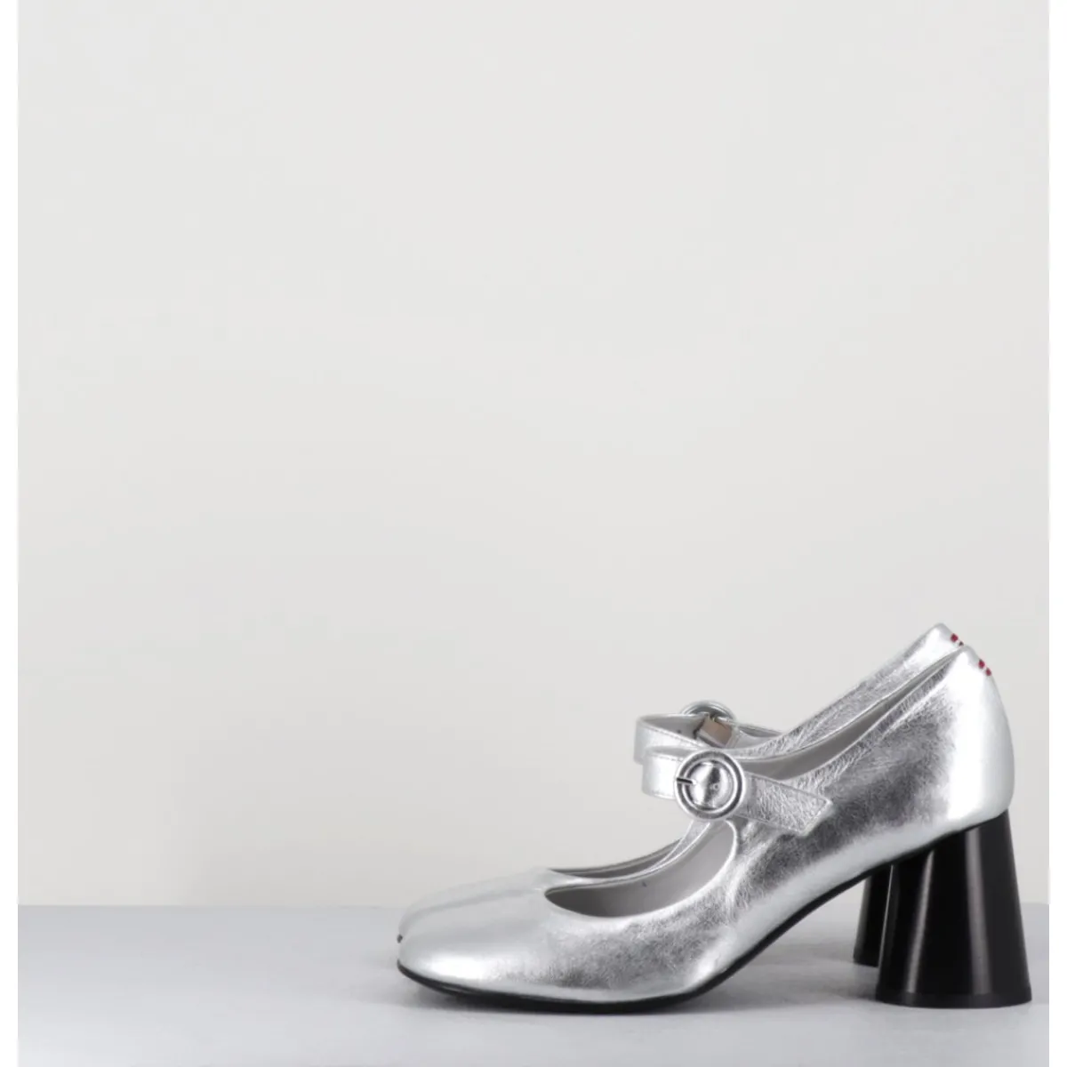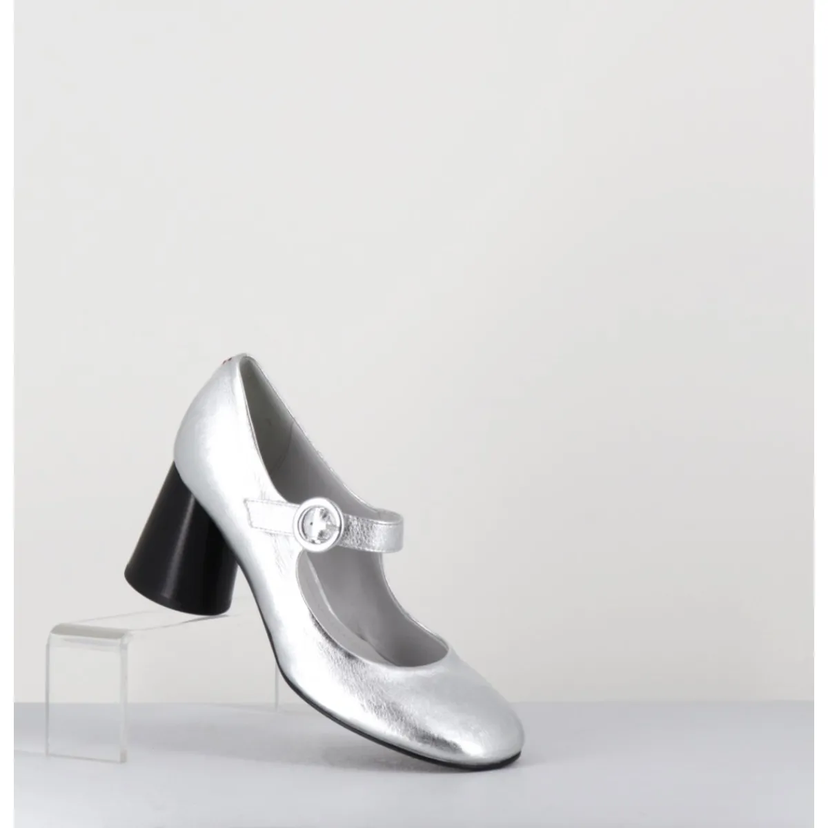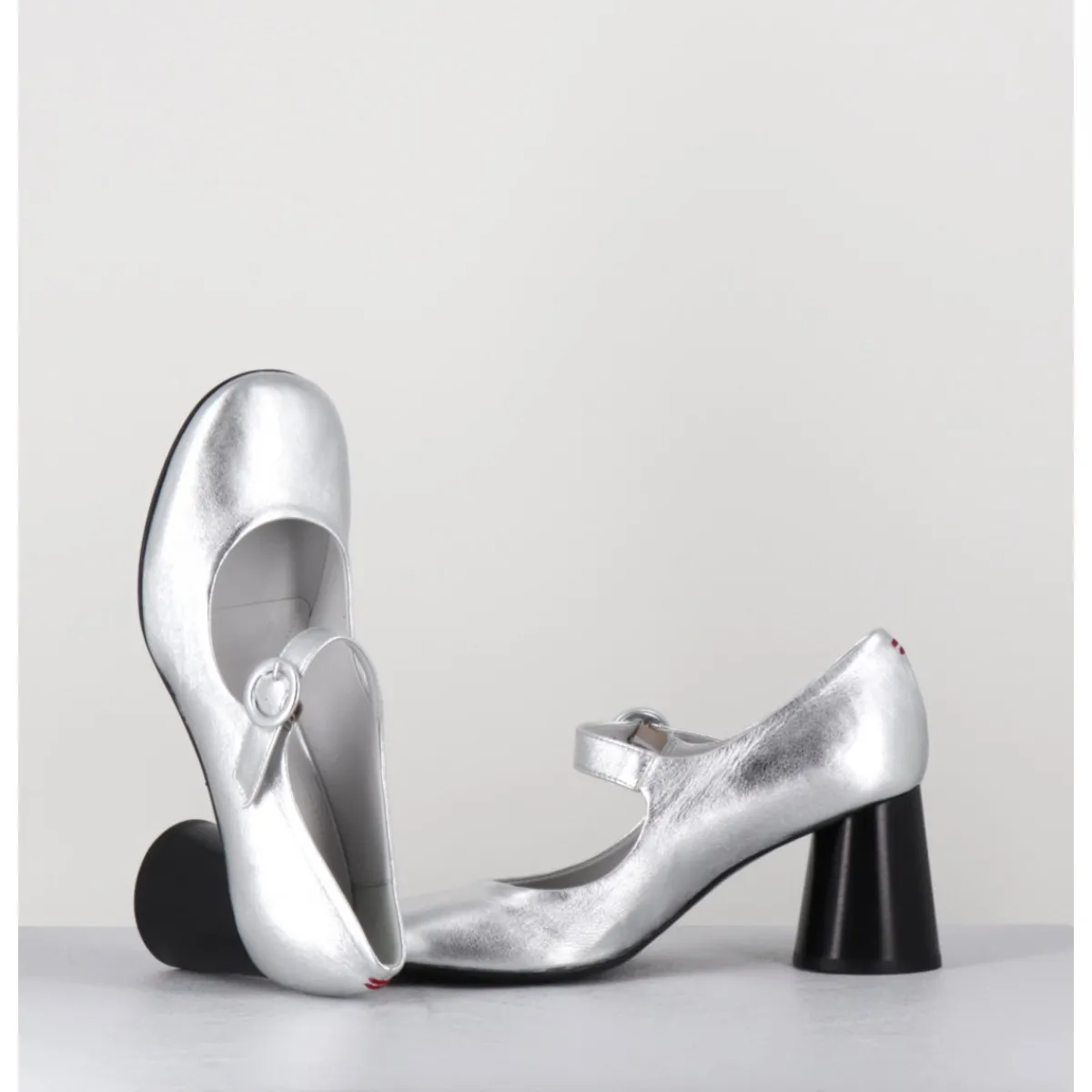 Babies à talon en cuir souple métallisé argent, bout très rond, bride cheville réglable, couture signature de la maison sur le contrefort, montés sur un talon cylindrique évasé peint à la main en noir.
