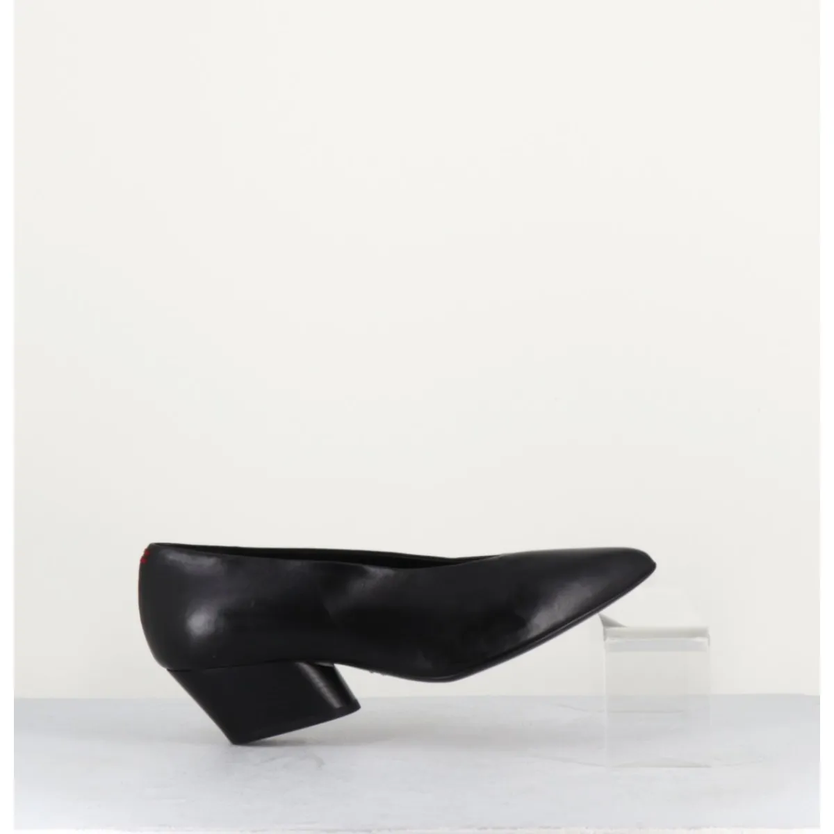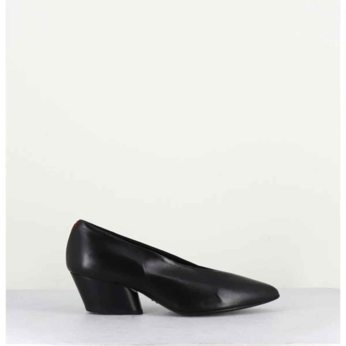 Escarpins en cuir noir très souple, bout pointu, découpe en V, montés sur un petit talon en cuir peint à la main.