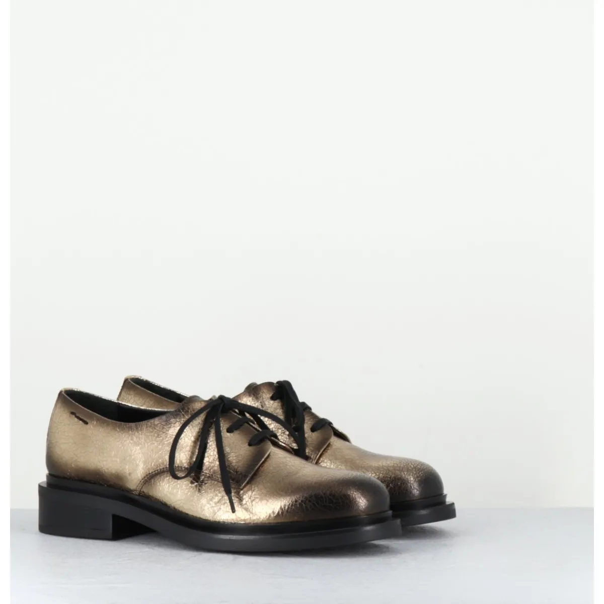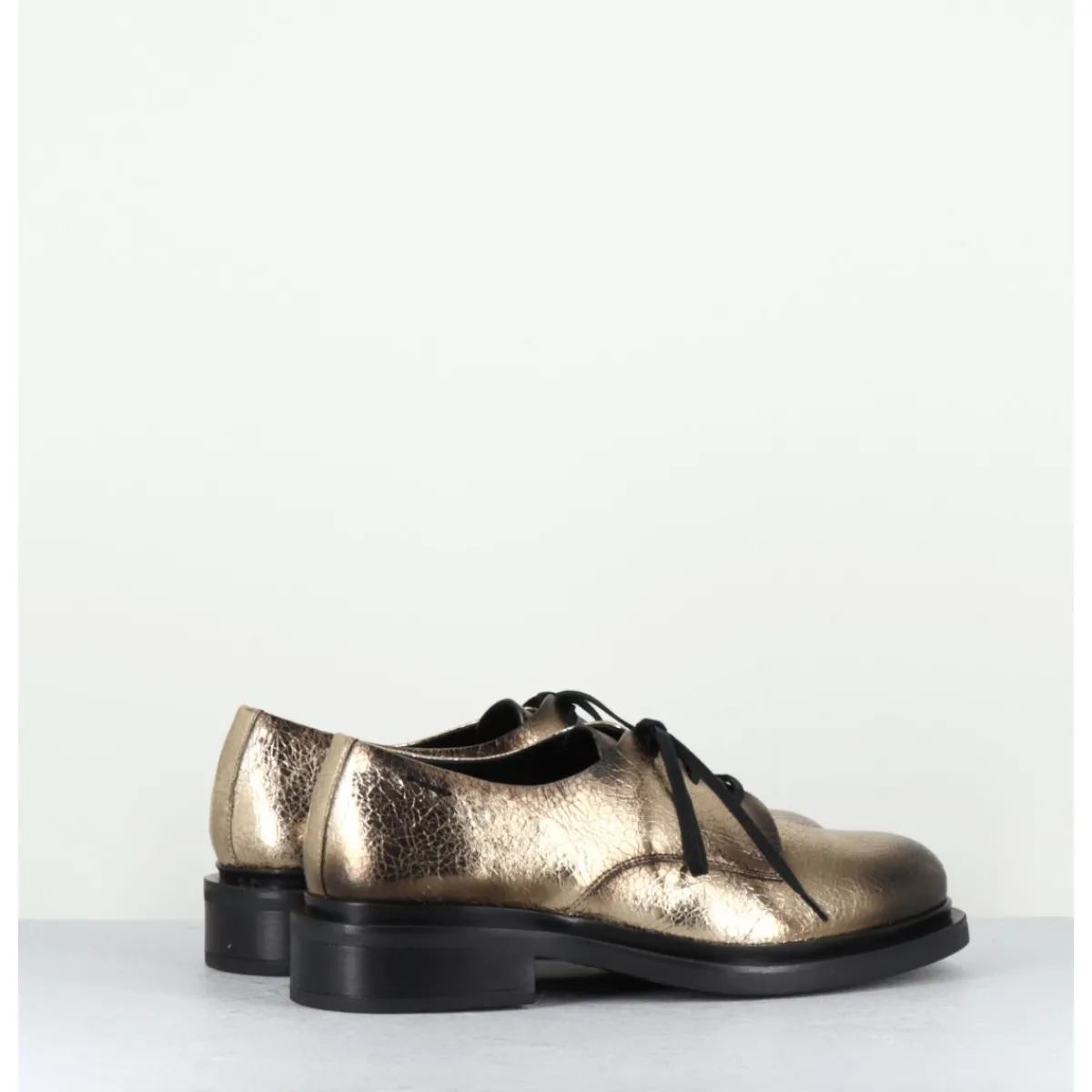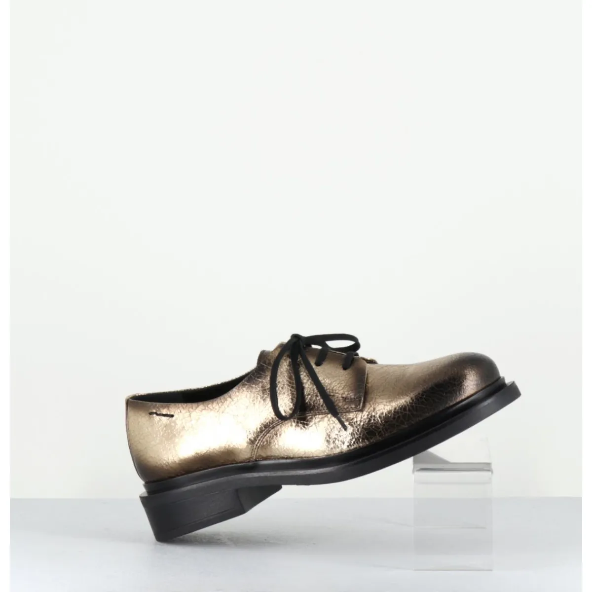 Derbies en cuir craquelé doré, bout arrondi, cuir patiné à la main pour un effet vintage donnant des reflets plus foncés
