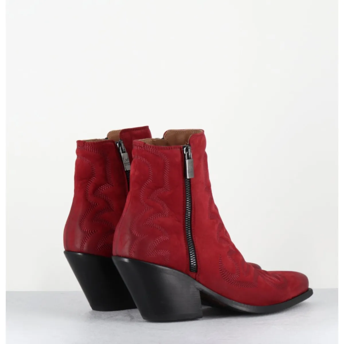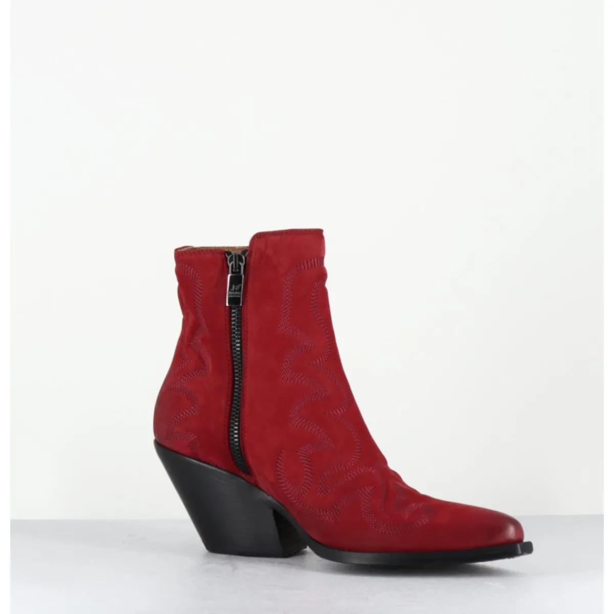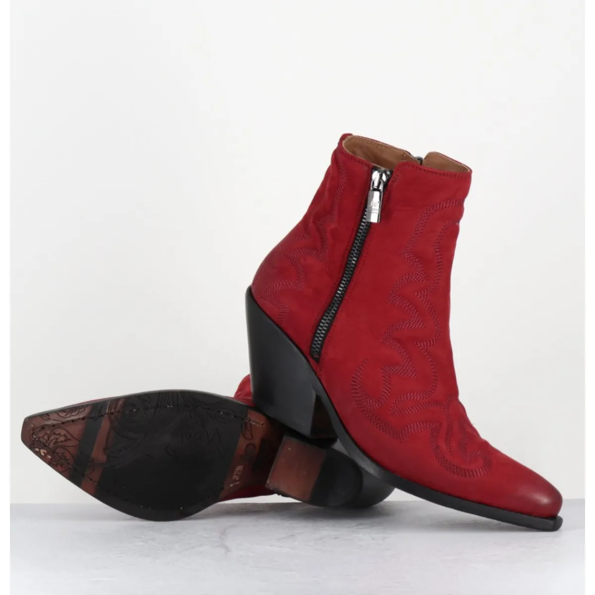 Boots santiags en daim rouge, ornées de surpiqures traditionnelles ton sur ton, double zip, montées sur un talon biseauté