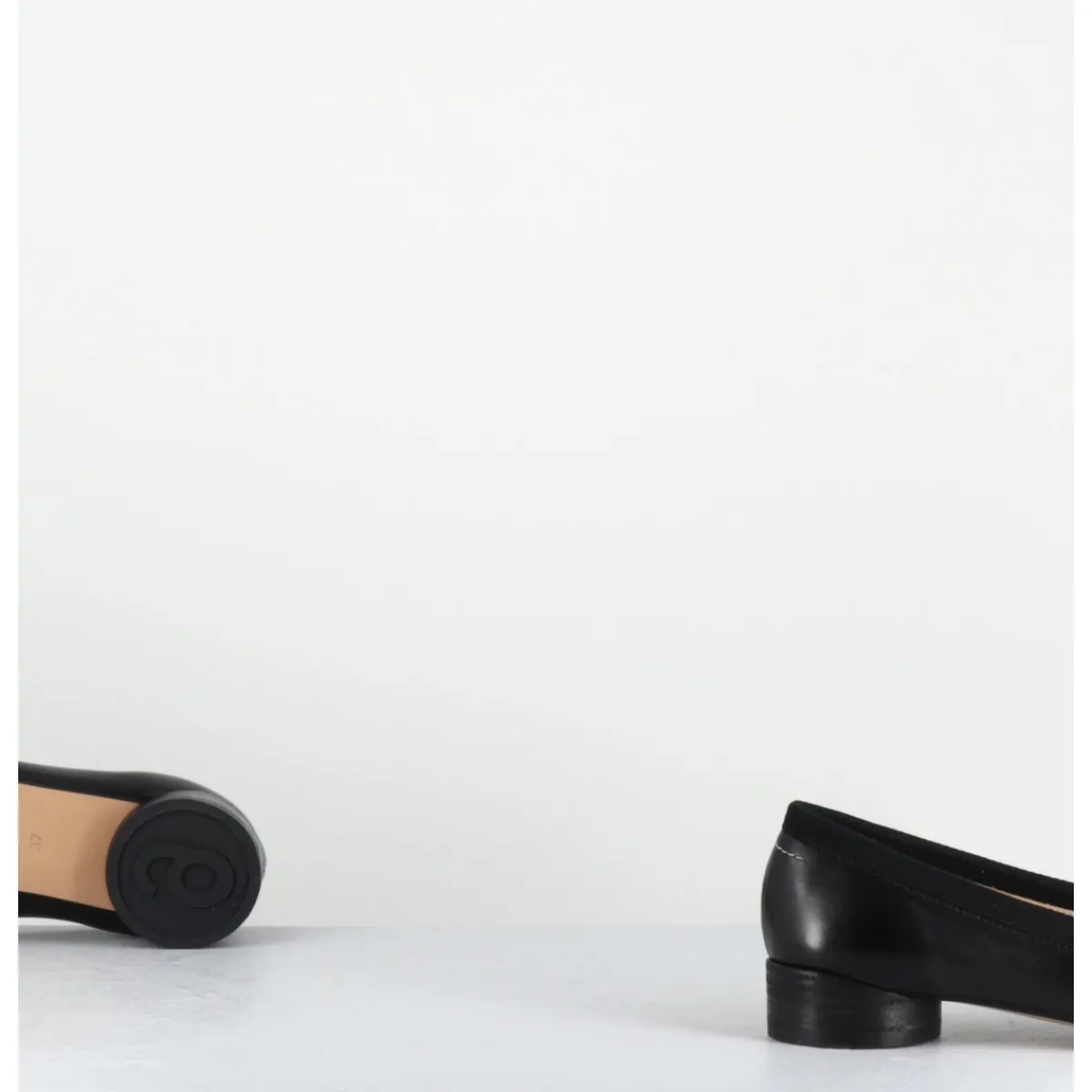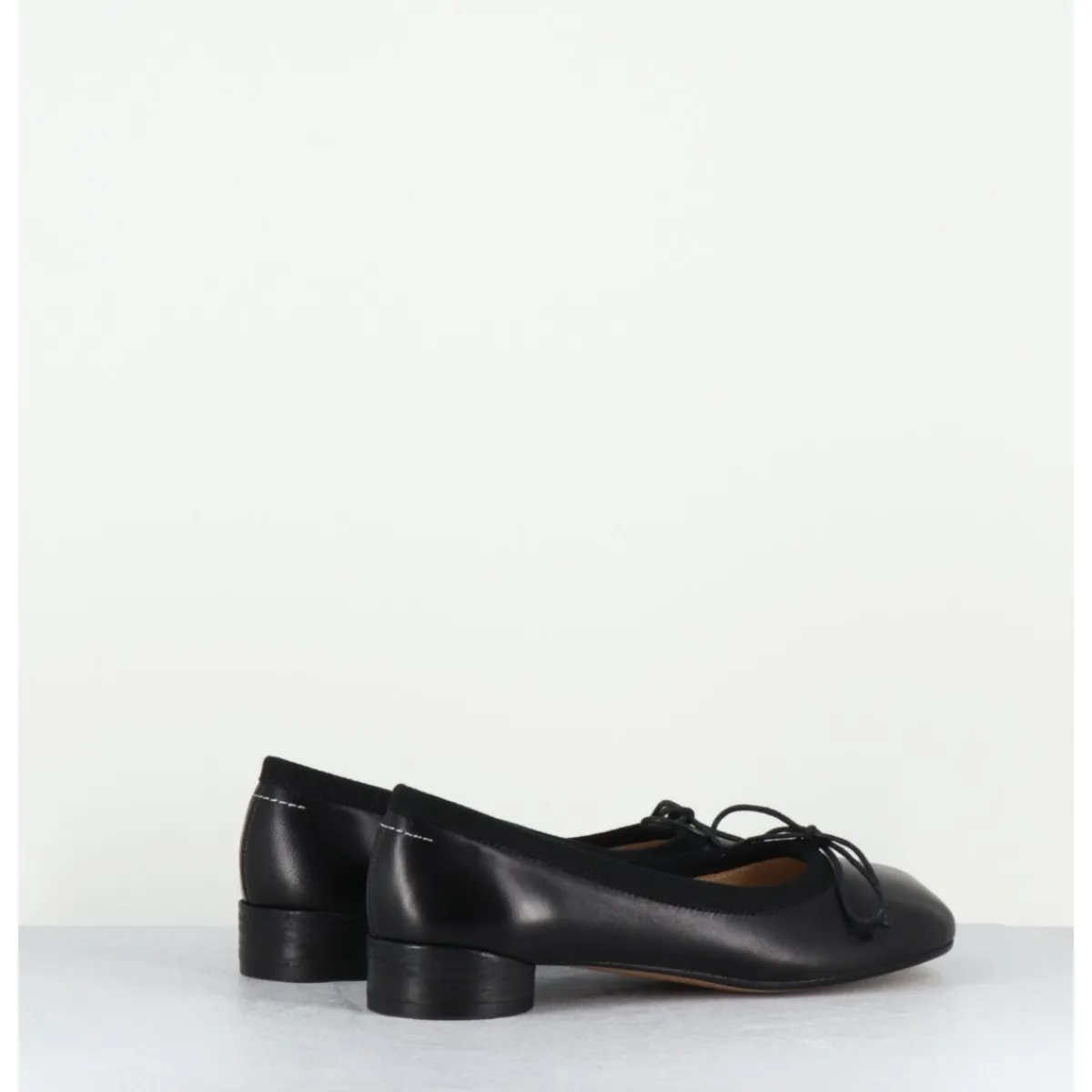 Ballerines look minimaliste en cuir noir souple, dotées d’un petit talon géométrique en pvc avec logo 6 imprimé sur la base. Ces chaussures arborent un bout anatomique, hommage au modèle iconique Tabi et un détail en forme de nœud, le tout complété à l’arrière de la célèbre surpiqûre horizontale de la Maison.