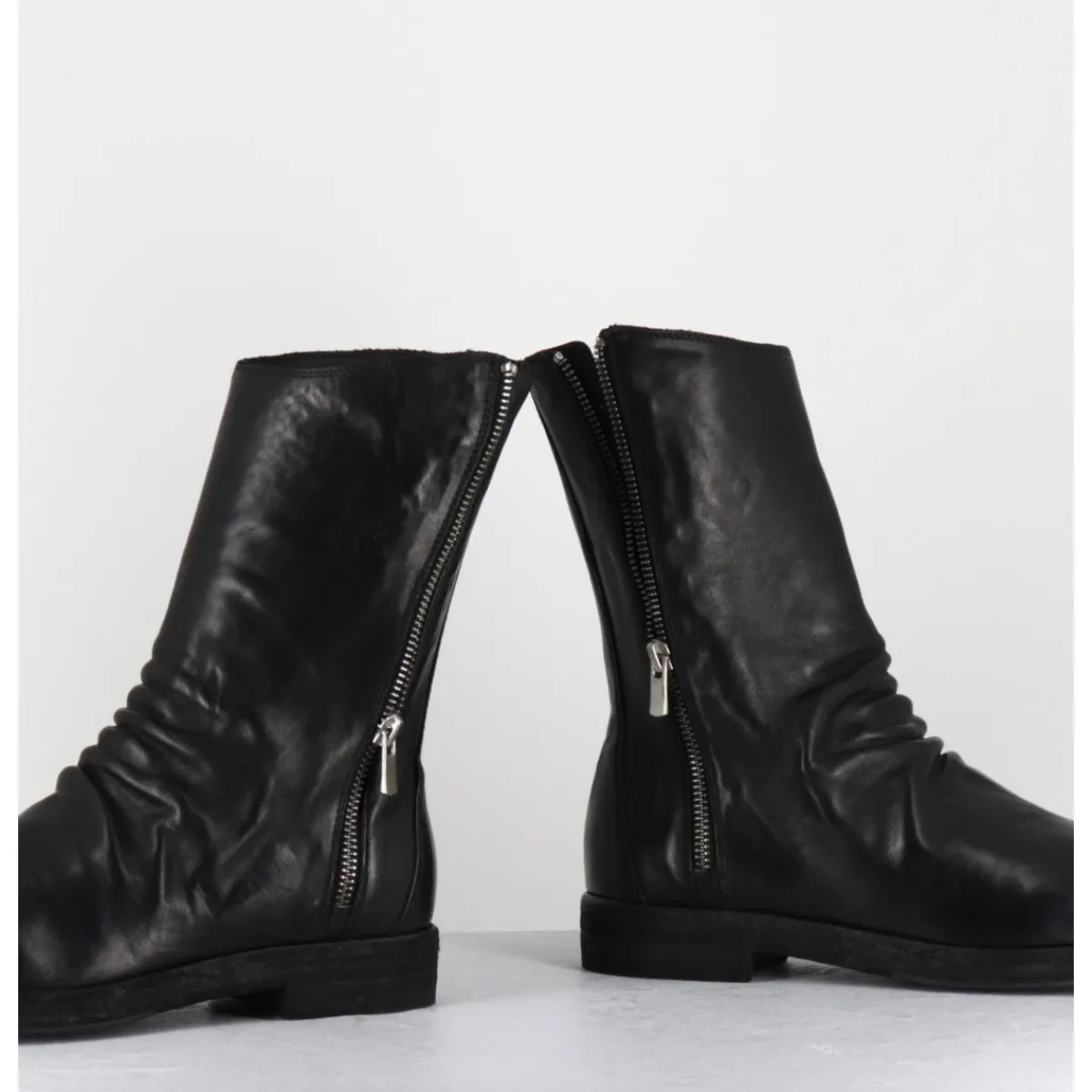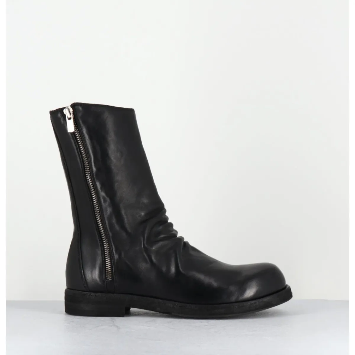 Boots en cuir noir cousue d’une seule pièce à l’avant, deep-dyed et lavé à la main pour un effet ‘vintage’, ligne pure à bout arrondi esprit Avant-Garde, zip asymétrique, montées sur une double semelle en cuir cousue avec un insert de gomme