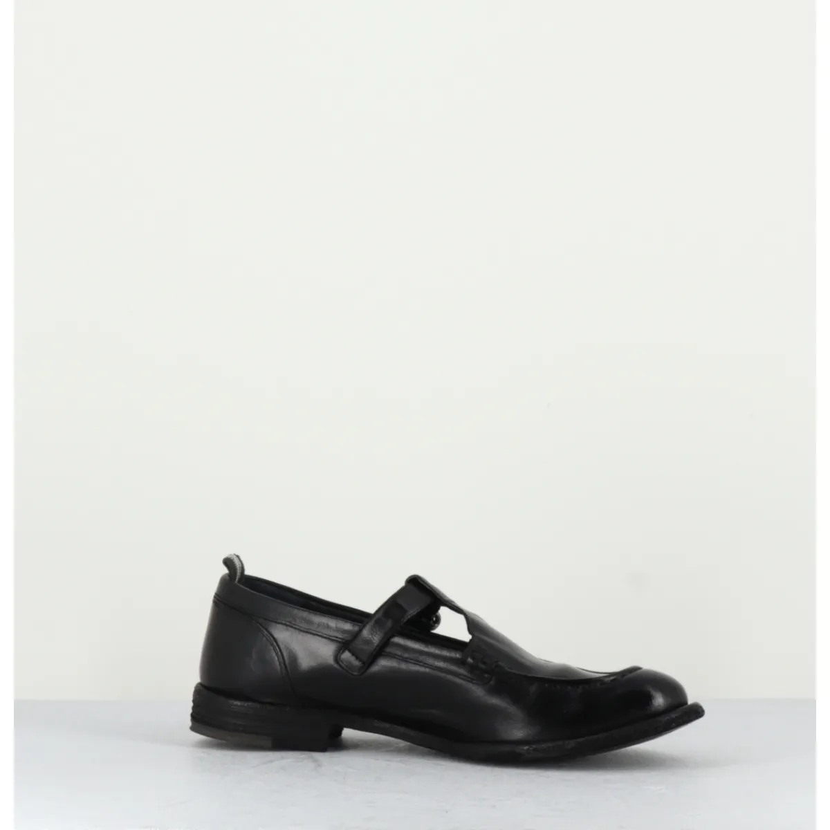 Black leather Mary-Jane shoes with adjustable silver buckle, almond toe, mounted on a flexible hand-sewn sole with gum insert.