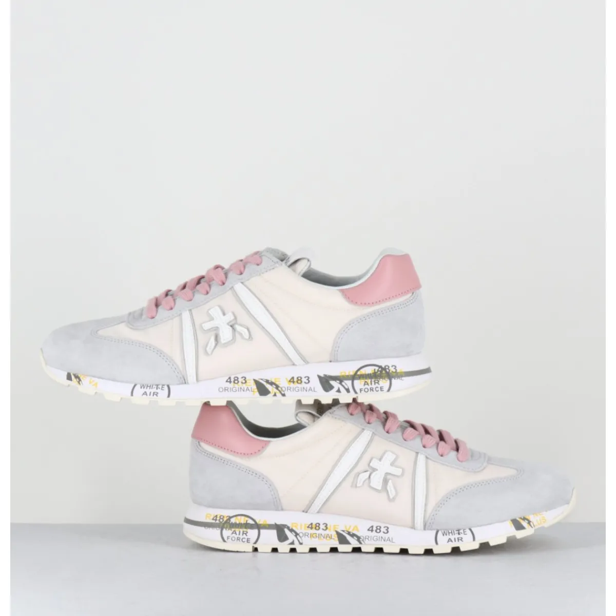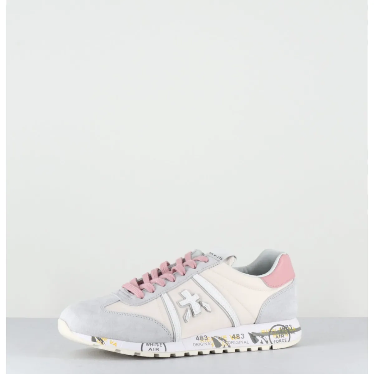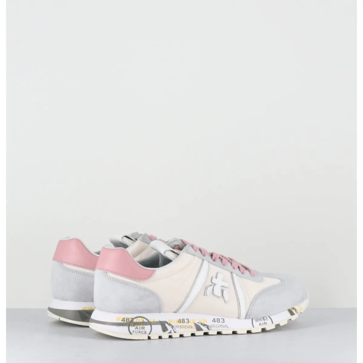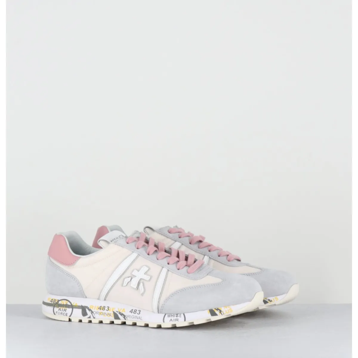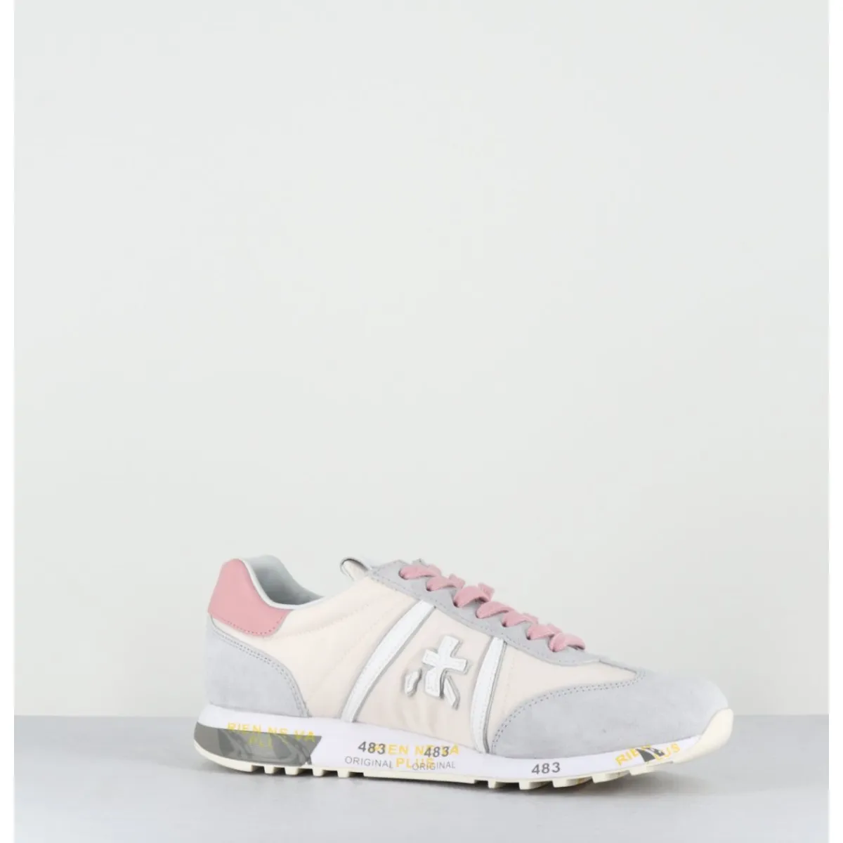 Baskets daim gris et toile technique beige avec détails de cuir blanc et lacets roses, montées sur une semelle légère, avec imprimé signature de la Maison Italienne Premiata