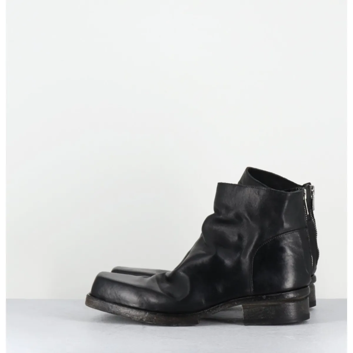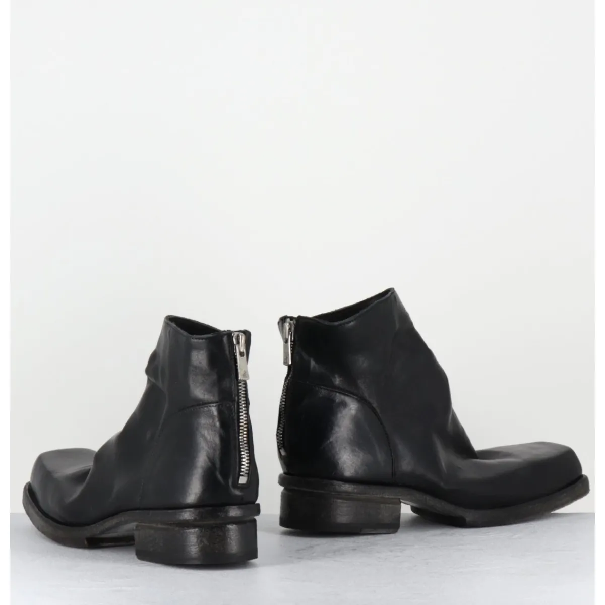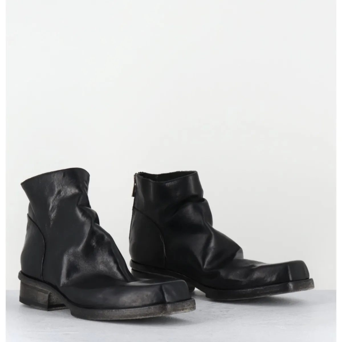 Boots en cuir noir en partie non doublé, lavé à la main pour un effet vintage « usé », zip arrière, ligne pure brutaliste à bout carré, tige courte, montées sur une double semelle en cuir cousue intégral et un petit talon bloc confortable