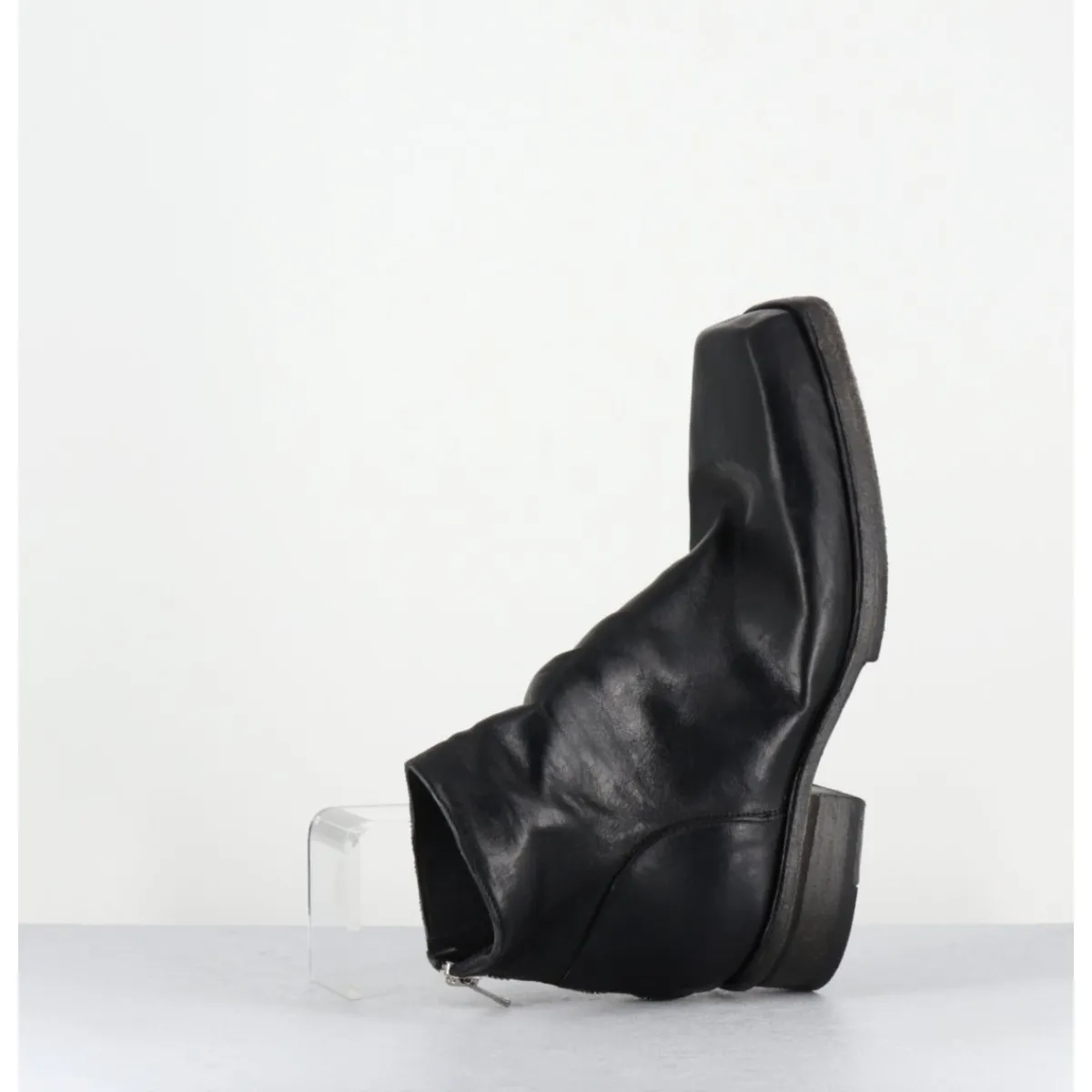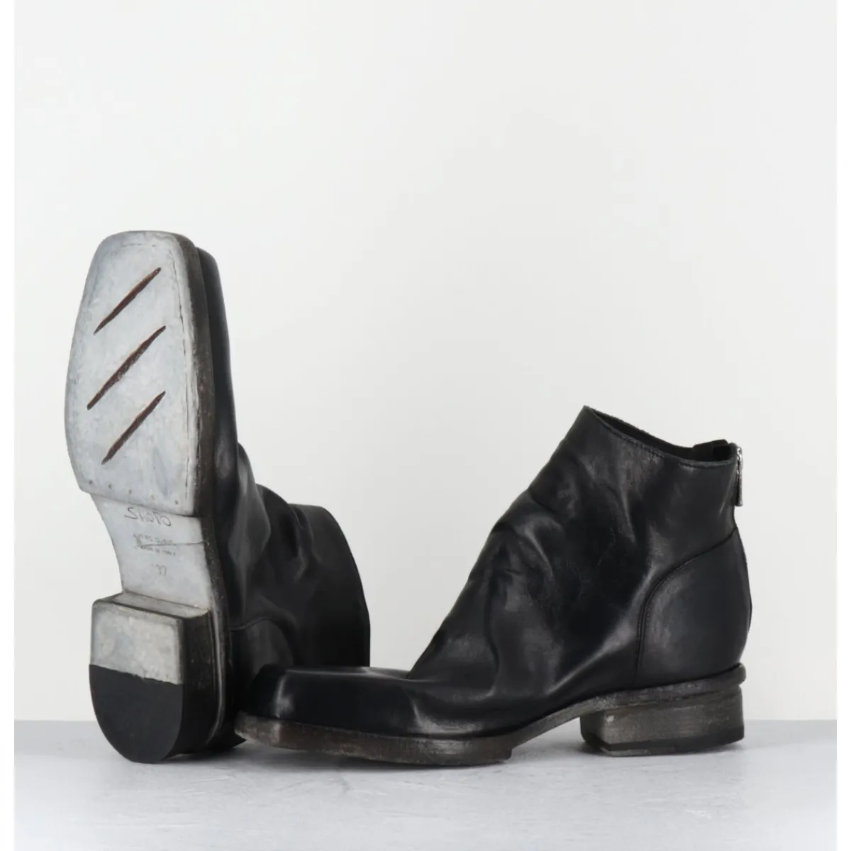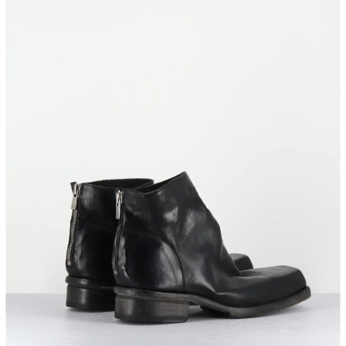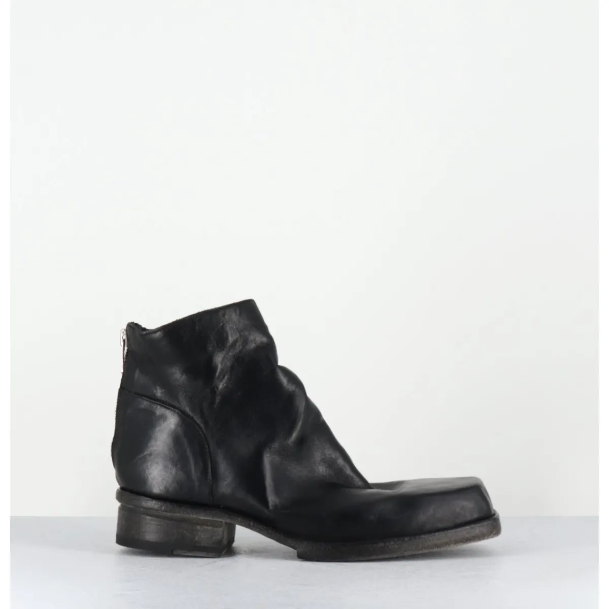 Boots en cuir noir en partie non doublé, lavé à la main pour un effet vintage « usé », zip arrière, ligne pure brutaliste à bout carré, tige courte, montées sur une double semelle en cuir cousue intégral et un petit talon bloc confortable