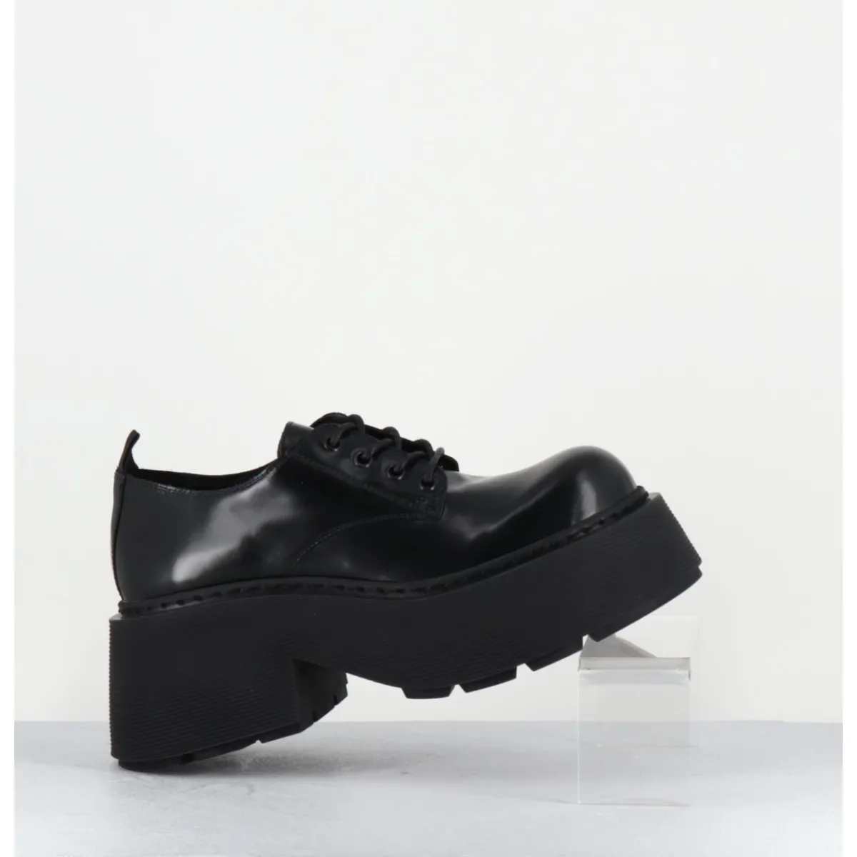 Derbies à lacets en cuir glacé noir légèrement fumé, forme ronde exagérée, montées sur une semelle épaisse bloc striée