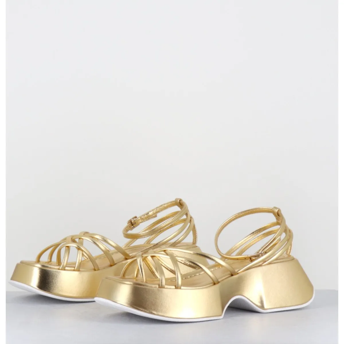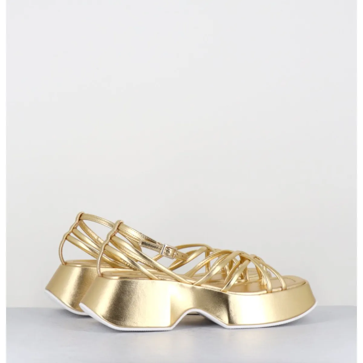 Sandales compensées en cuir métallisé doré multi-brides & entre-doigts, montées sur une plateforme stylisée en micro fibre ultra légère recouverte